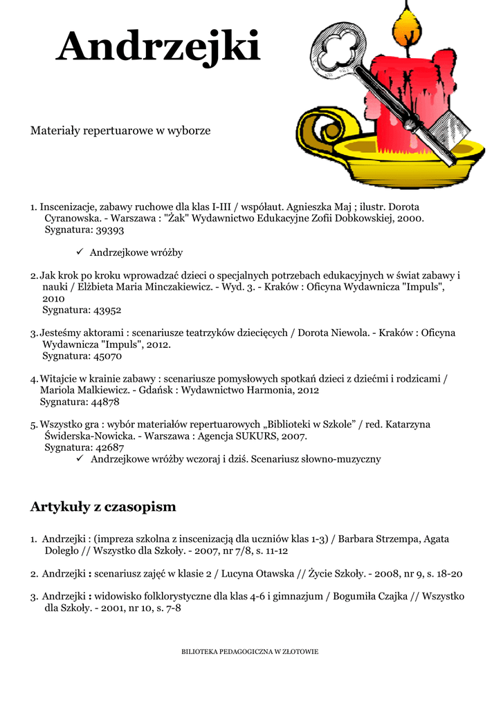 Andrzejki Materiały repertuarowe w wyborze 1. Inscenizacje, zabawy ruchowe dla klas I-III / współaut. Agnieszka Maj ; ilustr. Dorota Cyranowska. - Warszawa : "Żak" Wydawnictwo Edukacyjne Zofii Dobkowskiej, 2000. Sygnatura: 39393 Andrzejkowe wróżby 2. Jak krok po kroku wprowadzać dzieci o specjalnych potrzebach edukacyjnych w świat zabawy i nauki / Elżbieta Maria Minczakiewicz. - Wyd. 3. - Kraków : Oficyna Wydawnicza "Impuls", 2010 Sygnatura: 43952 3. Jesteśmy aktorami : scenariusze teatrzyków dziecięcych / Dorota Niewola. - Kraków : Oficyna Wydawnicza "Impuls", 2012. Sygnatura: 45070 4. Witajcie w krainie zabawy : scenariusze pomysłowych spotkań dzieci z dziećmi i rodzicami / Mariola Malkiewicz. - Gdańsk : Wydawnictwo Harmonia, 2012 Sygnatura: 44878 5. Wszystko gra : wybór materiałów repertuarowych „Biblioteki w Szkole” / red. Katarzyna Świderska-Nowicka. - Warszawa : Agencja SUKURS, 2007. Sygnatura: 42687 Andrzejkowe wróżby wczoraj i dziś. Scenariusz słowno-muzyczny Artykuły z czasopism 1. Andrzejki : (impreza szkolna z inscenizacją dla uczniów klas 1-3) / Barbara Strzempa, Agata Doległo // Wszystko dla Szkoły. - 2007, nr 7/8, s. 11-12 2. Andrzejki : scenariusz zajęć w klasie 2 / Lucyna Otawska // Życie Szkoły. - 2008, nr 9, s. 18-20 3. Andrzejki : widowisko folklorystyczne dla klas 4-6 i gimnazjum / Bogumiła Czajka // Wszystko dla Szkoły. - 2001, nr 10, s. 7-8 BILIOTEKA PEDAGOGICZNA W ZŁOTOWIE 4. Andrzejki w bibliotece / Urszula Niewczas // Poradnik Bibliotekarza. - 2002, nr 11, s. 29-30 5. Andrzejki w szkole : scenariusz zajęć dla klas 0-3 / Dagmara Salamon // Wszystko Dla Szkoły. 2008, nr 7/8, s. 13-14 6. Andrzejki w szkole [propozycje zabaw] / Salomon Dagmara. // Wszystko dla Szk. - 2009 nr 7-8 s. 5-6 7. Andrzejkowa krzyżówka / Anna Walerjańczyk // BIBLIOTEKA W SZKOLE . - 2010, nr 10, s. 24 8. Andrzejkowe czary-mary [zabawy andrzejkowe] / Renata. Kostkiewicz // Wychow. w Przedszk. - 2009 nr 10 s. 32-33 9. Andrzejkowe obrzędy / Ewa Kubiak // Poradnik Bibliotekarza. - 2002, nr 11, s. 28-29 10. Andrzejkowe wróżby / Anna Magdalena Glinka // Życie Szkoły. - 2002, nr 9, s. 539-541 11. Andrzejkowe wróżby / Marlena Szeląg // Wychowanie w Przedszkolu. - 2012, nr 10, s. 30-33 12. Andrzejkowe wróżby / Urszula Parnicka // Edukacja i Dialog. - 2002, nr 6, s. 27-30 13. Andrzejkowe wróżby : scenariusz uroczystości dla wszystkich grup przedszkolnych / Urszula Nadolna, Bożena Stącel-Winiarska // Bliżej Przedszkola. - 2012, nr 10, s. 50-51 14. Andrzejkowe wróżby wczoraj i dziś : scenariusz słowno-muzyczny dla szkół średnich / Barbara Wanda Jachimczak // Biblioteka w Szkole. - 2003, nr 9, s. 31-32 15. Andrzejkowy wieczór: scenariusz zajęć otwartych dla rodziców i nauczycieli kontraktowych z udziałem uczniów kl. I szkoły podstawowej i kl. II gimnazjum/ Gawryś Jolanta, Kutrybała Lidia. // Bibl. w Szk. - 2001 nr 10 s. 24-26 16. Czarodziejskie klucze / Iwona Orzechowska, Agnieszka Wołek // Wychowanie w Przedszkolu. 2005, nr 9, s. 43-45 17. Czary - mary, wosku lanie... / Irena Budzyńska // Wychowanie w Przedszkolu. - 2006, nr 10, s. 50-51 18. Spotkanie andrzejkowe / Justyna Gąsowska // Bliżej Przedszkola - 2014, nr 10, s. 50-53 19. Szkolny wieczór andrzejkowy / Beata Rechnio, Elżbieta Dąbrowska // Wszystko dla Szkoły 2009, nr 7/8, s. 7-8 20. Św. Andrzeju daj znać co mnie czeka! : konspekt lekcji / Elżbieta Dawidowicz // Biblioteka w Szkole. - 2001, nr 10, s. 14-17 21. Turniej andrzejkowy : środowiskowa impreza integracyjna dla dzieci szkół podstawowych / Cecylia Grzybowska // Wychowawca. - 2007, nr 11, s. 30 22. Wieczór andrzejkowy : scenariusz imprezy klasowej / Brygida Puczyńska // Wszystko Dla Szkoły. - 2002, nr 10, s.19-20 23. Wieczór andrzejkowy / Katarzyna Kowalska // ŻYCIE SZKOŁY . - 2010, nr 10, s. 44-46 BILIOTEKA PEDAGOGICZNA W ZŁOTOWIE 24.Wróżby na polanie / Franciszek Kobryńczuk // Wychowanie w Przedszkolu. - 2005,nr 9, s. 3740 25. Zabawa andrzejkowa dla najmłodszych / Małgorzata Szczygielska // Wszystko dla Szkoły - 2004, nr 10, s. 17-1 Opracowała: Anna Dagmara Pozierak 2015 r. BILIOTEKA PEDAGOGICZNA W ZŁOTOWIE