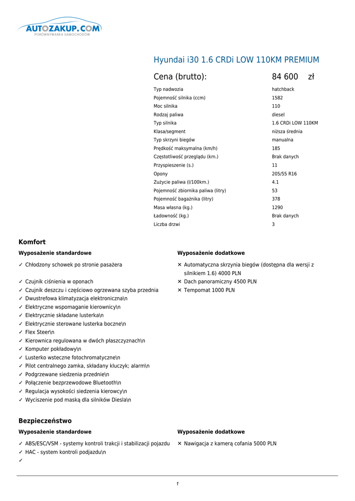 Hyundai i30 1.6 CRDi LOW 110KM PREMIUM Cena (brutto): 84 600 zł Typ nadwozia hatchback Pojemność silnika (ccm) 1582 Moc silnika 110 Rodzaj paliwa diesel Typ silnika 1.6 CRDi LOW 110KM Klasa/segment niższa średnia Typ skrzyni biegów manualna Prędkość maksymalna (km/h) 185 Częstotliwość przeglądu (km.) Brak danych Przyspieszenie (s.) 11 Opony 205/55 R16 Zużycie paliwa (l/100km.) 4.1 Pojemność zbiornika paliwa (litry) 53 Pojemność bagażnika (litry) 378 Masa własna (kg.) 1290 Ładowność (kg.) Brak danych Liczba drzwi 3 Komfort Wyposażenie standardowe Wyposażenie dodatkowe ✓ Chłodzony schowek po stronie pasażera ✕ Automatyczna skrzynia biegów (dostępna dla wersji z silnikiem 1.6) 4000 PLN ✓ Czujnik ciśnienia w oponach ✕ Dach panoramiczny 4500 PLN ✓ Czujnik deszczu i częściowo ogrzewana szyba przednia ✕ Tempomat 1000 PLN ✓ Dwustrefowa klimatyzacja elektroniczna\n ✓ Elektryczne wspomaganie kierownicy\n ✓ Elektrycznie składane lusterka\n ✓ Elektrycznie sterowane lusterka boczne\n ✓ Flex Steer\n ✓ Kierownica regulowana w dwóch płaszczyznach\n ✓ Komputer pokładowy\n ✓ Lusterko wsteczne fotochromatyczne\n ✓ Pilot centralnego zamka, składany kluczyk; alarm\n ✓ Podgrzewane siedzenia przednie\n ✓ Połączenie bezprzewodowe Bluetooth\n ✓ Regulacja wysokości siedzenia kierowcy\n ✓ Wyciszenie pod maską dla silników Diesla\n Bezpieczeństwo Wyposażenie standardowe Wyposażenie dodatkowe ✓ ABS/ESC/VSM - systemy kontroli trakcji i stabilizacji pojazdu ✕ Nawigacja z kamerą cofania 5000 PLN ✓ HAC - system kontroli podjazdu\n ✓ 1 Ilość tarcz hamulcowych 4/wentylowane 2\n 2 ✓ Pełnowymiarowe aluminiowe koło zapasowe\n ✓ Poduszka kolanowa kierowcy\n ✓ Poduszki bezpieczeństwa przednie, boczne – przednie i kurtynowe\n ✓ Przednie światła przeciwmgielne\n ✓ Sygnalizator niezapiętych pasów bezpieczeństwa\n ✓ Wszystkie szyby z funkcją bezpieczeństwa\n ✓ Wyłącznik poduszki bezpieczeństwa pasażera\n Dodatki Wyposażenie standardowe Wyposażenie dodatkowe ✓ Aluminiowe obręcze kół ✕ Lakier metalik/perłowy 1700 PLN ✓ Audio RDS/CD/MP3 ✕ Mistrzowski Pakiet Multimediów Blaupunkt New York 830 lub Clarion NX 502E (radio, DVD, nawigacja) –(opcjonalna kamera cofania 299 PLN) 2999 PLN ✓ Centralny schowek na okulary nad głową\n ✓ Dzielone oparcie tylnego siedzenia 60:40\n ✓ Elektryczne i podgrzewane lusterka boczne w kolorze nadwozia z zintegrowanymi kierunkowskazami\n ✓ Gniazdko 12V w bagażniku\n ✓ Ilość głośników: 4 głośniki + 2 tweetery\n ✓ Klamki zewnętrzne w kolorze nadwozia\n ✓ Lampki do czytania z przodu\n ✓ Materiałowe wykończenie drzwi\n ✓ Mocowanie fotelików dziecięcych\n ✓ Podświetlana stacyjka\n ✓ Podświetlone lusterko do makijażu\n ✓ Podłączenie AUX, USB\n ✓ Podłokietnik przedni ze schowkiem\n ✓ Przednie ksenonowe światła adaptacyjne\n ✓ Przednie szyby elektryczne\n ✓ Przyciemniane szyby\n ✓ Rozmiar opon i kół 205/55 R16\n ✓ Schowek pod podłogą bagażnika\n ✓ Siatka zabezpieczająca bagaż\n ✓ Skórzana kierownica i gałka zmiany biegów\n ✓ Skórzano-materiałowa tapicerka siedzeń\n ✓ Tubowa obudowa zegarów (Supervision)\n ✓ Tylne światła LED\n ✓ Uchwyt na kubek\n ✓ Wycieraczki z płaskim piórem\n ✓ Zdalne sterowanie audio na kierownicy\n Doprecyzowanie oferty ✕ Pakiet mistrzowski - 2799 PLN 3 Czujniki parkowania Dywaniki welurowe Felgi aluminiowe Skórzana kierownica i dźwignia zmiany biegów Kontakt: Nazwa użytkownika: admin Nazwa firmy: qqq Adres: qqq 12, 41-706 qqq1, NIP: 954 REGON: 1 Telefon: 123, 1 Fax: 1 Email: 1 www: 4