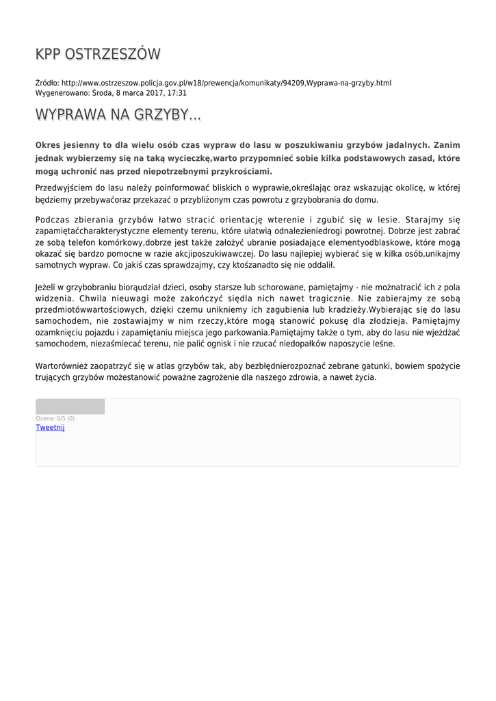 KPP OSTRZESZÓW Źródło: http://www.ostrzeszow.policja.gov.pl/w18/prewencja/komunikaty/94209,Wyprawa-na-grzyby.html Wygenerowano: Środa, 8 marca 2017, 17:31 WYPRAWA NA GRZYBY... Okres jesienny to dla wielu osób czas wypraw do lasu w poszukiwaniu grzybów jadalnych. Zanim jednak wybierzemy się na taką wycieczkę,warto przypomnieć sobie kilka podstawowych zasad, które mogą uchronić nas przed niepotrzebnymi przykrościami. Przedwyjściem do lasu należy poinformować bliskich o wyprawie,określając oraz wskazując okolicę, w której będziemy przebywaćoraz przekazać o przybliżonym czas powrotu z grzybobrania do domu. Podczas zbierania grzybów łatwo stracić orientację wterenie i zgubić się w lesie. Starajmy się zapamiętaćcharakterystyczne elementy terenu, które ułatwią odnalezieniedrogi powrotnej. Dobrze jest zabrać ze sobą telefon komórkowy,dobrze jest także założyć ubranie posiadające elementyodblaskowe, które mogą okazać się bardzo pomocne w razie akcjiposzukiwawczej. Do lasu najlepiej wybierać się w kilka osób,unikajmy samotnych wypraw. Co jakiś czas sprawdzajmy, czy ktośzanadto się nie oddalił. Jeżeli w grzybobraniu biorąudział dzieci, osoby starsze lub schorowane, pamiętajmy - nie możnatracić ich z pola widzenia. Chwila nieuwagi może zakończyć siędla nich nawet tragicznie. Nie zabierajmy ze sobą przedmiotówwartościowych, dzięki czemu unikniemy ich zagubienia lub kradzieży.Wybierając się do lasu samochodem, nie zostawiajmy w nim rzeczy,które mogą stanowić pokusę dla złodzieja. Pamiętajmy ozamknięciu pojazdu i zapamiętaniu miejsca jego parkowania.Pamiętajmy także o tym, aby do lasu nie wjeżdżać samochodem, niezaśmiecać terenu, nie palić ognisk i nie rzucać niedopałków naposzycie leśne. Wartorównież zaopatrzyć się w atlas grzybów tak, aby bezbłędnierozpoznać zebrane gatunki, bowiem spożycie trujących grzybów możestanowić poważne zagrożenie dla naszego zdrowia, a nawet życia. Ocena: 0/5 (0) Tweetnij