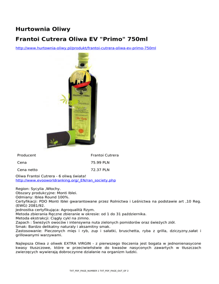 Hurtownia Oliwy Frantoi Cutrera Oliwa EV "Primo" 750ml http://www.hurtownia-oliwy.pl/produkt/frantoi-cutrera-oliwa-ev-primo-750ml Producent Frantoi Cutrera Cena 75.99 PLN Cena netto 72.37 PLN Oliwa Frantoi Cutrera - 6 oliwą świata! http://www.evooworldranking.org/_EN/ran_society.php Region: Sycylia ,Włochy. Obszary produkcyjne: Monti Iblei. Odmiany: Iblea Round 100%. Certyfikacji: PDO Monti Iblei gwarantowane przez Rolnictwa i Leśnictwa na podstawie art ,10 Reg. (EWG) 2081/92. Jednostka certyfikująca: Agroqualità Rzym. Metoda zbierania Ręczne zbieranie w okresie: od 1 do 31 października. Metoda ekstrakcji: Ciągły cykl na zimno. Zapach : Świeżych owoców i intensywna nuta zielonych pomidorów oraz świeżych ziół. Smak: Bardzo delikatny naturaly i aksamitny smak. Zastosowanie: Pieczonych mięs i ryb, zup i sałatki, bruschetta, ryba z grilla, dziczyzny,sałat i grillowanymi warzywami. Najlepsza Oliwa z oliwek EXTRA VIRGIN - z pierwszego tłoczenia jest bogata w jednonienasycone kwasy tłuszczowe, które w przeciwieństwie do kwasów nasyconych zawartych w tłuszczach zwierzęcych wywierają dobroczynne działanie na organizm ludzki. TXT_PDF_PAGE_NUMBER 1 TXT_PDF_PAGE_OUT_OF 2 Jednonienasycone kwasy tłuszczowe powodują obniżenie poziomu cholesterolu poprzez pobudzenie jelit i wątroby do produkcji HDL - lipoprotein wysokiej gęstości, które usuwają zgromadzony w naczyniach krwionośnych cholesterol LDL - lipoproteiny niskiej gęstości zmniejszając w ten sposób ryzyko chorób serca i układu krążenia. Najsłynniejszy ekspert w dziedzinie oliw – Marco Oreggia, w swoim przewodniku Guida Flos Olei uznał oliwę Primo Frantoi Cutrera jako najlepszą oliwę na świecie. Wybrał ją spośród 600 innych oliw, 40 krajów. - Italy 2010, “Flos Olei 2010” Extra Virgin Olive Oil Guide The best Extra Virgin Olive Oil of the year in the World - Italiy 2010, “Slow Food” Selection 3 Olives, Primo DOP - Italy 2010– Spoleto 2010, “Ercole Olivario” International Contest 1 st Place Intense Fruity Category, Primo DOP - Italy 2010 - Gradara 2010, “Orciolo D’Oro” 1st Place Intense Fruity Category,, Primo Bio TXT_PDF_PAGE_NUMBER 2 TXT_PDF_PAGE_OUT_OF 2