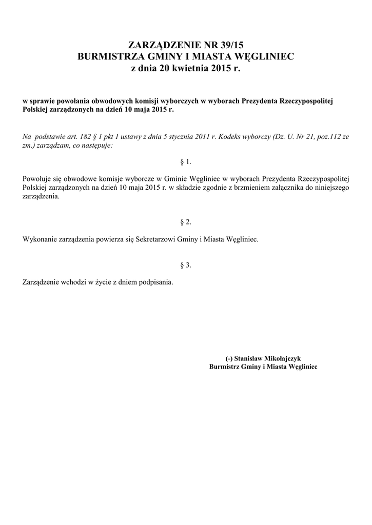 ZARZĄDZENIE NR 39/15 BURMISTRZA GMINY I MIASTA WĘGLINIEC z dnia 20 kwietnia 2015 r. w sprawie powołania obwodowych komisji wyborczych w wyborach Prezydenta Rzeczypospolitej Polskiej zarządzonych na dzień 10 maja 2015 r. Na podstawie art. 182 § 1 pkt 1 ustawy z dnia 5 stycznia 2011 r. Kodeks wyborczy (Dz. U. Nr 21, poz.112 ze zm.) zarządzam, co następuje: § 1. Powołuje się obwodowe komisje wyborcze w Gminie Węgliniec w wyborach Prezydenta Rzeczypospolitej Polskiej zarządzonych na dzień 10 maja 2015 r. w składzie zgodnie z brzmieniem załącznika do niniejszego zarządzenia. § 2. Wykonanie zarządzenia powierza się Sekretarzowi Gminy i Miasta Węgliniec. § 3. Zarządzenie wchodzi w życie z dniem podpisania. (-) Stanisław Mikołajczyk Burmistrz Gminy i Miasta Węgliniec Załącznik do Zarządzenia nr 39/15 Burmistrza Gminy i Miasta Węgliniec z dnia 20 kwietnia 2015 r. Składy obwodowych komisji wyborczych w gm. Węgliniec Nr obw. L.p. 1 2 3 1 4 5 6 7 8 Nr obw. L.p. 1 2 3 2 4 5 6 7 Nr obw. Barbara Maria Cioch Małgorzata Renata Pietrzak Stanisława Elżbieta Basarab Jerzy Bajorek Grażyna Elżbieta Wielewis Michał Jerzy Frelich Szymon Mikołajczyk Barbara Kania Imię imiona i nazwisko Anna Maria Wieczorek Stanisława Piotrowska Renata Barbara Markowska Stefan Strugalski Agnieszka Łaniucha Marta Katarzyna Frelich Krystyna Jurczak L.p. Imię imiona i nazwisko 1 Antoni Popielewicz 2 3 3 Imię imiona i nazwisko 4 Norbert Marcin Podlewski Katarzyna Julia Podkalicka Wanda Anna Tłuszcz 5 Tadeusz Michaluk 6 Zbigniew Kaźmirak 7 Teresa Roćko Komitet wyborczy K.W. Kandydata na Prezydenta Rzeczypospolitej Polskiej Andrzeja Dudy Miejsce zam. Czerwona Woda K.W. Kandydata na Prezydenta Rzeczypospolitej Polskiej Grzegorza Michała Brauna Węgliniec K.W. Kandydata na Prezydenta Rzeczypospolitej Polskiej Adama Jarubasa K.W. Kandydata na Prezydenta Rzeczypospolitej Polskiej Magdaleny Ogórek Węgliniec K.W. Kandydata na Prezydenta Rzeczypospolitej Polskiej Janusza Palikota Węgliniec K.W. Kandydata na Prezydenta Rzeczypospolitej Polskiej Bronisława Komorowskiego Węgliniec K.W. Kandydata na Prezydenta Rzeczypospolitej Polskiej Janusza Korwin-Mikke Art. 182 § 2 pkt.2) Kodeks Wyborczy Jagodzin Komitet wyborczy Węgliniec Miejsce zam. K.W. Kandydata na Prezydenta Rzeczypospolitej Polskiej Andrzeja Dudy Węgliniec K.W. Kandydata na Prezydenta Rzeczypospolitej Polskiej Grzegorza Michała Brauna Zielonka K.W. Kandydata na Prezydenta Rzeczypospolitej Polskiej Adama Jarubasa K.W. Kandydata na Prezydenta Rzeczypospolitej Polskiej Magdaleny Ogórek Węgliniec K.W. Kandydata na Prezydenta Rzeczypospolitej Polskiej Janusza Palikota Węgliniec K.W. Kandydata na Prezydenta Rzeczypospolitej Polskiej Bronisława Komorowskiego Art. 182 § 2 pkt.2) Kodeks Wyborczy Węgliniec Komitet wyborczy Węgliniec Miejsce zam. K.W. Kandydata na Prezydenta Rzeczypospolitej Polskiej Andrzeja Dudy Węgliniec K.W. Kandydata na Prezydenta Rzeczypospolitej Polskiej Grzegorza Michała Brauna Zielonka K.W. Kandydata na Prezydenta Rzeczypospolitej Polskiej Adama Jarubasa Węgliniec K.W. Kandydata na Prezydenta Rzeczypospolitej Polskiej Magdaleny Ogórek K.W. Kandydata na Prezydenta Rzeczypospolitej Polskiej Janusza Palikota K.W. Kandydata na Prezydenta Rzeczypospolitej Polskiej Bronisława Komorowskiego Art. 182 § 2 pkt.2) Kodeks Wyborczy Czerwona Woda Węgliniec Czerwona Woda Siedziba Obwodowej Komisji Wyborczej Obwodowa Komisja Wyborcza nr 1 w Węglińcu Węglinieckie Centrum Kultury ul. Plac Wolności 1 59-940 Węgliniec Siedziba Obwodowej Komisji Wyborczej Obwodowa Komisja Wyborcza nr 2 w Węglińcu Węglinieckie Centrum Kultury ul. Plac Wolności 1 59-940 Węgliniec Siedziba Obwodowej Komisji Wyborczej Obwodowa Komisja Wyborcza nr 3 w Zielonce Klub „Relax” Zielonka 59-940 Węgliniec Nr obw. L.p. 1 2 3 4 4 5 6 7 Nr obw. L.p. Barbara Monika Bajorek Jarosław Ryszard Banecki Elżbieta Zofia Kaźmirak Popielewicz Anna Imię imiona i nazwisko L.p. Imię imiona i nazwisko 3 4 5 6 1 2 3 6 Maria Kusarek 7 2 Nr obw. Tomasz Popielewicz Aneta Krystyna Pietrzak Grzegorz Popielewicz Danuta Kędzierewicz Joanna Katarzyna Buczkowska Agnieszka Beata Olbert Monika Agnieszka Mazur Justyna Anna Glonek Beata Bogacz 1 5 Imię imiona i nazwisko Grażyna Iwona Perońska Sylwia Justyna Lisowska Grzegorz Tyrakowski 4 Paulina Milczarek 5 Anna Baut 6 Lidia Łabiszewska 7 Elżbieta Deluga Komitet wyborczy Miejsce zam. K.W. Kandydata na Prezydenta Rzeczypospolitej Polskiej Andrzeja Dudy Węgliniec K.W. Kandydata na Prezydenta Rzeczypospolitej Polskiej Grzegorza Michała Brauna K.W. Kandydata na Prezydenta Rzeczypospolitej Polskiej Adama Jarubasa Zielonka Stary Węgliniec K.W. Kandydata na Prezydenta Rzeczypospolitej Polskiej Magdaleny Ogórek Węgliniec K.W. Kandydata na Prezydenta Rzeczypospolitej Polskiej Janusza Palikota Węgliniec K.W. Kandydata na Prezydenta Rzeczypospolitej Polskiej Bronisława Komorowskiego Art. 182 § 2 pkt.2) Kodeks Wyborczy Czerwona Woda Komitet wyborczy Miejsce zam. K.W. Kandydata na Prezydenta Rzeczypospolitej Polskiej Andrzeja Dudy Węgliniec K.W. Kandydata na Prezydenta Rzeczypospolitej Polskiej Grzegorza Michała Brauna Czerwona Woda K.W. Kandydata na Prezydenta Rzeczypospolitej Polskiej Adama Jarubasa Stary Węgliniec K.W. Kandydata na Prezydenta Rzeczypospolitej Polskiej Magdaleny Ogórek Czerwona Woda K.W. Kandydata na Prezydenta Rzeczypospolitej Polskiej Janusza Palikota Jagodzin K.W. Kandydata na Prezydenta Rzeczypospolitej Polskiej Bronisława Komorowskiego Art. 182 § 2 pkt.2) Kodeks Wyborczy Jagodzin Komitet wyborczy Miejsce zam. K.W. Kandydata na Prezydenta Rzeczypospolitej Polskiej Andrzeja Dudy Ruszów K.W. Kandydata na Prezydenta Rzeczypospolitej Polskiej Grzegorza Michała Brauna Kościelna Wieś K.W. Kandydata na Prezydenta Rzeczypospolitej Polskiej Adama Jarubasa K.W. Kandydata na Prezydenta Rzeczypospolitej Polskiej Magdaleny Ogórek K.W. Kandydata na Prezydenta Rzeczypospolitej Polskiej Janu