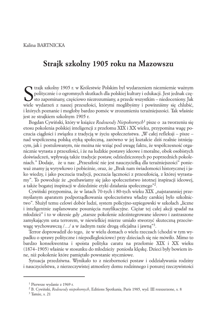 Kalina BARTNICKA Strajk szkolny 1905 roku na Mazowszu S trajk szkolny 1905 r. w Królestwie Polskim był wydarzeniem niezmiernie ważnym politycznie i o ogromnych skutkach dla polskiej kultury i edukacji. Jest jednak często zapominany, częściowo niezrozumiany, a przede wszystkim – niedoceniony. Jak wiele wydarzeń z naszej przeszłości, którymi moglibyśmy i powinniśmy się chlubić, i których poznanie i mogłoby bardzo pomóc w zrozumieniu teraźniejszości. Tak właśnie jest ze strajkiem szkolnym 1905 r. Bogdan Cywiński, który w książce Rodowody Niepokornych1 pisze o za tworzeniu się etosu pokolenia polskiej inteligencji z przełomu XIX i XX wieku, przypomina wagę poczucia ciągłości i związku z tradycją w życiu społeczeństwa. „W całej refleksji – pisze – nad współczesną polską etyką społeczną, zarówno w jej kształcie dziś realnie istniejącym, jak i postulowanym, nie można nie wziąć pod uwagę faktu, że współczesność organicznie wyrasta z przeszłości, i że na ludzkie postawy ideowe i moralne, obok osobistych doświadczeń, wpływają także tradycje postaw, odziedziczonych po poprzednich pokoleniach.” Dodaje, że u nas: „Przeszłość nie jest nauczycielką dla teraźniejszości” ponieważ znamy ją wyrywkowo i pobieżnie, oraz, że „Brak nam świadomości historycznej i jako wiedzy, i jako poczucia tradycji, poczucia łączności z przeszłością, z której wyrastamy”. To powoduje że „pozbawiamy się jako społeczeństwo istotnej inspiracji ideowej, a także bogatej inspiracji w dziedzinie etyki działania społecznego”2. Cywiński przypomina, że w latach 70-tych i 80-tych wieku XIX „najstaranniej przemyślanym aparatem podporządkowania społeczeństwa władzy carskiej było szkolnictwo”. Służył temu celowi dobór ludzi, system policyjno-szpiegowski w szkołach „liczne i inteligentnie zaplanowane posunięcia rusyfikacyjne. Ciężar tej całej akcji spadał na młodzież” i to w okresie gdy „starsze pokolenie zdezintegrowane ideowo i zastraszone zamykającym usta terrorem, w niewielkiej mierze umiało stworzyć skuteczną przeciwwagę wychowawczą /…/ a w żadnym razie drogą oficjalna i jawną”3. Terror doprowadził do tego, że w wielu domach o wielu rzeczach (chodzi w tym wypadku o sprawy polityczne i niepodległościowe) przy dzieciach się nie mówiło. Mimo to bardzo konsekwentna i spoista polityka caratu na przełomie XIX i XX wieku (1874–1905) właśnie w stosunku do młodzieży poniosła klęskę. Dzieci były bowiem inne, niż pokolenie które pamiętało powstanie styczniowe. Sytuacja przedziwna. Wynikało to z niezborności postaw i oddziaływania rodziny i nauczycielstwa, z nierzeczywistej atmosfery domu rodzinnego i ponurej rzeczywistości 1 Pierwsze wydanie z 1969 r. B. Cywiński, Rodowody niepokornych, Editions Spotkania, Paris 1985, wyd. III rozszerzone, s. 8 3 Tamże, s. 21 2 KALINA BARTNICKA 22 szkoły, która była „trudna, obca i antypatyczna”, i dla biednego ogółu ludności – droga4. Fenomenem był ruch samokształceniowy wśród uczniów. Młodzież się dokształcała, organizowała tajne kółka czytelnicze i dyskusyjne. Powstawały na ogół samorzutnie, ale pod koniec wieku zaczęły tworzyć usystematyzowaną rozgałęzioną organizację, z której wytworzyła się sieć konspiracyjnych połączeń pomiędzy studentami a uczniowskimi kółkami gimnazjalnymi. W następnych latach, już podczas strajku 1905 r. i bojkotu szkoły rządowej przez polską młodzież, okazały się sprawnymi kanałami łączności nadając młodzieżowemu ruchowi strajkowemu w szkołach Królestwa potrzebną spoistość i jednolitość, umożliwiając synchronizację wystąpień. O strajku szkolnym czasem mówi się, że to było jedyne udane powstanie polskie czasów zaborów. Umiejętność działania i odpowiedzialność uczestników ruchu wzbudza podziw: Młodzież potrafiła wznieść się ponad spory ideowe i polityczne (np. narodowców z sanatorami) i połączyć we wspólnym dążeniu do celu, którym było wywalczenie szkoły z językiem nauczania i duchem polskim. Umiała uzyskać poparcie Koła Wychowawców (początkowo przeciwnego akcji młodzieżowej), a stopniowo całego społeczeństwa dorosłych. Przyniosło to także bardzo pozytywne skutki dla podniesienia morale Polaków, dla opracowywania systemu kształcenia i doraźnie (aby zapobiec demoralizacji wałęsających się strajkujących uczniów) i w perspektywie dwudziestolecia międzywojennego. Ta młodzież później w życiu dorosłym budowała Polskę Odrodzoną, dzięki wielu z nich nasz kraj w czasie niepodległości rozwijał się a społeczeństwo w latach wojny nie uległo wrogom. W ten piękny ruch młodzieży, który uwieńczony został niemałym powodzeniem w postaci ustępstw władzy carskiej w sprawach szkolnictwa prywatnego, wpisała się młodzież mazowiecka, w tym – uczniowie gimnazjum w Pułtusku. Przypomnienie wydarzeń sprzed 100 lat w zaborze rosyjskim (na terenach Kongresówki), zwłaszcza na Mazowszu Północnym, okoliczności strajku i bojkotu szkoły rządowej rosyjskiej przez młodzież szkolną, gimnazjalną, studencką może dostarczyć ciekawego materiału do przemyśleń. Powinno dorzucić nieco światła na dzisiejsze niedostatki oświaty i wychowania, niektórym wychowawcom może nawet ułatwić zrozumienie błędów w pracy z młodzieżą . Strajk szkolny 1905 roku wpisuje się w nurt pięknych osiągnięć oświatowych nie tylko młodzieży ale ogółu Polaków. Jego przygotowanie, organizacja, przebieg i skutki, to jeden z wielu „edukacyjnych” dowodów, że wieczne narzekania Polaków na naszą niezborność, nieumiejętność sprawnego organizowania się i działania, nieumiejętność wykorzystywania sytuacji, brak konsekwencji – jako na niemal wrodzone cechy narodowe – nie są prawdziwe. Jest to bardzo pouczające i warte przypominania. Problematyka strajku szkolnego 190