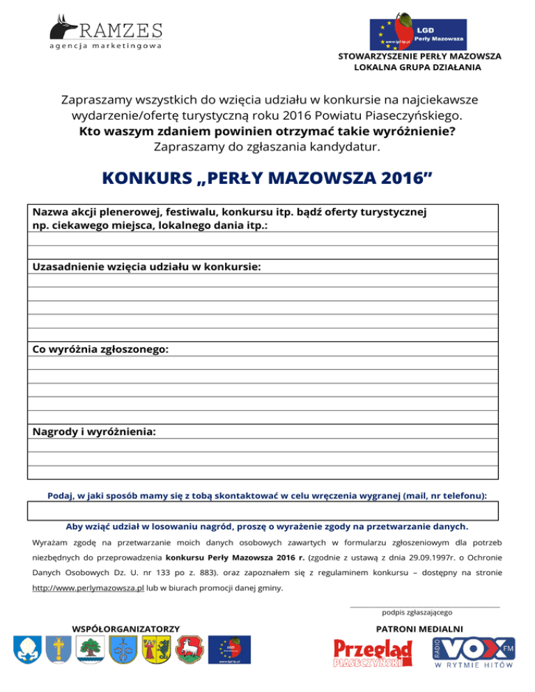 STOWARZYSZENIE PERŁY MAZOWSZA LOKALNA GRUPA DZIAŁANIA Zapraszamy wszystkich do wzięcia udziału w konkursie na najciekawsze wydarzenie/ofertę turystyczną roku 2016 Powiatu Piaseczyńskiego. Kto waszym zdaniem powinien otrzymać takie wyróżnienie? Zapraszamy do zgłaszania kandydatur. KONKURS „PERŁY MAZOWSZA 2016” Nazwa akcji plenerowej, festiwalu, konkursu itp. bądź oferty turystycznej np. ciekawego miejsca, lokalnego dania itp.: Uzasadnienie wzięcia udziału w konkursie: Co wyróżnia zgłoszonego: Nagrody i wyróżnienia: Podaj, w jaki sposób mamy się z tobą skontaktować w celu wręczenia wygranej (mail, nr telefonu): Aby wziąć udział w losowaniu nagród, proszę o wyrażenie zgody na przetwarzanie danych. Wyrażam zgodę na przetwarzanie moich danych osobowych zawartych w formularzu zgłoszeniowym dla potrzeb niezbędnych do przeprowadzenia konkursu Perły Mazowsza 2016 r. (zgodnie z ustawą z dnia 29.09.1997r. o Ochronie Danych Osobowych Dz. U. nr 133 po z. 883). oraz zapoznałem się z regulaminem konkursu – dostępny na stronie http://www.perlymazowsza.pl lub w biurach promocji danej gminy. ______________________________________________________________ podpis zgłaszającego WSPÓŁORGANIZATORZY PATRONI MEDIALNI