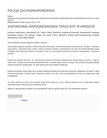 POLICJA ZACHODNIOPOMORSKA Źródło: http://www.zachodniopomorska.policja.gov.pl/sz/aktualnosci/aktualnosci/169,Zaatakowal-wspolbiesiadnika-teraz-jest-w-aresz cie.html Wygenerowano: Środa, 8 marca 2017, 17:31 ZAATAKOWAŁ WSPÓŁBIESIADNIKA TERAZ JEST W ARESZCIE Łobescy policjanci zatrzymali 31- latka, który podczas wspólnej biesiady zaatakował swojego kompana grożąc mu nożem i bijąc po całym ciele. Sprawca zabrał pokrzywdzonemu telefon komórkowy wart 600 złotych. Teraz najbliższe miesiące napastnik spędzi w areszcie. Na początku tygodnia policjanci z Reska otrzymali informację od emerytowanego funkcjonariusza, że jeden z mężczyzn został pobity i okradziony przez osobę, z którą wcześniej pił alkohol. Poszkodowany 45- latek nie potrafił dokładnie podać przebiegu tego zdarzenia. Jedyne co pamiętał to fakt, że kilka godzin wcześniej pił alkohol z przypadkowo poznanymi osobami. Podczas tej biesiady nieznany mu mężczyzna w pewnym momencie zaatakował go przewracając na ziemię i bijąc po całym ciele. Z dalszej relacji pokrzywdzonego wynikało, że sprawa wyjął z kieszeni nieduży nóż i przyłożył do gardła żądając wydania wszystkich przedmiotów. 31- latek zabrał mężczyźnie telefon komórkowy. Łobescy kryminalni, którzy zajęli się to sprawą niespełna pół godziny po zdarzeniu zatrzymali napastnika. W miejscu, gdzie przebywał policjanci znaleźli także ukradziony telefon oraz nóż, który prawdopodobnie służył do popełnienia tego przestępstwa. 31- latek usłyszał już zarzut, nie przyznaje się do zarzucanego mu czynu. Sąd po zapoznaniu się z materiałami sprawy zastosował wobec mężczyzny trzy miesięczny areszt. Zgodnie z obowiązującym prawem za to przestępstwo może mu grozić nawet do 12 lat pozbawienia wolności. Ocena: 0/5 (0) Tweetnij