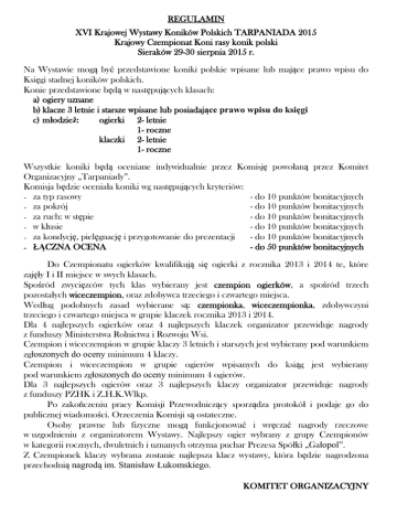 REGULAMIN XVI Krajowej Wystawy Koników Polskich TARPANIADA 2015 Krajowy Czempionat Koni rasy konik polski Sieraków 29-30 sierpnia 2015 r. Na Wystawie mogą być przedstawione koniki polskie wpisane lub mające prawo wpisu do Księgi stadnej koników polskich. Konie przedstawione będą w następujących klasach: a) ogiery uznane b) klacze 3 letnie i starsze wpisane lub posiadające prawo wpisu do księgi c) młodzież: ogierki 2- letnie 1- roczne klaczki 2- letnie 1- roczne Wszystkie koniki będą oceniane indywidualnie przez Komisję powołaną przez Komitet Organizacyjny „Tarpaniady”. Komisja będzie oceniała koniki wg następujących kryteriów: – za typ rasowy - do 10 punktów bonitacyjnych – za pokrój - do 10 punktów bonitacyjnych – za ruch: w stępie - do 10 punktów bonitacyjnych – w kłusie - do 10 punktów bonitacyjnych – za kondycję, pielęgnację i przygotowanie do prezentacji - do 10 punktów bonitacyjnych – ŁĄCZNA OCENA - do 50 punktów bonitacyjnych Do Czempionatu ogierków kwalifikują się ogierki z rocznika 2013 i 2014 te, które zajęły I i II miejsce w swych klasach. Spośród zwycięzców tych klas wybierany jest czempion ogierków, a spośród trzech pozostałych wiceczempion, oraz zdobywca trzeciego i czwartego miejsca. Według podobnych zasad wybierane są: czempionka, wiceczempionka, zdobywczyni trzeciego i czwartego miejsca w grupie klaczek rocznika 2013 i 2014. Dla 4 najlepszych ogierków oraz 4 najlepszych klaczek organizator przewiduje nagrody z funduszy Ministerstwa Rolnictwa i Rozwoju Wsi. Czempion i wiceczempion w grupie klaczy 3 letnich i starszych jest wybierany pod warunkiem zgłoszonych do oceny minimum 4 klaczy. Czempion i wiceczempion w grupie ogierów wpisanych do ksiąg jest wybierany pod warunkiem zgłoszonych do oceny minimum 4 ogierów. Dla 3 najlepszych ogierów oraz 3 najlepszych klaczy organizator przewiduje nagrody z funduszy PZHK i Z.H.K.Wlkp. Po zakończeniu pracy Komisji Przewodniczący sporządza protokół i podaje go do publicznej wiadomości. Orzeczenia Komisji są ostateczne. Osoby prawne lub fizyczne mogą funkcjonować i wręczać nagrody rzeczowe w uzgodnieniu z organizatorem Wystawy. Najlepszy ogier wybrany z grupy Czempionów w kategorii rocznych, dwuletnich i uznanych otrzyma puchar Prezesa Spółki „Gałopol”. Z Czempionek klaczy wybrana zostanie najlepsza klacz wystawy, która będzie nagrodzona przechodnią nagrodą im. Stanisław Łukomskiego. KOMITET ORGANIZACYJNY