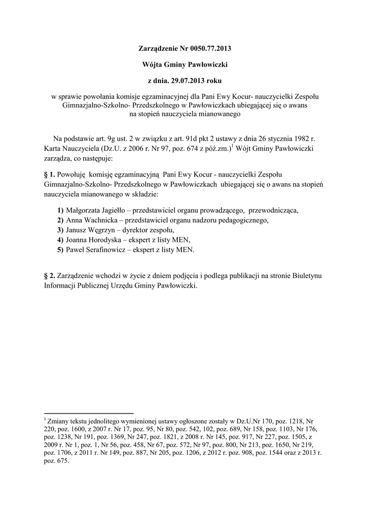 Zarządzenie Nr 0050.77.2013 Wójta Gminy Pawłowiczki z dnia. 29.07.2013 roku w sprawie powołania komisje egzaminacyjnej dla Pani Ewy Kocur- nauczycielki Zespołu Gimnazjalno-Szkolno- Przedszkolnego w Pawłowiczkach ubiegającej się o awans na stopień nauczyciela mianowanego Na podstawie art. 9g ust. 2 w związku z art. 91d pkt 2 ustawy z dnia 26 stycznia 1982 r. Karta Nauczyciela (Dz.U. z 2006 r. Nr 97, poz. 674 z póź.zm.)1 Wójt Gminy Pawłowiczki zarządza, co następuje: § 1. Powołuję komisję egzaminacyjną Pani Ewy Kocur - nauczycielki Zespołu Gimnazjalno-Szkolno- Przedszkolnego w Pawłowiczkach ubiegającej się o awans na stopień nauczyciela mianowanego w składzie: 1) 2) 3) 4) 5) Małgorzata Jagiełło – przedstawiciel organu prowadzącego, przewodnicząca, Anna Wachnicka – przedstawiciel organu nadzoru pedagogicznego, Janusz Węgrzyn – dyrektor zespołu, Joanna Horodyska – ekspert z listy MEN, Paweł Serafinowicz – ekspert z listy MEN. § 2. Zarządzenie wchodzi w Ŝycie z dniem podjęcia i podlega publikacji na stronie Biuletynu Informacji Publicznej Urzędu Gminy Pawłowiczki. 1 Zmiany tekstu jednolitego wymienionej ustawy ogłoszone zostały w Dz.U.Nr 170, poz. 1218, Nr 220, poz. 1600, z 2007 r. Nr 17, poz. 95, Nr 80, poz. 542, 102, poz. 689, Nr 158, poz. 1103, Nr 176, poz. 1238, Nr 191, poz. 1369, Nr 247, poz. 1821, z 2008 r. Nr 145, poz. 917, Nr 227, poz. 1505, z 2009 r. Nr 1, poz. 1, Nr 56, poz. 458, Nr 67, poz. 572, Nr 97, poz. 800, Nr 213, poz. 1650, Nr 219, poz. 1706, z 2011 r. Nr 149, poz. 887, Nr 205, poz. 1206, z 2012 r. poz. 908, poz. 1544 oraz z 2013 r. poz. 675.