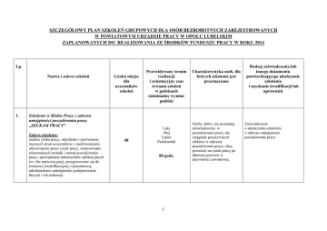 SZCZEGÓŁOWY PLAN SZKOLEŃ GRUPOWYCH DLA OSÓB BEZROBOTNYCH ZAREJESTROWANYCH W POWIATOWYM URZĄDZIE PRACY W OPOLU LUBELSKIM ZAPLANOWANYCH DO REALIZOWANIA ZE ŚRODKÓW FUNDUSZU PRACY W ROKU 2014 Lp. Nazwa i zakres szkoleń 1. Liczba miejsc dla uczestników szkoleń Szkolenie w Klubie Pracy z zakresu umiejętności poszukiwania pracy „SZUKAM PRACY” Zakres szkolenia: analiza rynku pracy, określenie i porównanie mocnych stron uczestników z możliwościami oferowanymi przez rynek pracy, zastosowanie różnorodnych technik i metod poszukiwania pracy, sporządzanie dokumentów aplikacyjnych (cv, list motywacyjny), przygotowanie się do rozmowy kwalifikacyjnej z pracodawcą, udoskonalenie umiejętności podejmowania decyzji i ich realizacji 48 Przewidywany termin realizacji i orientacyjny czas trwania szkoleń w godzinach (minimalny wymiar godzin) Luty Maj Lipiec Październik 80 godz. 1 Charakterystyka osób, dla których szkolenie jest przeznaczone Osoby, które: nie posiadają doświadczenia w poszukiwaniu pracy, nie osiągnęły pozytywnych efektów w zakresie poszukiwania pracy, chcą powrócić na rynek pracy po dłuższej przerwie w aktywności zawodowej. Rodzaj zaświadczenia lub innego dokumentu potwierdzającego ukończenie szkolenia i uzyskanie kwalifikacji lub uprawnień Zaświadczenie o ukończeniu szkolenia z zakresu umiejętności poszukiwania pracy 2. Organizacja i prowadzenie własnej firmy 10 Zakres szkolenia: Uwarunkowania działalności gospodarczej, marketing i negocjacje, prawne aspekty organizacji i prowadzenia działalności gospodarczej, ubezpieczenie społeczne i zdrowotne, tworzenie biznes planu, rachunkowość przedsiębiorstwa, budowanie wizerunku firmy RAZEM II i III kwartał 2014 min. 42 h 58 2 Osoby bezrobotne zainteresowane podjęciem własnej działalności gospodarczej Zaświadczenie potwierdzające ukończenie szkolenia lub inny dokument potwierdzający ukończenie szkolenia i uzyskanie kwalifikacji (zgodne z Rozporządzeniem Ministra Edukacji narodowej w sprawie kształcenia ustawicznego w formach pozaszkolnych z dnia 11 stycznia 2012 r (Dz.U. z 2012r. poz. 186)