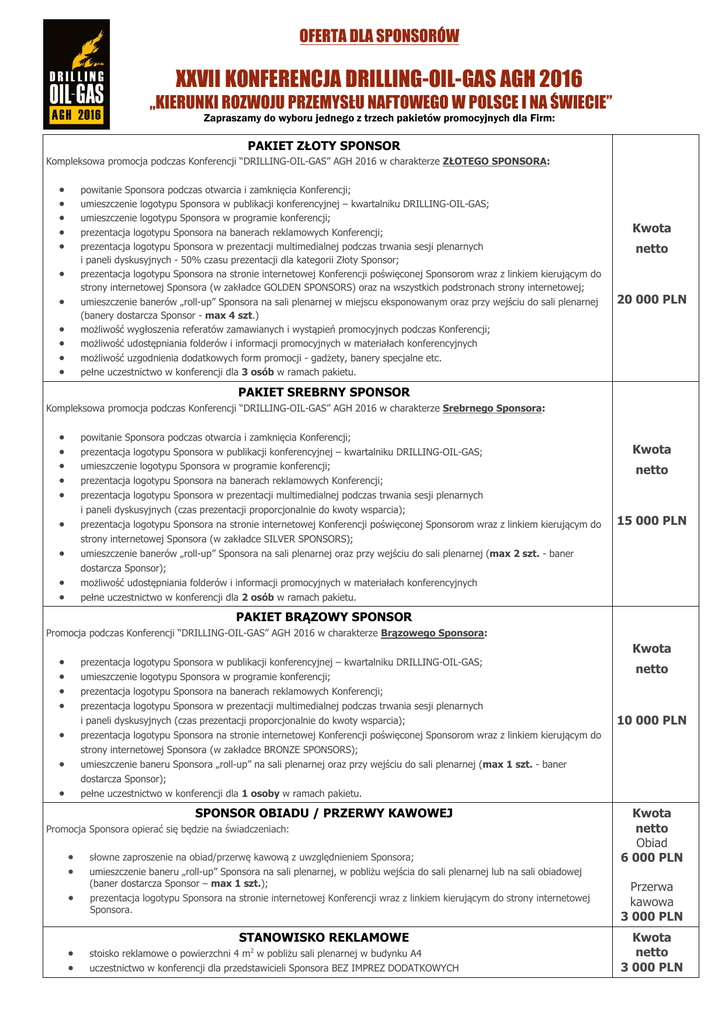 OFERTA DLA SPONSORÓW XXVII KONFERENCJA DRILLING-OIL-GAS AGH 2016 „KIERUNKI ROZWOJU PRZEMYSŁU NAFTOWEGO W POLSCE I NA ŚWIECIE” Zapraszamy do wyboru jednego z trzech pakietów promocyjnych dla Firm: PAKIET ZŁOTY SPONSOR Kompleksowa promocja podczas Konferencji “DRILLING-OIL-GAS” AGH 2016 w charakterze ZŁOTEGO SPONSORA: powitanie Sponsora podczas otwarcia i zamknięcia Konferencji; umieszczenie logotypu Sponsora w publikacji konferencyjnej – kwartalniku DRILLING-OIL-GAS; umieszczenie logotypu Sponsora w programie konferencji; prezentacja logotypu Sponsora na banerach reklamowych Konferencji; prezentacja logotypu Sponsora w prezentacji multimedialnej podczas trwania sesji plenarnych i paneli dyskusyjnych - 50% czasu prezentacji dla kategorii Złoty Sponsor; prezentacja logotypu Sponsora na stronie internetowej Konferencji poświęconej Sponsorom wraz z linkiem kierującym do strony internetowej Sponsora (w zakładce GOLDEN SPONSORS) oraz na wszystkich podstronach strony internetowej; umieszczenie banerów „roll-up” Sponsora na sali plenarnej w miejscu eksponowanym oraz przy wejściu do sali plenarnej (banery dostarcza Sponsor - max 4 szt.) możliwość wygłoszenia referatów zamawianych i wystąpień promocyjnych podczas Konferencji; możliwość udostępniania folderów i informacji promocyjnych w materiałach konferencyjnych możliwość uzgodnienia dodatkowych form promocji - gadżety, banery specjalne etc. pełne uczestnictwo w konferencji dla 3 osób w ramach pakietu. Kwota netto 20 000 PLN PAKIET SREBRNY SPONSOR Kompleksowa promocja podczas Konferencji “DRILLING-OIL-GAS” AGH 2016 w charakterze Srebrnego Sponsora: powitanie Sponsora podczas otwarcia i zamknięcia Konferencji; prezentacja logotypu Sponsora w publikacji konferencyjnej – kwartalniku DRILLING-OIL-GAS; umieszczenie logotypu Sponsora w programie konferencji; prezentacja logotypu Sponsora na banerach reklamowych Konferencji; prezentacja logotypu Sponsora w prezentacji multimedialnej podczas trwania sesji plenarnych i paneli dyskusyjnych (czas prezentacji proporcjonalnie do kwoty wsparcia); prezentacja logotypu Sponsora na stronie internetowej Konferencji poświęconej Sponsorom wraz z linkiem kierującym do strony internetowej Sponsora (w zakładce SILVER SPONSORS); umieszczenie banerów „roll-up” Sponsora na sali plenarnej oraz przy wejściu do sali plenarnej (max 2 szt. - baner dostarcza Sponsor); możliwość udostępniania folderów i informacji promocyjnych w materiałach konferencyjnych Kwota netto 15 000 PLN pełne uczestnictwo w konferencji dla 2 osób w ramach pakietu. PAKIET BRĄZOWY SPONSOR Promocja podczas Konferencji “DRILLING-OIL-GAS” AGH 2016 w charakterze Brązowego Sponsora: Kwota prezentacja logotypu Sponsora w publikacji konferencyjnej – kwartalniku DRILLING-OIL-GAS; umieszczenie logotypu Sponsora w programie konferencji; prezentacja logotypu Sponsora na banerach reklamowych Konferencji; prezentacja logotypu Sponsora w prezentacji multimedialnej podczas trwania sesji plenarnych i paneli dyskusyjnych (czas prezentacji proporcjonalnie do kwoty wsparcia); prezentacja logotypu Sponsora na stronie internetowej Konferencji poświęconej Sponsorom wraz z linkiem kierującym do strony internetowej Sponsora (w zakładce BRONZE SPONSORS); umieszczenie baneru Sponsora „roll-up” na sali plenarnej oraz przy wejściu do sali plenarnej (max 1 szt. - baner dostarcza Sponsor); pełne uczestnictwo w konferencji dla 1 osoby w ramach pakietu. SPONSOR OBIADU / PRZERWY KAWOWEJ Promocja Sponsora opierać się będzie na świadczeniach: słowne zaproszenie na obiad/przerwę kawową z uwzględnieniem Sponsora; umieszczenie baneru „roll-up” Sponsora na sali plenarnej, w pobliżu wejścia do sali plenarnej lub na sali obiadowej (baner dostarcza Sponsor – max 1 szt.); prezentacja logotypu Sponsora na stronie internetowej Konferencji wraz z linkiem kierującym do strony internetowej Sponsora. STANOWISKO REKLAMOWE stoisko reklamowe o powierzchni 4 m2 w pobliżu sali plenarnej w budynku A4 uczestnictwo w konferencji dla przedstawicieli Sponsora BEZ IMPREZ DODATKOWYCH netto 10 000 PLN Kwota netto Obiad 6 000 PLN Przerwa kawowa 3 000 PLN Kwota netto 3 000 PLN