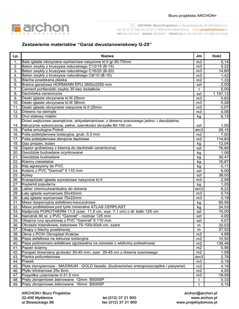 Zestawienie materiałów “Garaż dwustanowiskowy G-25”