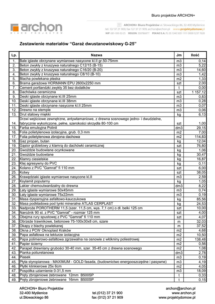 Biuro projektów ARCHON+ Zestawienie materiałów “Garaż dwustanowiskowy G-25” Lp. 1. 2. 3. 4. 5. 6. 7. 8. 9. 10. 11. 12. 13. 14. 15. 16. 17. 18. 19. 20. 21. 22. 23. 24. 25. 26. 27. 28. 29. 30. 31. 32. 33. 34. 35. 36. 37. 38. 39. 40. 41. 42. 43. 44. 45. 46. 47. 48. 49. Nazwa Bale iglaste obrzynane wymiarowe nasycone kl.II gr.50-75mm Beton zwykły z kruszywa naturalnego C12/15 (B-15) Beton zwykły z kruszywa naturalnego C16/20 (B-20) Beton zwykły z kruszywa naturalnego C8/10 (B-10) Blacha powlekana płaska Brama garażowa HORMANN EPU 2600x2250 mm Cement portlandzki zwykły 35 bez dodatków Dachówka ceramiczna Deski iglaste obrzynane kl.III 25mm Deski iglaste obrzynane kl.III 38mm Deski iglaste obrzynane nasycone kl.II 25mm Drewno na stemple Drut stalowy miękki Drzwi wejściowe zewnętrzne, antywłamaniowe, z drewna sosnowego jedno- i dwudzielne, fabrycznie wykończone, pełne, szerokości skrzydła 80-100 cm Farba emulsyjna Polinit Folia polietylenowa izolacyjna, grub. 0,3 mm Folia polietylenowa zbrojona dachowa Gaz propan, butan Gąsior grzbietowy z klamrą do dachówki ceramicznej Gwoździe budowlane ocynkowane Gwoździe budowlane Klamry ciesielskie Klej agresywny do PVC Kolano z PVC "Gamrat" fi 110 mm Kotwy Krawędziaki iglaste wymiarowe nasycone kl.II Ksylamit popularny Lakier chemoutwardzalny do drewna Łaty iglaste wymiarowe 50x45mm Łaty iglaste wymiarowe 75x22mm Masa dyspersyjna asfaltowo-kauczukowa Masa podkładowa pod tynki mineralne ATLAS CERPLAST Nadproże POROTHERM 11,5 (szer. 11,5 cm, wys. 7,1 cm) o dł. belki 125 cm Narożnik 90 st. z PVC "Gamrat" - rozmiar 125 mm Obejma rury spustowej z PVC "Gamrat" fi 110 mm Obrzeże trawnikowe, betonowe 75-100x30x8 cm, szare Okapy z blachy powlekanej Okna z PCW Oknoplast Kraków Papa asfaltowa na tekturze izolacyjna Papa polimerowo-asfaltowa zgrzewalna na osnowie z włókniny poliestrowej Papier ścierny Parapet drewniany grubości 30-40 mm, szer. 35-45 cm z drewna sosnowego Pianka poliuretanowa Piasek Płyta styropianowa - MAXIMUM - GOLD fasada, (budownictwo energooszczędne i pasywne) Płytki klinkierowe 25x 6cm Pospółka uziarnienie 0-31,5 mm Pręty zbrojeniowe żebrowane 12mm B500SP Pręty zbrojeniowe żebrowane 16mm B500SP ARCHON+ Biuro Projektów 32-400 Myślenice ul.Słowackiego 86 tel.(012) 37 21 900 fax (012) 37 21 909 Jm Ilość m3 m3 m3 m3 m2 szt t szt m3 m3 m3 m3 kg 0,14 5,22 14,60 1,42 1,33 2,00 0,00 1 157,12 0,83 0,28 0,07 0,06 6,13 szt dm3 m2 m2 kg szt kg kg kg kg szt szt m3 kg dm3 m3 m3 kg kg szt szt szt m m m2 m2 m2 m2 m2 dm3 m3 m3 m2 m3 t t 1,00 29,15 7,00 114,83 12,04 76,80 1,06 30,47 16,87 0,11 6,00 38,05 2,59 1,05 8,22 0,74 0,19 85,56 24,53 10,00 4,00 4,07 32,03 37,52 4,68 10,50 138,48 0,56 1,08 2,78 0,19 4,19 4,05 18,09 0,33 0,15 [email protected] www.archon.pl www.projektydomow.pl Biuro projektów ARCHON+ 50. 51. 52. 53. 54. 55. 56. 57. 58. 59. 60. 61. 62. 63. 64. 65. 66. 67. 68. 69. 70. 71. 72. 73. 74. 75. 76. 77. Pręty zbrojeniowe żebrowane 8mm B500SP Pustak ścienny typu POROTHERM typu 11,5 P+W o wym. 11,5x50x23,8 cm, kl. 10 Pustaki ceramiczne POROTHERM 25 250x375x238mm Rura spustowa z polichlorku winylu o średnicy 110 mm, "Gamrat" Rynna dachowa z polichlorku winylu o średnicy 125 mm, "Gamrat" Rynnowy lej spustowy z PVC "Gamrat" - rozmiar 125 mm Siatka o oczku 10x10cm - pręty zgrzewane z drutu d=6mm Siatka z włókna szklanego Słupki drewniane 7cm Szpachlówka celulozowa Środek impregnacyjno-grzybobójczy i ognioochronny FOBOS M-4 Trójnik do gąsiora do dachówki Tynk maszynowy cementowo-wapienny, lekki kat. III - ATLAS (ZTC-W-W) opak. 30 kg Uchwyt rynnowy z PVC "Gamrat" - rozmiar 125 mm Uszczelki Utwardzacz do lakieru Wkręty do blach samogwintujące Zamknięcie początkowe gąsiora dachówki Zaprawa budowlana zwykła cementowa M-12 Zaprawa budowlana zwykła cementowa M-7 Zaprawa klejąca ATLAS STOPTER K-10 Zaprawa klejowa ATLAS Zaprawa spoinująca Zaprawa tynkarska ATLAS CERMIT SN 20 Zaprawa tynkarska ATLAS STOPTER K-20 Złączka rury spustowej z PVC "Gamrat" fi 110 mm Złączka rynnowa z PVC "Gamrat" - rozmiar 125 mm Żwir do betonów zwykłych, wielofrakcyjny, uziarnienie 4-31,5 mm ARCHON+ Biuro Projektów 32-400 Myślenice ul.Słowackiego 86 tel.(012) 37 21 900 fax (012) 37 21 909 t szt szt m m szt m2 m2 m3 dm3 kg szt kg szt m dm3 szt szt m3 m3 kg kg kg kg kg szt szt m3 0,34 98,74 639,74 8,22 36,11 2,00 51,75 92,81 0,00 0,62 44,17 2,00 2 117,43 70,80 36,46 0,84 1 407,18 4,00 0,00 1,02 491,45 28,26 1,88 245,31 327,08 1,95 8,85 3,99 [email protected] www.archon.pl www.projektydomow.pl