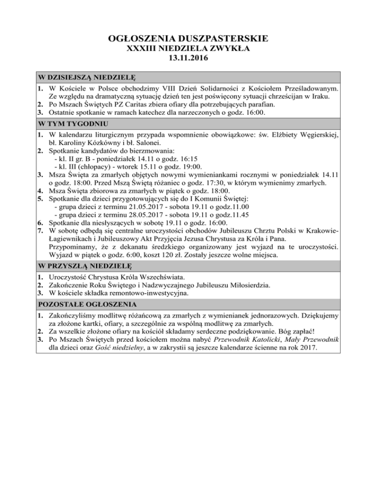 OGŁOSZENIA DUSZPASTERSKIE XXXIII NIEDZIELA ZWYKŁA 13.11.2016 W DZISIEJSZĄ NIEDZIELĘ 1. W Kościele w Polsce obchodzimy VIII Dzień Solidarności z Kościołem Prześladowanym. Ze względu na dramatyczną sytuację dzień ten jest poświęcony sytuacji chrześcijan w Iraku. 2. Po Mszach Świętych PZ Caritas zbiera ofiary dla potrzebujących parafian. 3. Ostatnie spotkanie w ramach katechez dla narzeczonych o godz. 16:00. W TYM TYGODNIU 1. W kalendarzu liturgicznym przypada wspomnienie obowiązkowe: św. Elżbiety Węgierskiej, bł. Karoliny Kózkówny i bł. Salonei. 2. Spotkanie kandydatów do bierzmowania: - kl. II gr. B - poniedziałek 14.11 o godz. 16:15 - kl. III (chłopacy) - wtorek 15.11 o godz. 19:00. 3. Msza Święta za zmarłych objętych nowymi wymieniankami rocznymi w poniedziałek 14.11 o godz. 18:00. Przed Mszą Świętą różaniec o godz. 17:30, w którym wymienimy zmarłych. 4. Msza Święta zbiorowa za zmarłych w piątek o godz. 18:00. 5. Spotkanie dla dzieci przygotowujących się do I Komunii Świętej: - grupa dzieci z terminu 21.05.2017 - sobota 19.11 o godz.11.00 - grupa dzieci z terminu 28.05.2017 - sobota 19.11 o godz.11.45 6. Spotkanie dla niesłyszących w sobotę 19.11 o godz. 16:00. 7. W sobotę odbędą się centralne uroczystości obchodów Jubileuszu Chrztu Polski w KrakowieŁagiewnikach i Jubileuszowy Akt Przyjęcia Jezusa Chrystusa za Króla i Pana. Przypominamy, że z dekanatu średzkiego organizowany jest wyjazd na te uroczystości. Wyjazd w piątek o godz. 6:00, koszt 120 zł. Zostały jeszcze wolne miejsca. W PRZYSZŁĄ NIEDZIELĘ 1. Uroczystość Chrystusa Króla Wszechświata. 2. Zakończenie Roku Świętego i Nadzwyczajnego Jubileuszu Miłosierdzia. 3. W kościele składka remontowo-inwestycyjna. POZOSTAŁE OGŁOSZENIA 1. Zakończyliśmy modlitwę różańcową za zmarłych z wymienianek jednorazowych. Dziękujemy za złożone kartki, ofiary, a szczególnie za wspólną modlitwę za zmarłych. 2. Za wszelkie złożone ofiary na kościół składamy serdeczne podziękowanie. Bóg zapłać! 3. Po Mszach Świętych przed kościołem można nabyć Przewodnik Katolicki, Mały Przewodnik dla dzieci oraz Gość niedzielny, a w zakrystii są jeszcze kalendarze ścienne na rok 2017.