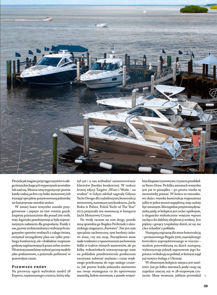Floryda jak magnes przyciąga turystów z całego świata kochających wypoczynek na wodzie lub nad nią. Można tutaj wypożyczyć prawie każdy rodzaj jachtu czy łodzi motorowej lub wynająć specjalnie przystosowaną jednostkę na fantastyczne morskie seafari. W naszej bazie wszystko zostało przygotowane i zapięte na tzw. ostatni guzik. Imprezę przeznaczono dla ponad 200 osób, więc logistyka przedsięwzięcia była najważniejszym zadaniem dla gospodarzy. Każdy z nas, prawie 20 dziennikarzy z wybranych magazynów sportów wodnych z całego świata, otrzymał szczegółowy plan nie tylko przebiegu konferencji, ale i dokładnie rozpisane godziny zaplanowanych przez siebie testów. Wcześniej musieliśmy wybrać po trzy modele jako podstawowe, a pozostałe próbować w pozostałym czasie. Pierwsze próby Na pierwszy ogień wybrałem model 28 Express, najmniejszego cruisera, który zdą- żył już i u nas wzbudzić zainteresowanie klientów (bardzo konkretne). W trakcie letniej edycji Targów „Wiatr i Woda – na wodzie” w Gdyni zdobył nagrodę Gdynia Yacht Design dla najładniejszej konstrukcji motorowej, natomiast jury konkursu „Jacht Roku w Polsce, Polish Yacht of The Year” 2013 przyznało mu nominację w kategorii Jacht Motorowy Cruiser. Na wodę ruszam na nim drugi, przede mną sprawdza go Bogdan Perfeniuk z ukraińskiego magazynu „Farwater”. Nie jest nim specjalnie zachwycony, tym bardziej ciekawi mnie, czy ma rację. Początkowo mam małe trudności z opanowaniem zachowania łódki w trakcie różnych manewrów, ale po kilku wskazówkach towarzyszącego nam na pokładzie przedstawiciela producenta zaczynam nabierać zaufania i coraz większego przekonania do tego małego cruisera. Jak prawie każda jednostka motorowa ma swoje wymagania co do operowania manetką, kołem sterowym, a przede wszyst- kim klapami trymowymi i trymem przekładni Stern-Drive. Po kilku minutach wszystko jest już w porządku – po prostu trzeba tę motorówkę poznać. W końcu to stosunkowo duża i wysoka konstrukcja wyposażona tylko w jeden zestaw napędowy, więc należy być uważnym. Ma zupełnie przyzwoitą dynamikę jazdy, w kokpicie jest cicho i spokojnie, a elegancko wykończone wnętrze wprost zachęca do dalekiej eksploracji wodnej. Jest piękny i gorący tropikalny dzień, aż się nie chce schodzić z pokładu. Następną zapisaną dla mnie konstrukcję – premierowego Regala 3200, największego bowridera zaprojektowanego w stoczni – miałem przewidzianą na dzień następny, wykorzystuję jednak zaproszenie jego kapitana i wskakuję na pokład, w którym zajął już miejsce kolega z Ukrainy. W obszernym kokpicie miejsca jest mnóstwo. Już po kilku minutach jazdy czuję się zupełnie inaczej niż w 28-stopowym cruiserze. Mam wrażenie, jakbym prowadził 39