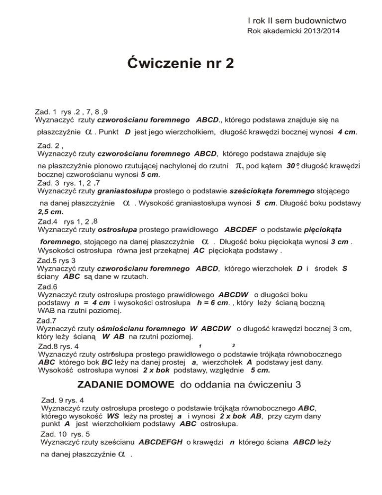 I rok II sem budownictwo Rok akademicki 2013/2014 Ćwiczenie nr 2 Zad. 1 rys .2 , 7, 8 ,9 Wyznaczyć rzuty czworościanu foremnego ABCD., którego podstawa znajduje się na płaszczyźnie a . Punkt D jest jego wierzchołkiem, długość krawędzi bocznej wynosi 4 cm. Zad. 2 , Wyznaczyć rzuty czworościanu foremnego ABCD, którego podstawa znajduje się . na płaszczyźnie pionowo rzutującej nachylonej do rzutni p1 pod kątem 30 o, długość krawędzi bocznej czworościanu wynosi 5 cm. Zad. 3 rys. 1, 2 ,7 Wyznaczyć rzuty graniastosłupa prostego o podstawie sześciokąta foremnego stojącego na danej płaszczyźnie a . Wysokość graniastosłupa wynosi 5 cm. Długość boku podstawy 2,5 cm. Zad.4 rys 1, 2 ,8 Wyznaczyć rzuty ostrosłupa prostego prawidłowego ABCDEF o podstawie pięciokąta foremnego, stojącego na danej płaszczyźnie a . Długość boku pięciokąta wynosi 3 cm . Wysokości ostrosłupa równa jest przekątnej AC pięciokąta podstawy . Zad.5 rys 3 Wyznaczyć rzuty czworościanu foremnego ABCD, którego wierzchołek D i środek S ściany ABC są dane w rzutach. Zad.6 Wyznaczyć rzuty ostrosłupa prostego prawidłowego ABCDW o długości boku podstawy n = 4 cm i wysokości ostrosłupa h = 6 cm. , który leży ścianą boczną WAB na rzutni poziomej. Zad.7 Wyznaczyć rzuty ośmiościanu foremnego W ABCDW o długość krawędzi bocznej 3 cm, który leży ścianą W AB na rzutni poziomej. 2 1 Zad.8 rys. 4 1 Wyznaczyć rzuty ostrosłupa prostego prawidłowego o podstawie trójkąta równobocznego ABC którego bok BC leży na danej prostej a, wierzchołek A podstawy jest dany. Wysokość ostrosłupa wynosi 2 x bok podstawy, względnie 5 cm. ZADANIE DOMOWE do oddania na ćwiczeniu 3 Zad. 9 rys. 4 Wyznaczyć rzuty ostrosłupa prostego o podstawie trójkąta równobocznego ABC, którego wysokość WS leży na prostej a i wynosi 2 x bok AB, przy czym dany punkt A jest wierzchołkiem podstawy ABC ostrosłupa. Zad. 10 rys. 5 Wyznaczyć rzuty sześcianu ABCDEFGH o krawędzi n którego ściana ABCD leży na danej płaszczyźnie a . x “ va = a S” D” x ‘ ha=a x D’ S’ Rys. 1 Rys. 3 Rys. 2 va A” a” a” x x n’ x a’ b’ a’ A’ b” n’ ha Rys. 4 Rys. 5 Rys. 6 va va a” b” x ha Rys. 7 x x a’ b’ ha Rys. 8 Rys. 9 a a a b b a b b a a b
