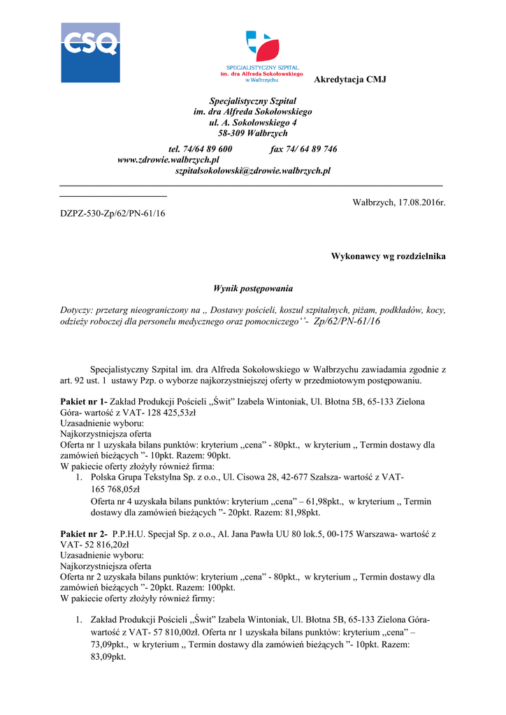 Akredytacja CMJ Specjalistyczny Szpital im. dra Alfreda Sokołowskiego ul. A. Sokołowskiego 4 58-309 Wałbrzych tel. 74/64 89 600 fax 74/ 64 89 746 www.zdrowie.walbrzych.pl [email protected] __________________________________________________________________________________ _______________________ Wałbrzych, 17.08.2016r. DZPZ-530-Zp/62/PN-61/16 Wykonawcy wg rozdzielnika Wynik postępowania Dotyczy: przetarg nieograniczony na ,, Dostawy pościeli, koszul szpitalnych, piŜam, podkładów, kocy, odzieŜy roboczej dla personelu medycznego oraz pomocniczego‘’- Zp/62/PN-61/16 Specjalistyczny Szpital im. dra Alfreda Sokołowskiego w Wałbrzychu zawiadamia zgodnie z art. 92 ust. 1 ustawy Pzp. o wyborze najkorzystniejszej oferty w przedmiotowym postępowaniu. Pakiet nr 1- Zakład Produkcji Pościeli ,,Świt” Izabela Wintoniak, Ul. Błotna 5B, 65-133 Zielona Góra- wartość z VAT- 128 425,53zł Uzasadnienie wyboru: Najkorzystniejsza oferta Oferta nr 1 uzyskała bilans punktów: kryterium ,,cena” - 80pkt., w kryterium ,, Termin dostawy dla zamówień bieŜących ”- 10pkt. Razem: 90pkt. W pakiecie oferty złoŜyły równieŜ firma: 1. Polska Grupa Tekstylna Sp. z o.o., Ul. Cisowa 28, 42-677 Szałsza- wartość z VAT165 768,05zł Oferta nr 4 uzyskała bilans punktów: kryterium ,,cena” – 61,98pkt., w kryterium ,, Termin dostawy dla zamówień bieŜących ”- 20pkt. Razem: 81,98pkt. Pakiet nr 2- P.P.H.U. Specjał Sp. z o.o., Al. Jana Pawła UU 80 lok.5, 00-175 Warszawa- wartość z VAT- 52 816,20zł Uzasadnienie wyboru: Najkorzystniejsza oferta Oferta nr 2 uzyskała bilans punktów: kryterium ,,cena” - 80pkt., w kryterium ,, Termin dostawy dla zamówień bieŜących ”- 20pkt. Razem: 100pkt. W pakiecie oferty złoŜyły równieŜ firmy: 1. Zakład Produkcji Pościeli ,,Świt” Izabela Wintoniak, Ul. Błotna 5B, 65-133 Zielona Górawartość z VAT- 57 810,00zł. Oferta nr 1 uzyskała bilans punktów: kryterium ,,cena” – 73,09pkt., w kryterium ,, Termin dostawy dla zamówień bieŜących ”- 10pkt. Razem: 83,09pkt. 2. REWA Wiesław Rewers. Ul. Kolumba 5, 70-035 Szczecin- wartość z VAT- 57 551,70zł. Oferta nr 3 uzyskała bilans punktów: kryterium ,,cena” – 73,42pkt., w kryterium ,, Termin dostawy dla zamówień bieŜących ”- 10pkt. Razem: 83,42pkt. Pakiet nr 3- REWA Wiesław Rewers. Ul. Kolumba 5, 70-035 Szczecin- wartość z VAT- 25 643,03zł. Uzasadnienie wyboru: Jedna złoŜona oferta Oferta nr 3 uzyskała bilans punktów: kryterium ,,cena” - 80pkt., w kryterium ,, Termin dostawy dla zamówień bieŜących ”- 10pkt. Razem: 90pkt. Specjalistyczny Szpital im. dra Alfreda Sokołowskiego w Wałbrzychu informuje, Ŝe umowa w przedmiotowym postępowaniu zostanie zawarta zgodnie z art. 94 ust. 1 pkt. 2 ustawy Pzp. nie wcześniej niŜ 23.08.2016r. Dyrektor Szpitala Mariola Dudziak ROZDZIELNIK Wykonawcy w postępowaniu: przetarg nieograniczony na ,, Dostawy pościeli, koszul szpitalnych, piŜam, podkładów, kocy, odzieŜy roboczej dla personelu medycznego oraz pomocniczego‘’- Zp/62/PN-61/16 Numer oferty 1 2 3 4 Nazwa (firma) i adres wykonawcy Zakład Produkcji Pościeli ,,Swit” Izabela Wintoniak Ul. Błotna 5B 65-133 Zielona Góra P.P.H.U. Specjał Sp. z o.o. Al. Jana Pawła UU 80 lok.5 00-175 Warszawa REWA Wiesław Rewers Ul. Kolumba 5 70-035 Szczecin Polska Grupa Tekstylna Sp. z o.o. Ul. Cisowa 28 42-677 Szałsza Cena * Pakiet nr 1- 128 425,53zł Pakiet nr 2- 57 810,00zł Termin dostawy: 9 dni Pakiet nr 2- 52 816,20zł Termin dostawy: 5 dni Pakiet nr 2- 57 551,70zł Pakiet nr 3- 25 643,03zł Termin dostawy: 10 dni Pakiet nr 1- 165 768,05zł Termin dostawy: 5 dni