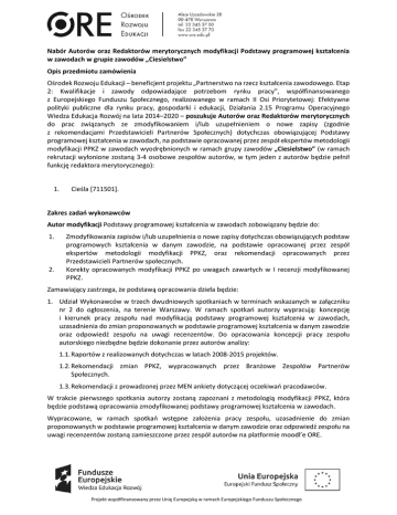Nabór Autorów oraz Redaktorów merytorycznych modyfikacji Podstawy programowej kształcenia w zawodach w grupie zawodów „Ciesielstwo” Opis przedmiotu zamówienia Ośrodek Rozwoju Edukacji – beneficjent projektu „Partnerstwo na rzecz kształcenia zawodowego. Etap 2: Kwalifikacje i zawody odpowiadające potrzebom rynku pracy”, współfinansowanego z Europejskiego Funduszu Społecznego, realizowanego w ramach II Osi Priorytetowej: Efektywne polityki publiczne dla rynku pracy, gospodarki i edukacji, Działania 2.15 Programu Operacyjnego Wiedza Edukacja Rozwój na lata 2014–2020 – poszukuje Autorów oraz Redaktorów merytorycznych do prac związanych ze zmodyfikowaniem i/lub uzupełnieniem o nowe zapisy (zgodnie z rekomendacjami Przedstawicieli Partnerów Społecznych) dotychczas obowiązującej Podstawy programowej kształcenia w zawodach, na podstawie opracowanej przez zespół ekspertów metodologii modyfikacji PPKZ w zawodach wyodrębnionych w ramach grupy zawodów „Ciesielstwo” (w ramach rekrutacji wyłonione zostaną 3-4 osobowe zespołów autorów, w tym jeden z autorów będzie pełnił funkcję redaktora merytorycznego): 1. Cieśla [711501]. Zakres zadań wykonawców Autor modyfikacji Podstawy programowej kształcenia w zawodach zobowiązany będzie do: 1. 2. Zmodyfikowania zapisów i/lub uzupełnienia o nowe zapisy dotychczas obowiązujących podstaw programowych kształcenia w danym zawodzie, na podstawie opracowanej przez zespół ekspertów metodologii modyfikacji PPKZ, oraz rekomendacji opracowanych przez Przedstawicieli Partnerów społecznych. Korekty opracowanych modyfikacji PPKZ po uwagach zawartych w I recenzji modyfikowanej PPKZ. Zamawiający zastrzega, że podstawą opracowania dzieła będzie: 1. Udział Wykonawców w trzech dwudniowych spotkaniach w terminach wskazanych w załączniku nr 2 do ogłoszenia, na terenie Warszawy. W ramach spotkań autorzy wypracują: koncepcję i kierunek pracy zespołu nad modyfikacją podstawy programowej kształcenia w zawodach, uzasadnienia do zmian proponowanych w podstawie programowej kształcenia w danym zawodzie oraz odpowiedź zespołu na uwagi recenzentów. Do opracowania koncepcji pracy zespołu autorskiego niezbędne będzie dokonanie przez autorów analizy: 1.1. Raportów z realizowanych dotychczas w latach 2008-2015 projektów. 1.2. Rekomendacji zmian PPKZ, wypracowanych przez Branżowe Zespołów Partnerów Społecznych. 1.3. Rekomendacji z prowadzonej przez MEN ankiety dotyczącej oczekiwań pracodawców. W trakcie pierwszego spotkania autorzy zostaną zapoznani z metodologią modyfikacji PPKZ, która będzie podstawą opracowania zmodyfikowanej podstawy programowej kształcenia w zawodach. Wypracowane, w ramach spotkań wstępne założenia pracy zespołu, uzasadnienie do zmian proponowanych w podstawie programowej kształcenia w danym zawodzie oraz odpowiedź zespołu na uwagi recenzentów zostaną zamieszczone przez zespół autorów na platformie moodl’e ORE. Projekt współfinansowany przez Unię Europejską w ramach Europejskiego Funduszu Społecznego Spotkania (dwudniowe) zespołów Autorów i Redaktorów merytorycznych odbędą się w terminach: 8-9.04.2017 r., 22-23.04.2017 r. i 13-14.05.2017 r. W ramach każdego ze spotkań Zamawiający zapewnia nocleg w przeddzień oraz z pierwszego, na drugi dzień spotkania, całodzienne wyżywienie, zwrot kosztów podróży (na podstawie ceny biletu PKP II klasy – nie więcej niż 200 zł). Redaktor merytoryczny zobowiązany będzie do: 1. 2. 3. 4. Konsultowania struktury i zawartości dzieła (PPKZ) z pracownikami projektu. Ujednolicenia i sprawdzenie pod kątem merytorycznym dzieła. Przekazania uwag recenzenta autorom dzieła po pierwszej recenzji. Dokonania korekty opracowanych modyfikacji PPKZ po uwagach zawartych w drugiej recenzji modyfikowanej PPKZ. Redaktorem merytorycznym może być wyłącznie Autor modyfikacji PPKZ. Warunki realizacji umowy: 1. Autor modyfikacji Podstawy programowej kształcenia w zawodach: 1.1. Typ umowy: Umowa o dzieło. 1.1. Termin realizacji umowy: 8.04-14.05.2017 r. (zgodnie z harmonogramem prac Autorów i Redaktorów merytorycznych modyfikacji PPKZ, stanowiącym załącznik nr 2 do ogłoszenia). 1.2. Warunki finansowe: na podstawie wniosku o dofinansowanie projektu Zamawiający określa następujący maksymalny limit kosztów na poszczególne wydatki związane z opisanym zadaniem: realizacja przedmiotu umowy: 100 zł/godzina * 50 h = 5000 zł/os. 2. Redaktor merytoryczny modyfikacji Podstawy programowej kształcenia w zawodach: 2.1. Typ umowy: zlecenie (łącznie 15 godzin). 2.2. Łączna liczba godzin zaangażowania: 15 godzin. 2.3. Termin realizacji umowy: 8.04-28.05.2017 r (zgodnie z harmonogramem prac Autorów i Redaktorów merytorycznych opracowania modyfikacji PPKZ). 2.4. Warunki finansowe: Na podstawie wniosku o dofinansowanie projektu Zamawiający określa następujący maksymalny limit kosztów na poszczególne wydatki związane z opisanym zadaniem: realizacja przedmiotu umowy: 100 zł/godzina * 15 h = 1500 zł/os. Wymagania stawiane Wykonawcy oraz kryteria wyboru ofert zostały określone w załączniku nr 3 do ogłoszenia Warunki zmiany umowy Zamawiający zastrzega możliwość zmiany treści umowy w stosunku do treści oferty, na podstawie której dokonano wyboru Wykonawcy, w zakresie terminów wykonania umowy oraz terminów odbioru Projekt współfinansowany przez Unię Europejską w ramach Europejskiego Funduszu Społecznego przedmiotu umowy. Zmiana terminu wykonania umowy możliwa jest w przypadku przedłużających się procedur przyjmowania wniosków o płatność projektu do realizacji, przedłużającej się procedury rekrutacyjnej lub innych uzasadnionych przyczyn wskazanych przez Zamawiającego mających wpływ na wykonanie niniejszej umowy (np.: opóźnienie przekazania recenzji przez recenzenta). Zmiana umowy z powodów, o których mowa w zdaniu poprzednim, możliwa jest pod warunkiem poinformowa