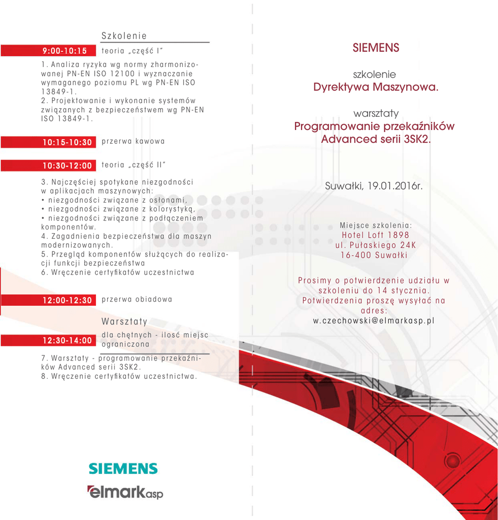 Szkolenie 9:00-10:15 teoria „część I” 1. Analiza ryzyka wg normy zharmonizowanej PN-EN ISO 12100 i wyznaczanie wymaganego poziomu PL wg PN-EN ISO 13849-1. 2. Projektowanie i wykonanie systemów związanych z bezpieczeństwem wg PN-EN ISO 13849-1. 10:15-10:30 przerwa kawowa 10:30-12:00 teoria „część II” 3. Najczęściej spotykane niezgodności w aplikacjach maszynowych: • niezgodności związane z osłonami, • niezgodności związane z kolorystyką, • niezgodności związane z podłączeniem k o m p o n e n t ó w. 4. Zagadnienia bezpieczeństwa dla maszyn modernizowanych. 5. Przegląd komponentów służących do realizacji funkcji bezpieczeństwa 6. Wręczenie certyfikatów uczestnictwa 12:00-12:30 przerwa obiadowa Warsztaty 12:30-14:00 dla chętnych - ilosć miejsc ograniczona 7. Warsztaty - programowanie przekaźników Advanced serii 3SK2. 8. Wręczenie certyfikatów uczestnictwa. SIEMENS szkolenie Dyrektywa Maszynowa. warsztaty Programowanie przekaźników Advanced serii 3SK2. Suwałki, 19.01.2016r. Miejsce szkolenia: Hotel Loft 1898 ul. Pułaskiego 24K 16-400 Suwałki Prosimy o potwierdzenie udziału w szkoleniu do 14 stycznia. Potwierdzenia proszę wysyłać na adres: w. c z e c h o w s k i @ e l m a r k a s p . p l