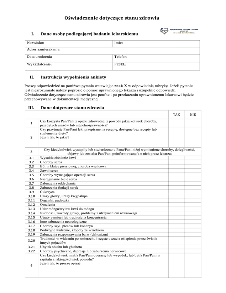 Oświadczeniedotyczącestanuzdrowia I. Daneosobypodlegającejbadaniulekarskiemu Nazwisko: Imie: Adreszamieszkania: Dataurodzenia Telefon Wykształcenie: PESEL: II. Instrukcjawypełnieniaankiety Proszę odpowiedzieć na poniższe pytania wstawiając znak X w odpowiednią rubrykę. Jeżeli pytanie jest niezrozumiałe należy poprosić o pomoc uprawnionego lekarza i uzupełnić odpowiedź. Oświadczenie dotyczące stanu zdrowia jest poufne i po przekazaniu uprawnionemu lekarzowi będzie przechowywane w dokumentacji medycznej. III. Danedotyczącestanuzdrowia TAK 1 2 3 3.1 3.2 3.3 3.4 3.5 3.6 3.7 3.8 3.9 3.10 3.11 3.12 3.13 3.14 3.15 3.16 3.17 3.18 3.19 3.20 3.21 3.22 4 NIE Czy korzysta Pan/Pani z opieki zdrowotnej z powodu jakiejkolwiek choroby, przebytych urazów lub niepełnosprawności? Czy przyjmuje Pan/Pani leki przepisane na receptę, dostępne bez recepty lub suplementy diety? Jeżeli tak, to jakie? Czy kiedykolwiek wystąpiły lub stwierdzono u Pana/Pani niżej wymienione choroby, dolegliwości, objawy lub został/a Pan/Pani poinformowany/a o nich przez lekarza: Wysokie ciśnienie krwi Choroby serca Ból w klatce piersiowej, choroba wieńcowa Zawał serca Choroby wymagające operacji serca Nieregularne bicie serca Zaburzenia oddychania Zaburzenia funkcji nerek Cukrzyca Urazy głowy, urazy kręgosłupa Drgawki, padaczka Omdlenia Udar mózgu/wylew krwi do mózgu Nudności, zawroty głowy, problemy z utrzymaniem równowagi Utraty pamięci lub trudności z koncentracją Inne zaburzenia neurologiczne Choroby szyi, pleców lub kończyn Podwójne widzenie, kłopoty ze wzrokiem Zaburzenia rozpoznawania barw (daltonizm) Trudności w widzeniu po zmierzchu i częste uczucie oślepienia przez światła innych pojazdów Ubytek słuchu lub głuchota Choroby psychiczne, depresję lub zaburzenia nerwicowe Czy kiedykolwiek miał/a Pan/Pani operację lub wypadek, lub był/a Pan/Pani w szpitalu z jakiegokolwiek powodu? Jeżeli tak, to proszę opisać TAK Czy używa lub kiedykolwiek używał/a Pan/Pani aparatu słuchowego? Jeżeli tak, to proszę podać kiedy? NIE 5 Czy kiedykolwiek był/a Pan/Pani badany/a z powodu zaburzeń snu lub lekarz informował, że ma Pan/Pani zaburzenia snu, zespoły bezdechu nocnego lub narkolepsję? Czy ktokolwiek mówił Panu/Pani o zaobserwowanych u Pana/Pani epizodach zatrzymania oddechu w czasie snu? Czy kiedykolwiek potrzebował/a Pan/Pani pomocy lub wsparcia z powodu nadużycia alkoholu lub środków działających podobnie do alkoholu? Czy używa Pan/Pani narkotyków lub innych substancji psychoaktywnych? Jeżeli tak, to jakich? 6 7 8 9 10 11 *) Jak często pije Pan/Pani alkohol (piwo, wino, wódka i inne alkohole) Nigdy albo rzadziej niż raz w miesiącu Raz w miesiącu Dwa do czterech razy w miesiącu Dwa do trzech razy w tygodniu Cztery i więcej razy w tygodniu Czy był/a Pan/Pani sprawcą/uczestnikiem wypadku drogowego od dnia zdania egzaminu na prawo jazdy? Czy pobiera Pan/Pani rentę z tytułu niezdolności do pracy? Jeżeli tak, to z jakiego powodu? 12 13 Czy posiada Pan/Pani orzeczenie stwierdzające niepełnosprawność? Jeżeli tak, to jakie i z jakiej przyczyny? IV. Oświadczam,żejestemświadomy/akoniecznościzgłoszeniasiędoponownej ocenystanuzdrowiawcelustwierdzeniaistnienialubbraku przeciwwskazańzdrowotnychwprzypadku: a. Wystąpienia u osób chorych na cukrzycę w porze czuwania epizodu ciężkiej hipoglikemii, także niezwiązanego z kierowaniem pojazdami, b. Wystąpienia napadu padaczki lub drgawek. c. Wystąpienie obturacyjnego bezdechu podczas snu V. Pouczony/aoodpowiedzialnościkarnejzart.233Kodeksukarnego– oświadczam,żepodaneprzezemniedanesązgodnezprawdą. *) Czytelnypodpisosobyskładającejoświadczenie Data Zaznaczyć właściwe