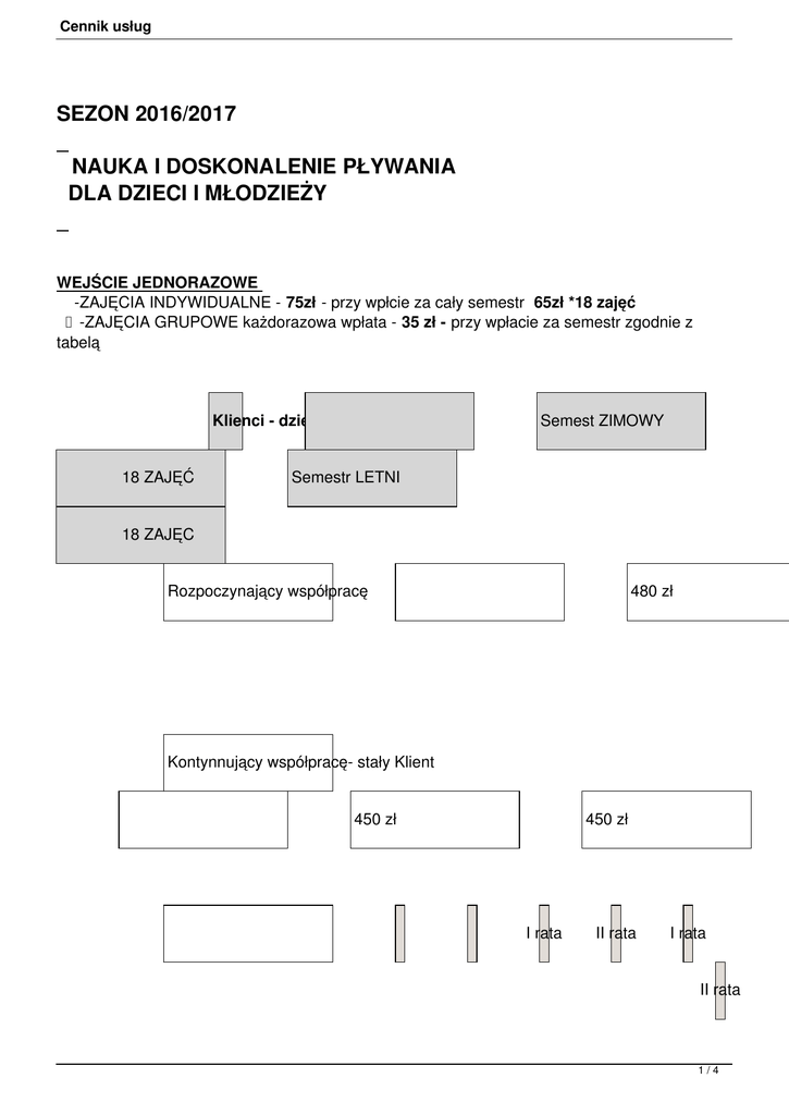 Cennik usług SEZON 2016/2017 NAUKA I DOSKONALENIE PŁYWANIA DLA DZIECI I MŁODZIEŻY WEJŚCIE JEDNORAZOWE -ZAJĘCIA INDYWIDUALNE - 75zł - przy wpłcie za cały semestr 65zł *18 zajęć -ZAJĘCIA GRUPOWE każdorazowa wpłata - 35 zł - przy wpłacie za semestr zgodnie z tabelą Klienci - dzieci, młodzież 18 ZAJĘĆ Semest ZIMOWY Semestr LETNI 18 ZAJĘC Rozpoczynający współpracę 480 zł Kontynnujący współpracę- stały Klient 450 zł 450 zł I rata II rata I rata II rata 1/4 Cennik usług Rozpoczynający współpracę Kontynuujący współpracę - stały Klient 240 zł DOROŚLI - pływanie zdrowe plecy tzw. pływanie dowolne - SEMESTR LETNI 18 ZAJĘĆ 225,0 zł 2/4 Cennik usług PROMOCJA! Zajęcia 2x w tygodniu lub Rodzeństwo - semestr - 860 zł przy wpłacie jednorazowej NAUKA I DOSKONALENIE PŁYWANIA DLA DOROSŁYCH Nauka dla dorosłych SEMESTR LETNI 10 zajęć JEDNORAZOWE 18 x 28zł 10 x 30zł 504 zł 300zł każde po50zł GIMNASTYKA ZDROWOTNA W WODZIE aqua aerobik Zapraszamy osoby, które mają bóle przeciążeniowe kręgosłupa, osoby którym dokuczają bóle stawów biodrowych i kolanowych. GIMNASTYKA ZDROWOTNA W WODZIE - PLECY BEZ BÓLÓW (aqua aerobik) 18 zajęć - semestr 10 zajęć 18 x 20zł 10 x 25zł 3/4 Cennik usług 360 zł 250zł gimnastyka w wodzie - mniej niż 10 zajeć - każde zajęcie po 50 zł URODZINY NA BASENIE więcej informacji www.plywanie.szczecin.pl/organizacja-urodzin.html ŁĄCZNY CZAS DO 3 GODZINY CENA - 490 ZŁ 4/4