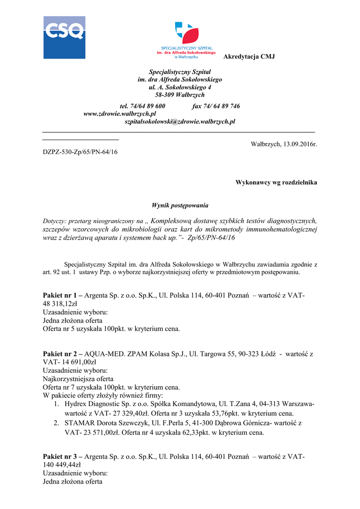 Akredytacja CMJ Specjalistyczny Szpital im. dra Alfreda Sokołowskiego ul. A. Sokołowskiego 4 58-309 Wałbrzych tel. 74/64 89 600 fax 74/ 64 89 746 www.zdrowie.walbrzych.pl [email protected] __________________________________________________________________________________ _______________________ Wałbrzych, 13.09.2016r. DZPZ-530-Zp/65/PN-64/16 Wykonawcy wg rozdzielnika Wynik postępowania Dotyczy: przetarg nieograniczony na ,, Kompleksową dostawę szybkich testów diagnostycznych, szczepów wzorcowych do mikrobiologii oraz kart do mikrometody immunohematologicznej wraz z dzierŜawą aparatu i systemem back up.”- Zp/65/PN-64/16 Specjalistyczny Szpital im. dra Alfreda Sokołowskiego w Wałbrzychu zawiadamia zgodnie z art. 92 ust. 1 ustawy Pzp. o wyborze najkorzystniejszej oferty w przedmiotowym postępowaniu. Pakiet nr 1 – Argenta Sp. z o.o. Sp.K., Ul. Polska 114, 60-401 Poznań – wartość z VAT48 318,12zł Uzasadnienie wyboru: Jedna złoŜona oferta Oferta nr 5 uzyskała 100pkt. w kryterium cena. Pakiet nr 2 – AQUA-MED. ZPAM Kolasa Sp.J., Ul. Targowa 55, 90-323 Łódź - wartość z VAT- 14 691,00zł Uzasadnienie wyboru: Najkorzystniejsza oferta Oferta nr 7 uzyskała 100pkt. w kryterium cena. W pakiecie oferty złoŜyły równieŜ firmy: 1. Hydrex Diagnostic Sp. z o.o. Spółka Komandytowa, Ul. T.Zana 4, 04-313 Warszawawartość z VAT- 27 329,40zł. Oferta nr 3 uzyskała 53,76pkt. w kryterium cena. 2. STAMAR Dorota Szewczyk, Ul. F.Perla 5, 41-300 Dąbrowa Górnicza- wartość z VAT- 23 571,00zł. Oferta nr 4 uzyskała 62,33pkt. w kryterium cena. Pakiet nr 3 – Argenta Sp. z o.o. Sp.K., Ul. Polska 114, 60-401 Poznań – wartość z VAT140 449,44zł Uzasadnienie wyboru: Jedna złoŜona oferta Oferta nr 5 uzyskała 100pkt. w kryterium cena. Pakiet nr 4 – P.P.H.U. BOR-POL Mariusz Borkowski, Plac Jaśminu 2, 44-152 Gliwice – wartość z VAT- 48 114,00zł Uzasadnienie wyboru: Jedna złoŜona oferta Oferta nr 1 uzyskała 100pkt. w kryterium cena. Pakiet nr 5 – Hydrex Diagnostic Sp. z o.o. Spółka Komandytowa, Ul. T.Zana 4, 04-313 Warszawa – wartość z VAT- 77 760,00zł Uzasadnienie wyboru: Jedna złoŜona oferta Oferta nr 3 uzyskała 100pkt. w kryterium cena. Pakiet nr 6- PZ CORMAY S.A., Ul. Wiosenna 22, 05-092 Łomianki – wartość z VAT6 480,00zł. Uzasadnienie wyboru: Jedna złoŜona oferta Oferta nr 6 uzyskała 100pkt. w kryterium cena. Pakiet nr 7- DiaHem AG Diagnostic Products Schlosserstrasse 4, CH-8180 Bulach, Szwajcaria - wartość z VAT- 943 465,11zł Uzasadnienie wyboru: Jedna złoŜona oferta Oferta nr 2 uzyskała 100pkt. w kryterium cena. Pakiet nr 8 - Argenta Sp. z o.o. Sp.K., Ul. Polska 114, 60-401 Poznań – wartość z VAT- 16 157,34zł Uzasadnienie wyboru: Jedna złoŜona oferta Oferta nr 5 uzyskała 100pkt. w kryterium cena. . Zamawiający zgodnie z art. 93 ust.1 pkt.4 pzp. informuje, iŜ przesunięto wartość szacunkową przeznaczoną na realizację zamówienia do kwot podanych przez Wykonawcę dla pakietów: 1,3,8. Specjalistyczny Szpital im. dra Alfreda Sokołowskiego w Wałbrzychu informuje, Ŝe umowa w przedmiotowym postępowaniu zostanie zawarta zgodnie z art. 94 ust. 1 pkt. 1 ustawy Pzp. nie wcześniej niŜ 24.09.2016r. Dyrektor Szpitala Mariola Dudziak ROZDZIELNIK Wykonawcy w postępowaniu: przetarg nieograniczony na ,, Kompleksową dostawę szybkich testów diagnostycznych, szczepów wzorcowych do mikrobiologii oraz kart do mikrometody immunohematologicznej wraz z dzierŜawą aparatu i systemem back up.”- Zp/65/PN-64/16 Numer Nazwa (firma) i adres wykonawcy oferty 1 P.P.H.U. BOR-POL Mariusz 2 3 4 5 Borkowski Plac Jaśminu 2, 44-152 Gliwice DiaHem AG Diagnostic Products Schlosserstrasse 4, CH-8180 Bulach, Szwajcaria Hydrex Diagnostic Sp. z o.o. Spółka Komandytowa Ul. T.Zana 4, 04-313 Warszawa STAMAR Dorota Szewczyk Ul. F.Perla 5, 41-300 Dąbrowa Górnicza Argenta Sp. z o.o. Sp.K. Ul. Polska 114, 60-401 Poznań 6 PZ CORMAY S.A. Ul. Wiosenna 22, 05-092 Łomianki 7 AQUA-MED. ZPAM Kolasa Sp.J. Ul. Targowa 55, 90-323 Łódź Cena * Pakiet nr 4- 48 114,00zł Pakiet nr 7- 943 465,11zł Pakiet nr 2- 27 329,40zł Pakiet nr 5- 77 760,00zł Pakiet nr 2- 23 571,00zł Pakiet nr 1- 48 318,12zł Pakiet nr 3- 140 449,44zł Pakiet nr 8- 16 157,34zł Pakiet nr 6- 6 480,00zł Pakiet nr 2- 14 691,00zł