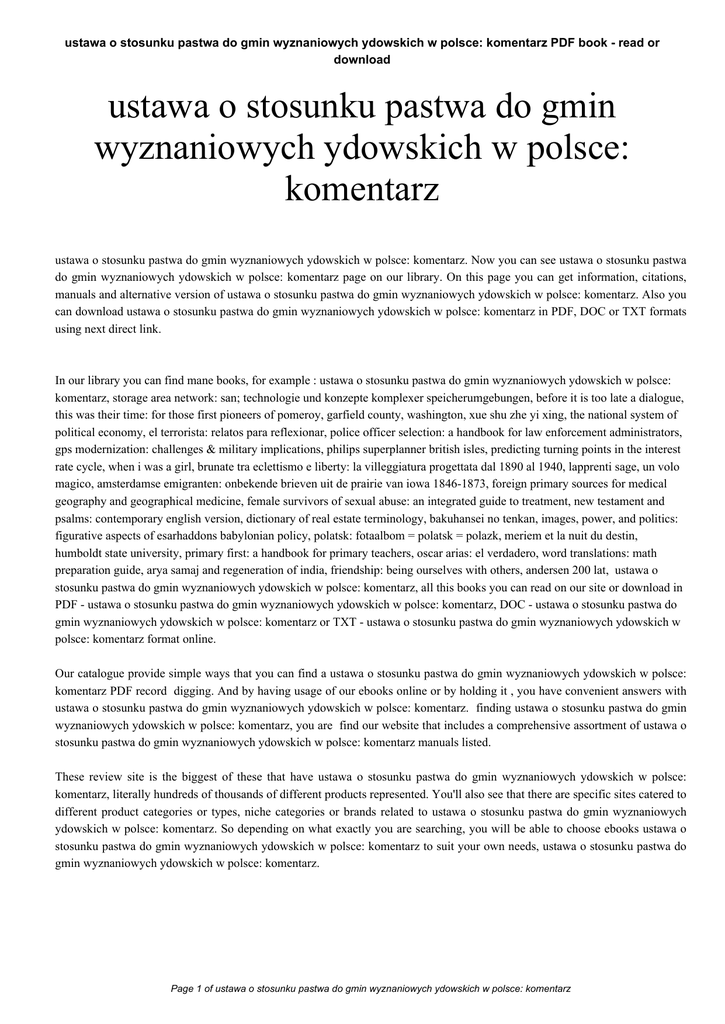 ustawa o stosunku pastwa do gmin wyznaniowych ydowskich w polsce: komentarz PDF book - read or download ustawa o stosunku pastwa do gmin wyznaniowych ydowskich w polsce: komentarz ustawa o stosunku pastwa do gmin wyznaniowych ydowskich w polsce: komentarz. Now you can see ustawa o stosunku pastwa do gmin wyznaniowych ydowskich w polsce: komentarz page on our library. On this page you can get information, citations, manuals and alternative version of ustawa o stosunku pastwa do gmin wyznaniowych ydowskich w polsce: komentarz. Also you can download ustawa o stosunku pastwa do gmin wyznaniowych ydowskich w polsce: komentarz in PDF, DOC or TXT formats using next direct link. In our library you can find mane books, for example : ustawa o stosunku pastwa do gmin wyznaniowych ydowskich w polsce: komentarz, storage area network: san; technologie und konzepte komplexer speicherumgebungen, before it is too late a dialogue, this was their time: for those first pioneers of pomeroy, garfield county, washington, xue shu zhe yi xing, the national system of political economy, el terrorista: relatos para reflexionar, police officer selection: a handbook for law enforcement administrators, gps modernization: challenges & military implications, philips superplanner british isles, predicting turning points in the interest rate cycle, when i was a girl, brunate tra eclettismo e liberty: la villeggiatura progettata dal 1890 al 1940, lapprenti sage, un volo magico, amsterdamse emigranten: onbekende brieven uit de prairie van iowa 1846-1873, foreign primary sources for medical geography and geographical medicine, female survivors of sexual abuse: an integrated guide to treatment, new testament and psalms: contemporary english version, dictionary of real estate terminology, bakuhansei no tenkan, images, power, and politics: figurative aspects of esarhaddons babylonian policy, polatsk: fotaalbom = polatsk = polazk, meriem et la nuit du destin, humboldt state university, primary first: a handbook for primary teachers, oscar arias: el verdadero, word translations: math preparation guide, arya samaj and regeneration of india, friendship: being ourselves with others, andersen 200 lat, ustawa o stosunku pastwa do gmin wyznaniowych ydowskich w polsce: komentarz, all this books you can read on our site or download in PDF - ustawa o stosunku pastwa do gmin wyznaniowych ydowskich w polsce: komentarz, DOC - ustawa o stosunku pastwa do gmin wyznaniowych ydowskich w polsce: komentarz or TXT - ustawa o stosunku pastwa do gmin wyznaniowych ydowskich w polsce: komentarz format online. Our catalogue provide simple ways that you can find a ustawa o stosunku pastwa do gmin wyznaniowych ydowskich w polsce: komentarz PDF record digging. And by having usage of our ebooks online or by holding it , you have convenient answers with ustawa o stosunku pastwa do gmin wyznaniowych ydowskich w polsce: komentarz. finding ustawa o stosunku pastwa do gmin wyznaniowych ydowskich w polsce: komentarz, you are find our website that includes a comprehensive assortment of ustawa o stosunku pastwa do gmin wyznaniowych ydowskich w polsce: komentarz manuals listed. These review site is the biggest of these that have ustawa o stosunku pastwa do gmin wyznaniowych ydowskich w polsce: komentarz, literally hundreds of thousands of different products represented. You'll also see that there are specific sites catered to different product categories or types, niche categories or brands related to ustawa o stosunku pastwa do gmin wyznaniowych ydowskich w polsce: komentarz. So depending on what exactly you are searching, you will be able to choose ebooks ustawa o stosunku pastwa do gmin wyznaniowych ydowskich w polsce: komentarz to suit your own needs, ustawa o stosunku pastwa do gmin wyznaniowych ydowskich w polsce: komentarz. Page 1 of ustawa o stosunku pastwa do gmin wyznaniowych ydowskich w polsce: komentarz