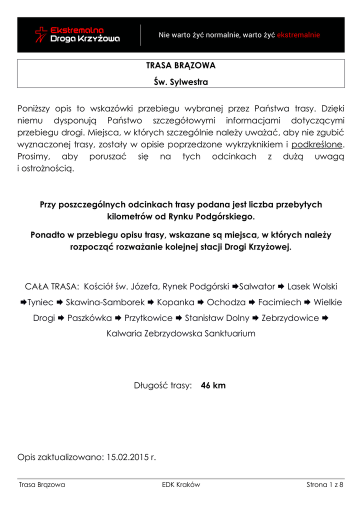 TRASA BRĄZOWA Św. Sylwestra Poniższy opis to wskazówki przebiegu wybranej przez Państwa trasy. Dzięki niemu dysponują Państwo szczegółowymi informacjami dotyczącymi przebiegu drogi. Miejsca, w których szczególnie należy uważać, aby nie zgubić wyznaczonej trasy, zostały w opisie poprzedzone wykrzyknikiem i podkreślone. Prosimy, aby poruszać się na tych odcinkach z dużą uwagą i ostrożnością. Przy poszczególnych odcinkach trasy podana jest liczba przebytych kilometrów od Rynku Podgórskiego. Ponadto w przebiegu opisu trasy, wskazane są miejsca, w których należy rozpocząć rozważanie kolejnej stacji Drogi Krzyżowej. CAŁA TRASA: Kościół św. Józefa, Rynek Podgórski Salwator Lasek Wolski Tyniec Skawina-Samborek Kopanka Ochodza Facimiech Wielkie Drogi Paszkówka Przytkowice Stanisław Dolny Zebrzydowice Kalwaria Zebrzydowska Sanktuarium Długość trasy: 46 km Opis zaktualizowano: 15.02.2015 r. Trasa Brązowa EDK Kraków Strona 1 z 8 Zasady poruszania się w czasie EDK Z myślą o bezpiecznym przebyciu trasy przygotowaliśmy kilka zasad, do których zalecamy się stosować: 1. 2. 3. 4. W czasie Drogi Krzyżowej poruszamy się w zwartych, nie większych niż liczące 10 osób grupach. Każda osoba ma założone elementy odblaskowe. Na drogach poruszamy się zgodnie z zasadami ruchu drogowego (idziemy lewą stroną jezdni, jeden za drugim). Idący na początku oraz na końcu grupy mają zapalone latarki. Dbamy o bezpieczeństwo własne oraz innych. Na trasie (poza wyznaczonymi stacjami Drogi Krzyżowej oraz sytuacjami wymagającymi konsultacji dalszego przebiegu drogi) obowiązuje całkowita zasada milczenia. Zwracajmy uwagę osobom nieprzestrzegającym tej reguły. POSZCZEGÓLNE ODCINKI TRASY Rynek Podgórski 0 km Skawina - Samborek 19 km 1. Przechodzimy przez Rynek Podgórski i udajemy się ul. K. Brodzińskiego na Kładkę Ojca Laecjusza Bernatka, przechodzimy na niej na drugą stronę Wisły, po czym skręcamy w lewo i udajemy się bulwarami wiślanymi do końca, aż do Klasztoru Norbertanek na Salwatorze. I STACJA – OBOK KLASZTORU PAULINÓW NA SKAŁCE II STACJA – OBOK KLASZTORU NORBERTANEK NA SALWATORZE 2. Od klasztoru w górę udajemy się ul. Św. Bronisławy w stronę Kopca Kościuszki, a następnie al. Waszyngtona przez Sikornik (biegnie ona wzdłuż zielonego szlaku, a na końcu zrębu, w miejscu, gdzie szlak odbija w prawo, Trasa Brązowa EDK Kraków Strona 2 z 8 3. idziemy prosto czarnym szlakiem. Przechodzimy ul. Starowolską i wchodzimy do Lasku Wolskiego. !!! Poruszamy się najpierw niebieskim szlakiem rowerowym i czarnym aż te skrzyżują się ze szlakiem niebieskim pieszym, skręcamy w lewo i idziemy niebieskim szlakiem aż do skrzyżowania ze szlakiem żółtym, którym idziemy w prawo pod górę do Polany Lea. III STACJA – FIGURA M.B. PRZY ŻÓŁTYM SZLAKU 4. Z Polany Lea kierujemy się w lewo, czerwonym szlakiem pod Klasztor kamedułów na Bielanach. IV STACJA – OBOK KOŚCIOŁA KAMEDUŁÓW NA BIELANACH 5. !!! Udajemy się w dół, ścieżką wzdłuż murów klasztoru, mając je po lewej ręce. Docieramy do szlaku, na którym skręcamy w lewo i idąc pomiędzy wodociągami po lewej ręce, a winnicą po prawej ręce, docieramy do skrzyżowania ulic Księcia Józefa i Mirowskiej. 6. Podążamy ulicą Mirowską. Przed autostradą skręcamy w lewo i wchodzimy na kładkę nad Wisłą. Przekraczamy rzekę. Zaraz za kładką skręcamy w lewo na wały. a potem po kilku metrach drogą z betonowych płyt w prawo w dół i idziemy drogą przez nieużytki mając po prawej ręce autostradę. Po drodze miniemy ruiny domu. 7. Przekraczamy rzeczkę i skręcamy w prawo pod wiadukt autostradowy. 8. Za wiaduktem idziemy ścieżką przez lasek i docieramy do ul. Bolesława Śmiałego, gdzie skręcamy w prawo, a następnie już z ulicy Bolesława Śmiałego skręcamy w lewo w ul. Zagórze (stoi przy niej znak zakaz wjazdu pojazdów powyżej 3,5T) i poruszamy się zielonym szlakiem wiodącym ulicą Zagórze wstronę Uroczyska Wielkanoc(szlak zielony dawno nieodświeżany więc należy wytężyć wzrok żeby nie minąć jego oznaczeń). V STACJA – UROCZYSKO WIELKANOC 9. Idziemy dalej zielonym szlakiem w górę uroczyska mając skały po lewej ręce, dochodzimy na szczyt wzniesienia i na wysokości ławeczki schodzimy w dół w lewą stronę aż do ul. Toporzyków, w którą skręcamy w prawo. Trasa Brązowa EDK Kraków Strona 3 z 8 10. !!! Z ulicy Toporzyków skręcamy w lewo w ul. Obrońców Tyńca. Na rozwidleniu (obok domu nr 32) skręcamy w drogę w prawo, a następnie (koło szopy nr 360 z wyrysowanej na niej bramką) ponownie idziemy w prawo, drogą pod górę w las. 11. !!! Dochodzimy do boiska. Mijamy stadion, mając go po swojej prawej ręce i dalej idziemy pod górę, w stronę piezometru(duży kopiec ziemi ogrodzony płotem). 12. !!! Idziemy dalej drogą prosto, mając piezometr po prawej ręce, i wchodzimy do starego kamieniołomu w Tyńcu. Idziemy za drogą i opuszczamy kamieniołom obok domu nr 31 (dom mając po lewej ręce). 13. !!! Po zejściu z drogi gruntowej na asfaltową, skręcamy w prawo i idziemy w dół. 14. Obok przystanku Tyniec Kamieniołom skręcamy w lewo i wchodzimy na ulicę Bogucianka. 15. Po skończeniu się zabudowań droga zaczyna schodzić w dół. Przy zakręcie w lewo (po prawej stronie przed stalowymi barierkami), wchodzimy na wąską, zarośniętą ścieżkę biegnącą wzdłuż linii energetycznych. Idziemy nią, aż ponownie wejdziemy na asfalt. 16. Idziemy tą drogą, aż do Figurki Św. Floriana stojącej przy mostku nad kanałem. VI STACJA – OBOK FIGURKI ŚW. FLORIANA ZARAZ ZA WEJŚCIEM DO SKAWINY PRZED MOSTKIEM NAD RZEPNIKIEM 17. Przekraczamy mostek i udajemy się dalej ok. 1,5 km do przystanku Skawina Samborek Most. Z przystanku Skawina Samborek Most skręcamy w prawo na ul. Piastowską i przechodzimy przez most na Skawince. Skawina - Samborek 19 km Wielkie Drogi przejazd kolejowy 29 km 18. !!! Przed 