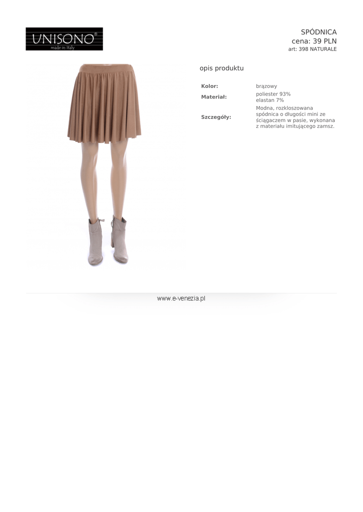SPÓDNICA cena: 39 PLN art: 398 NATURALE opis produktu Kolor: brązowy Materiał: poliester 93% elastan 7% Szczegóły: Modna, rozkloszowana spódnica o długości mini ze ściągaczem w pasie, wykonana z materiału imitującego zamsz.