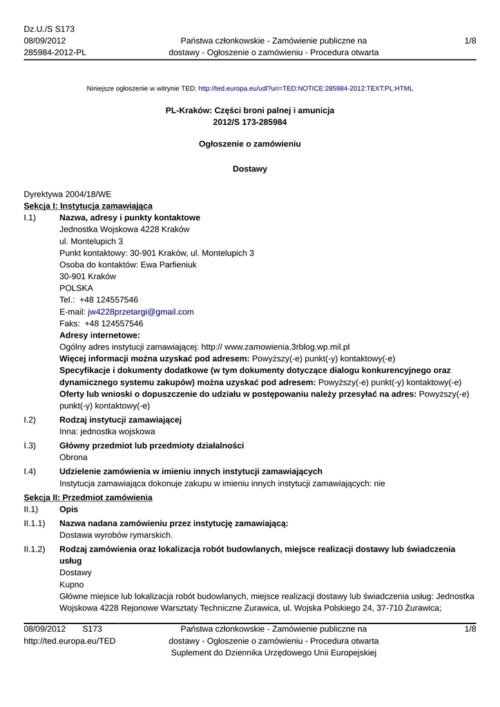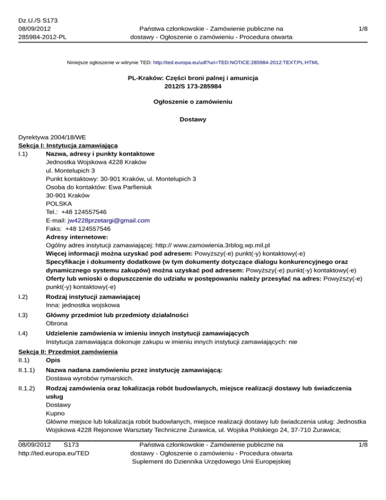 Dz.U./S S173 08/09/2012 285984-2012-PL Państwa członkowskie - Zamówienie publiczne na dostawy - Ogłoszenie o zamówieniu - Procedura otwarta 1/8 Niniejsze ogłoszenie w witrynie TED: http://ted.europa.eu/udl?uri=TED:NOTICE:285984-2012:TEXT:PL:HTML PL-Kraków: Części broni palnej i amunicja 2012/S 173-285984 Ogłoszenie o zamówieniu Dostawy Dyrektywa 2004/18/WE Sekcja I: Instytucja zamawiająca I.1) Nazwa, adresy i punkty kontaktowe Jednostka Wojskowa 4228 Kraków ul. Montelupich 3 Punkt kontaktowy: 30-901 Kraków, ul. Montelupich 3 Osoba do kontaktów: Ewa Parfieniuk 30-901 Kraków POLSKA Tel.: +48 124557546 E-mail: [email protected] Faks: +48 124557546 Adresy internetowe: Ogólny adres instytucji zamawiającej: http:// www.zamowienia.3rblog.wp.mil.pl Więcej informacji można uzyskać pod adresem: Powyższy(-e) punkt(-y) kontaktowy(-e) Specyfikacje i dokumenty dodatkowe (w tym dokumenty dotyczące dialogu konkurencyjnego oraz dynamicznego systemu zakupów) można uzyskać pod adresem: Powyższy(-e) punkt(-y) kontaktowy(-e) Oferty lub wnioski o dopuszczenie do udziału w postępowaniu należy przesyłać na adres: Powyższy(-e) punkt(-y) kontaktowy(-e) I.2) Rodzaj instytucji zamawiającej Inna: jednostka wojskowa I.3) Główny przedmiot lub przedmioty działalności Obrona I.4) Udzielenie zamówienia w imieniu innych instytucji zamawiających Instytucja zamawiająca dokonuje zakupu w imieniu innych instytucji zamawiających: nie Sekcja II: Przedmiot zamówienia II.1) Opis II.1.1) Nazwa nadana zamówieniu przez instytucję zamawiającą: Dostawa wyrobów rymarskich. II.1.2) Rodzaj zamówienia oraz lokalizacja robót budowlanych, miejsce realizacji dostawy lub świadczenia usług Dostawy Kupno Główne miejsce lub lokalizacja robót budowlanych, miejsce realizacji dostawy lub świadczenia usług: Jednostka Wojskowa 4228 Rejonowe Warsztaty Techniczne Żurawica, ul. Wojska Polskiego 24, 37-710 Żurawica; 08/09/2012 S173 http://ted.europa.eu/TED Państwa członkowskie - Zamówienie publiczne na dostawy - Ogłoszenie o zamówieniu - Procedura otwarta Suplement do Dziennika Urzędowego Unii Europejskiej 1/8 Dz.U./S S173 08/09/2012 285984-2012-PL Państwa członkowskie - Zamówienie publiczne na dostawy - Ogłoszenie o zamówieniu - Procedura otwarta 2/8 Jednostka Wojskowa 4228 Warsztaty Techniczne Lublin, al. Racławickie 44, 20-043 Lublin; Jednostka Wojskowa 4228 Warsztaty Techniczne Rzeszów, ul. Krakowska 11, 35 - 901 Rzeszów. Kod NUTS PL314,PL32 II.1.3) Informacje na temat zamówienia publicznego, umowy ramowej lub dynamicznego systemu zakupów (DSZ) Ogłoszenie dotyczy zamówienia publicznego II.1.4) Informacje na temat umowy ramowej II.1.5) Krótki opis zamówienia lub zakupu Przedmiotem zamówienia jest dostawa fabrycznie nowych, nieużywanych wyrobów rymarskich: pasek rękojeści do bagnetu 6H4 - wykonany ze skóry koloru naturalnego grubości 2 mm, wieszadło pochwy do bagnetu 6H4 wykonane ze skóry koloru naturalnego grubości 2 mm, torba na 4 magazynki do Beryl wykonana z materiału "panterka-kordura", taktyczny pas nośny 3-punktowy do 5,56 mm kbk AK Beryl wykonany z taśmy technicznej IRT szerokości 40 mm brezentowej koloru khaki, torba na 3 magazynki do kbk AK - wykonana z brezentu koloru khaki półmat, torba na granaty nasadkowe do Beryla usztywniona włókniną podpodeszwową, od wewnątrz obszyta brezentem koloru khaki półmat, od zewnątrz obszyta materiałem poliestrowym w kamuflażu typ "panterka" w wykonaniu wodoodpornym i posiadającym reemisję, pas nośny do Beryla - wykonany z taśmy technicznej IRT szerokości 35 mm koloru khaki, pas do broni strzeleckiej do kbk AK - wykonany z taśmy technicznej IRT szerokości 35 mm koloru khaki, pas nośny 3-punktowy do 9 mm pm 84 Glauberyt - wykonany z taśmy technicznej IRT szerokości 35 mm koloru khaki, torba na magazynki i przybornik do 9 mm pm-84 Glauberyt - wykonana z brezentu obszytego materiałem poliestrowym w kamuflażu typ "panterka" w wykonaniu wodoodpornym i posiadającym reemisję. II.1.6) Wspólny Słownik Zamówień (CPV) 35340000, 18910000, 18425000 II.1.7) Informacje na temat Porozumienia w sprawie zamówień rządowych (GPA) Zamówienie jest objęte Porozumieniem w sprawie zamówień rządowych (GPA): nie II.1.8) Części To zamówienie podzielone jest na części: nie II.1.9) Informacje o ofertach wariantowych Dopuszcza się składanie ofert wariantowych: nie II.2) Wielkość lub zakres zamówienia II.2.1) Całkowita wielkość lub zakres: 1. Pasek rękojeści do bagnetu 6H4 - wykonany ze skóry koloru naturalnego grubości 2 mm - szt. 3000. 2. Wieszadło pochwy do bagnetu 6H4 - wykonane ze skóry koloru naturalnego grubości 2 mm - szt. 2600. 3.Torba na 4 magazynki do Beryl wykonana z materiału "panterka-kordura" - szt. 1800. 4. Taktyczny pas nośny 3-punktowy do 5,56 mm kbk AK Beryl wykonany z taśmy technicznej IRT szerokości 40 mm brezentowej koloru khaki - szt. 500. 5. Torba na 3 magazynki do kbk AK - wykonana z brezentu koloru khaki półmat - szt. 800. 6. Torba na granaty nasadkowe do Beryla usztywniona włókniną podpodeszwową, od wewnątrz obszyta brezentem koloru khaki półmat, od zewnątrz obszyta materiałem poliestrowym w kamuflażu typ "panterka" w wykonaniu wodoodpornym i posiadającym reemisję. - szt. 100. 7. Pas nośny do Beryla - wykonany z taśmy technicznej IRT szerokości 35 mm koloru khaki - szt. 300. 8. Pas do broni strzeleckiej do kbk AK - wykonany z taśmy technicznej IRT szerokości 35 mm koloru khaki - szt. 500. 08/09/2012 S173 http://ted.europa.eu/TED Państwa członkowskie - Zamówienie publiczne na dostawy - Ogłoszenie o zamówieniu - Procedura otwarta Suplement do Dziennika Urzędowego Unii Europejskiej 2/8 Dz.U./S S173 08/09/2012 285984-2012-PL Państwa członkowskie - Zamówienie publiczne na dostawy - Ogłoszenie o zamówieniu - Procedura otwarta 3/8 9. Pas nośny 3-punktowy do 9 mm pm 84 Glauberyt - wykonany z taśmy technicznej IRT szerokości 35 mm koloru k