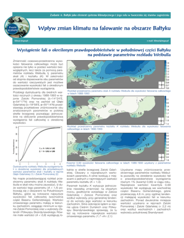 Zadanie 6. Bałtyk jako element systemu klimatycznego i jego rola w tworzeniu się stanów zagrożenia Wpływ zmian klimatu na falowanie na obszarze Bałtyku klimat.imgw.pl e-mail: [email protected] Wystąpienie fali o określonym prawdopodobieństwie w południowej części Bałtyku na podstawie parametrów rozkładu Weibulla Zmienność czasowo-przestrzenna wysokości falowania całkowitego może być opisana nie tylko w postaci wartości bezwzględnych, lecz także za pomocą parametrów rozkładu Weibulla, tj. parametru skali (A) i kształtu (K). W zależności od stopnia dopasowania obu parametrów do wartości rzeczywistych jest możliwe oszacowanie wysokości fali o określonym prawdopodobieństwie wystąpienia. Przebiegi dystrybuanty dla średnich wartości rocznych z okresu 1988-1993 w rejonie Zatoki Pomorskiej (λ=14°24’E, φ=54°17’N) oraz na zachód od Głębi Gdańskiej (λ=18°58’E, φ=55°14’N) przedstawiają przykładowe zróżnicowanie obu analizowanych parametrów w polskiej strefie brzegowej pozwalając jednocześnie na obliczenie prawdopodobieństwa wystąpienia fali całkowitej o określonej wysokości. Rozkład przestrzenny parametru skali A rozkładu Weibulla dla wysokości falowania całkowitego w latach 1988-1993 Prawdopodobieństwo Rozkład przestrzenny parametru kształtu K rozkładu Weibulla dla wysokości falowania całkowitego w latach 1988-1993 m Dystrybuanta rozkładu Weibulla wystąpienia fali o określonej wysokości dla przykładowych wartości parametrów skali i kształtu w rejonie Głębi Gdańskiej (1) i Zatoki Pomorskiej (2) Na mapie przedstawiającej rozkład przestrzenny parametru skali A rozkładu Weibulla w skali roku można zauważyć, iż duże wartości tego parametru (A > 1,5) pokrywają się z obszarami na Południowym Bałtyku, gdzie są notowane najwyższe wysokości fali całkowitej (wschodnia część Basenu Gotlandzkiego). Wartości omawianego parametru maleją w kierunku zachodnim, osiągając minimum w rejonie Zatoki Pomorskiej oraz u wybrzeży Zelandii i Półwyspu Skandynawskiego. Równie małe wartości (A < 0,8) występują lo- Kwantyl 0,99 wysokości falowania całkowitego w latach 1988-1993 uzyskany z parametrów rozkładu Weibulla kalnie w strefie brzegowej Zatoki Gdańskiej. Obszary o największych wartościach parametru A silnie korelują z miejscami o jednych z najmniejszych wartości parametru kształtu (K < 1,5). Parametr kształtu K wykazuje jednocześnie niewielką zmienność na otwartym morzu, gwałtownie wzrastając w Zatoce Gdańskiej i Zatoce Pomorskiej oraz wzdłuż wybrzeży, przy generalnej tendencji do wzrostu jego wartości w kierunku zachodnim. Silne osłonięcie lądem w rejonie ujścia Cieśnin Duńskich oraz Półwyspu Skandynawskiego sprawiają, że tu też są notowane największe wartości omawianego parametru (1,7 <K< 2,1). Uzyskane mapy zróżnicowania przestrzennego parametrów rozkładu Weibulla pozwoliły na określenie wysokości fali o prawdopodobieństwie wystąpienia równym 1% (kwantyl 0,99) w ciągu roku. Największe wartości kwantyla 0,99 wysokości fali występują we wschodniej części Basenu Gotlandzkiego, gdzie przekraczają 4,6 m, przy ogólnej tendencji malejącej wysokości fali w kierunku zachodnim. Ponad dwukrotnie mniejsze wartości uzyskano w rejonach Zatoki Pomorskiej i Zatoki Gdańskiej (< 2,2 m) oraz wzdłuż wschodnich i zachodnich wybrzeży południowej Skandynawii