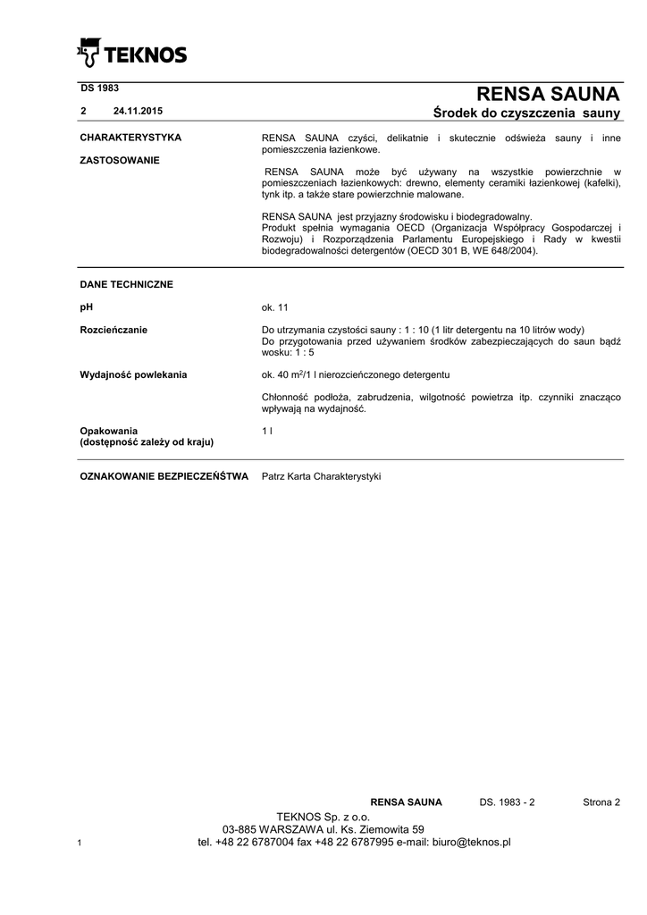 DS 1983 2 RENSA SAUNA 24.11.2015 Środek do czyszczenia sauny CHARAKTERYSTYKA RENSA SAUNA czyści, delikatnie i skutecznie odświeża sauny i inne pomieszczenia łazienkowe. ZASTOSOWANIE RENSA SAUNA może być używany na wszystkie powierzchnie w pomieszczeniach łazienkowych: drewno, elementy ceramiki łazienkowej (kafelki), tynk itp. a także stare powierzchnie malowane. RENSA SAUNA jest przyjazny środowisku i biodegradowalny. Produkt spełnia wymagania OECD (Organizacja Współpracy Gospodarczej i Rozwoju) i Rozporządzenia Parlamentu Europejskiego i Rady w kwestii biodegradowalności detergentów (OECD 301 B, WE 648/2004). DANE TECHNICZNE pH ok. 11 Rozcieńczanie Do utrzymania czystości sauny : 1 : 10 (1 litr detergentu na 10 litrów wody) Do przygotowania przed używaniem środków zabezpieczających do saun bądź wosku: 1 : 5 Wydajność powlekania ok. 40 m2/1 l nierozcieńczonego detergentu Chłonność podłoża, zabrudzenia, wilgotność powietrza itp. czynniki znacząco wpływają na wydajność. Opakowania (dostępność zależy od kraju) 1l OZNAKOWANIE BEZPIECZEŃŚTWA Patrz Karta Charakterystyki RENSA SAUNA 1 DS. 1983 - 2 TEKNOS Sp. z o.o. 03-885 WARSZAWA ul. Ks. Ziemowita 59 tel. +48 22 6787004 fax +48 22 6787995 e-mail: [email protected] Strona 2 SPOSÓB STOSOWANIA RENSA SAUNA rozcieńczyć wodą w zależności od przeznaczenia: Do utrzymania czystości sauny : 1 : 10 (1 litr detergentu na 10 litrów wody) Do przygotowania przed używaniem środków zabezpieczających do saun bądź wosku, przed lakierowaniem lub malowaniem: 1 : 5 Przed zastosowaniem detergentu czyszczone powierzchnie należy zwilżyć wodą. Zapobiega to wchłanianiu zbyt dużej ilości detergentu i zbyt szybkiemu schnięciu. Detergent nakładać na czyszczoną powierzchnię używając np. szczotki, gąbki i niskociśnieniowego natrysku (tzw. rozpylacz ogrodowy). Pozostawić na ok. 10 minut. Efekt czyszczący wzmocnić przez szczotkowanie. Detergent nie może wyschnąć na czyszczonej powierzchni - jeżeli to konieczne powierzchnię należy zwilżyć ponownie płynem czyszczącym. Powierzchnie dokładnie spłukać czystą wodą. Ochrona RENSA SAUNA jest skutecznym, bezpiecznym dla użytkownika i środowiska, biodegradowalnym produktem. Mimo tego z detergentem należy postępować z należytą ostrożnością. Należy unikać kontaktu ze skórą i wdychania mgły w trakcie rozpylania. Należy chronić oczy przez rozpryskami. Więcej informacji dotyczących bezpieczeństwa znajduje się w Karcie Charakterystyki produktu, dostępnej na stronie www.teknos.pl Mimo iż, detergent nie powoduje czyszczonych powierzchni należy ograniczać ilość zachlapań. Dla najbardziej delikatnych materiałów na przykład powierzchni tekstylnych, należy zapewnić ich skuteczną ochronę poprzez przetestowanie detergentu na małej, niewidocznej przestrzeni czyszczonej powierzchni. DODATKOWE INFORMACJE NIE MOŻE ZAMARZAC Informacje zawarte w karcie danych zostały stworzone w oparciu o badania laboratoryjne i praktyczne doświadczenie. Nie mając wpływu na warunki aplikacji jak również sposób postępowania możemy brać odpowiedzialność wyłącznie za jakość wyrobu i gwarantować, że odpowiada on naszym normom. Nie bierzemy również odpowiedzialności za straty lub uszkodzenia powstałe w wyniku nanoszenia wyrobów niezgodnie z zaleceniami lub z powodu niewłaściwego ich użycia. Produkt przeznaczony jest do użytku profesjonalnego. Oznacza to, że użytkownik posiada wystarczającą wiedzę do korzystania z produktu przestrzegając ściśle warunków technicznych i bezpieczeństwa pracy. Najnowsze wersje kart danych technicznych i charakterystyki znajdują się na stronie: www.teknos.com. 2 TEKNOS Sp. z o.o. 03-885 WARSZAWA ul. Ks. Ziemowita 59 tel. +48 22 6787004 fax +48 22 6787995 e-mail: [email protected]