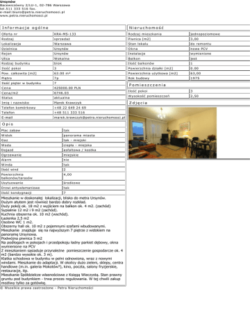 Ursynów Bacewiczówny 2/LU-1, 02-786 Warszawa tel.511 333 516 fax. e-mail:[email protected] www.petra.nieruchomosci.pl Informacje ogólne Nieruchomość Oferta nr KRA-MS-133 Rodzaj mieszkania jednopoziomowe Rodzaj sprzedaż Piwnica [m2] 3,00 Lokalizacja Warszawa Stan lokalu do remontu Dzielnica Ursynów Okna nowe PCV Rejon Ursynów Instalacje wymienione Ulica Wokalna Balkon jest Rodzaj budynku blok Ilość balkonów 1 Ilość pokoi 3 Powierzchnia działki [m2] 0.00 Pow. całkowita [m2] 63.00 m² Powierzchnia użytkowa [m2] 63,00 Piętro 7p Rok budowy 1975 Ilość pięter w budynku 7 Cena 425000.00 PLN Cena/m2 6746.03 Status aktualna Imię i nazwisko Marek Krawczyk Telefon komórkowy +48 22 649 24 69 Telefon +48 511 333 516 E-mail [email protected] Opis Plac zabaw tak Widok panorama miasta Gaz tak - miejski Woda ciepła - miejska Dojazd asfaltowa / kostka Ogrzewanie miejskie Alarm nie Winda tak Ilość wind 2 Powierzchnia balkonów/tarasów 4,00 Usytuowanie środkowe Drzwi antywłamaniowe tak Ilość kondygnacji 7 Mieszkanie w doskonałej lokalizacji, blisko do metra Ursynów. Dużym atutem jest również bardzo dobry rozkład. Duży pokój ok. 18 m2 z wyjściem na balkon ok. 4 m2. (zachód) Sypialnie 12 m2 i 9 m2 (zachód). Kuchnia obszerna ok. 10 m2 (wschód). Łazienka 2,5 m2 Osobne WC 1 m2. Obszerny hall ok. 10 m2 z pojemnymi szafami wbudowanymi. Mieszkanie znajduje się na najwyższym 7 piętrze z widokiem na panoramę Ursynowa. Podwójna piwnica 5 m2 Na podłogach w pokojach i przedpokoju ładny parkiet dębowy, okna wymienione na PCV Z mieszkaniem sąsiaduje przynależne pomieszczenie gospodarcze ok. 4 m2 (bardzo wysokie ok. 3 m). Klatka schodowa w budynku w pełni odnowiona, wraz z nowymi windami. Mieszkanie do adaptacji. W okolicy dużo zieleni, sklepy, centra handlowe (m.in. galeria Mokotów?), kino, poczta, salony fryzjerskie, restauracje, itp. Mieszkanie Spółdzielcze własnościowe z Księgą Wieczystą. Stan prawny gruntu pod budynkiem - trwa proces regulowania. W tej chwili zakup możliwy tylko za gotówkę. © Wszelkie prawa zastrzeżone - Petra Nieruchomości Pomieszczenia Ilość pokoi 3 Wysokość pomieszczeń 2,50 Zdjęcia