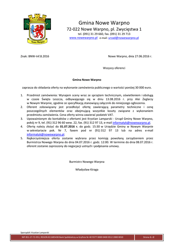 Gmina Nowe Warpno 72-022 Nowe Warpno, pl. Zwycięstwa 1 tel. (091) 31 29 660, fax. (091) 31 29 713 www.nowewarpno.pl e-mail: [email protected] Znak: BNW-Inf.8.2016 Nowe Warpno, dnia 27.06.2016 r. Wszyscy oferenci Gmina Nowe Warpno zaprasza do składania oferty na wykonanie zamówienia publicznego o wartości poniżej 30 000 euro. 1. 2. 3. 4. 5. Przedmiot zamówienia: Wynajem sceny wraz ze sprzętem technicznym, oświetleniem i obsługą w czasie Święta Leszcza, odbywającego się w dniu 13.08.2016 r. przy Alei Żeglarzy w Nowym Warpnie, zgodnie ze specyfikacją stanowiącą załącznik do niniejszego ogłoszenia. Oferent zobowiązany jest przedłożyć ofertę zawierającą parametry techniczne i cenę poszczególnych elementów oraz obejmującą wszystkie koszty związane z wykonaniem przedmiotu zamówienia. Cena oferty winna zawierać podatek VAT. Upoważnionym do kontaktów z ofertami jest Krystian Lamparski - Urząd Gminy Nowe Warpno, pokój nr 9, tel. (91) 312 96 60 wew. 22, fax. (91) 312 97 13, e-mail [email protected]. Ofertę należy złożyć do 01.07.2016 r. do godz. 15:30 w Urzędzie Gminy w Nowym Warpnie w sekretariacie pok. Nr 7, faxem pod nr (91) 312 97 13 lub na adres e-mail [email protected]. Najkorzystniejsza oferta zostanie wybrana przez komisję powołaną zarządzeniem przez Burmistrza Nowego Warpna do dnia 04.07.2016 r. godz. 12:00. W terminie do dnia 08.07.2016 r. oferent zostanie zaproszony do negocjacji ustnych i podpisania umowy. Burmistrz Nowego Warpna Władysław Kiraga Sporządził: Krystian Lamparski NIP 851-27-72-951; REGON 811685438 Bank Spółdzielczy w Gryfinie Nr 40 9377 0000 0400 0512 2000 0010 Strona 1 z 2 Załącznik do zapytania ofertowego BNW-Inf.8.2016 z dn. 27.06.2016 r. SPECYFIKACJA SCENA − scena o min. wymiarach: 6m szerokość, 5m głębokość, 3m wysokość (od podestów do kraty), − stabilna, zadaszona i zabudowana z 3 stron (zabezpieczenie przed silnym wiatrem i deszczem), − na scenie podczas koncertu nie może przebywać nikt poza członkami zespołu i ekipy technicznej, - ustawienie mikrofonów, monitorów zgodne ze STAGE PLAN SYSTEM NAGŁOS�NIENIA – FRONT − minimum trójdrożny system nagłośnieniowy o aktywnym podziale pasma, w którym obie strony grają tak samo, − moc systemu oraz sposób rozstawienia powinien zapewniać równe pokrycie dźwiękiem obszaru koncertu, − mikser analogowy min. 16 kanałów mono, każdy kanał z czteropunktowym EQ i płynną regulacją częstotliwości, min. 6 AUX z możliwością przełączenia pre/post, w sumę LR zainsertowany EQ graficzny 2x31, w 5 i 6 aux wpięty procesor FX – Reverb i TAP Delay SYSTEM MONITOROWY − Składający się z 6 wysokiej klasy monitorów tego samego rodzaju – 6 torów mono i CUE MIX. − Preferowane monitory firm: Nexo, L’Acoustic, Meyer Sound, EAW, d&b, JBL, POLAUDIO. − mile widziany mikser monitorowy wraz z realizatorem, − min. 4 wysyłki AUX, każda wysyłka z zainsertowanym EQ graficznym 31pkt, OS�WIETLENIE − oświetlenie powinno być adekwatne do charakterystyki sceny i zespołu, - przednia krata: reflektory PC, PAR56, PAR64, − tylna krata: oświetlenie efektowe: LED, ruchome głowy (min 4-6szt), strobo, wytwornica dymu + wentylator, ZASILANIE − zespół wymaga zasilania o wartości 230V (+/- 5%), − system (aparatura + sprzęt muzyków) - zasilany z tego samego źródła, umożliwiający odpowiedni pobór mocy – adekwatnie do potrzeb zainstalowanej aparatury. − instalacja elektryczna wykonana (zgodnie z obowiązującymi przepisami Prawa Energetycznego) w systemie TN-S - trójfazowa, pięcioprzewodowa (PE-uziemienie, Nneutralny, L1,L2,L3 faza), − firma zapewniająca nagłośnienie i zasilanie sprzętu zespołu, bierze na siebie odpowiedzialność za bezpieczeństwo wykonawców i techniki zespołu podczas prób i koncertu. Sporządził: Krystian Lamparski NIP 851-27-72-951; REGON 811685438 Bank Spółdzielczy w Gryfinie Nr 40 9377 0000 0400 0512 2000 0010 Strona 2 z 2