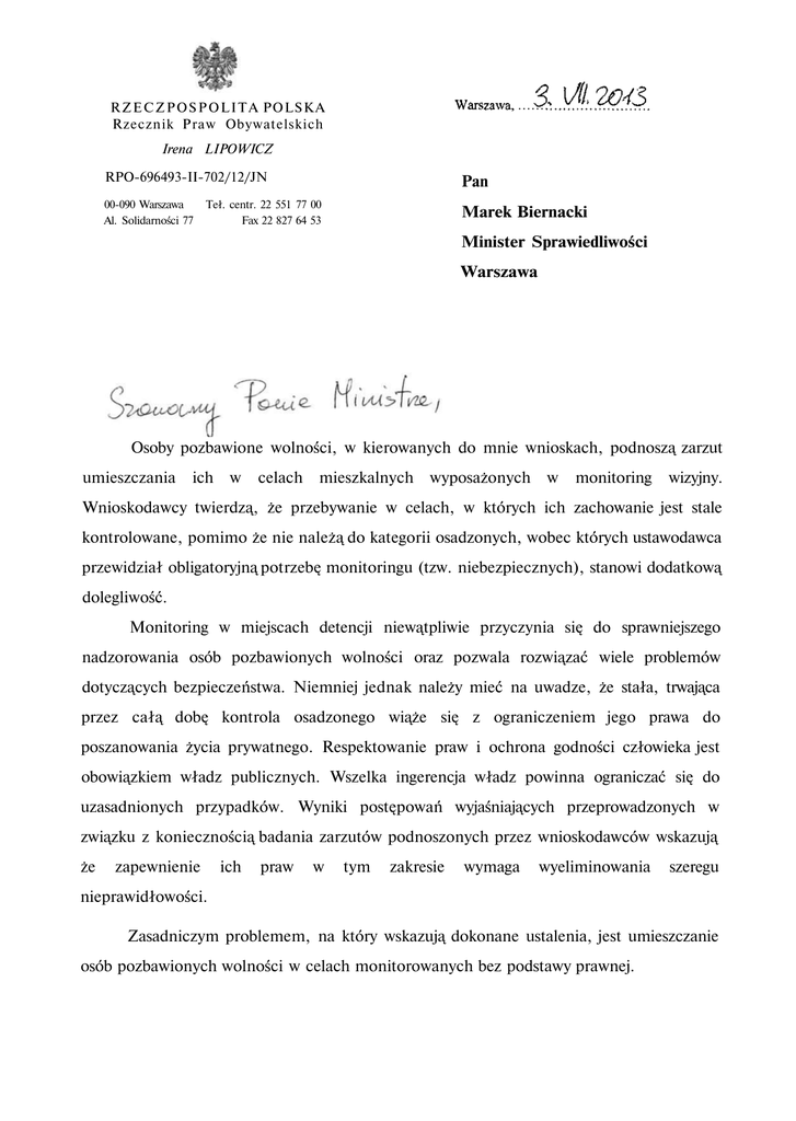 R Z E C Z P O S P O L I T A POLSKA Rzecznik Praw Obywatelskich Irena LIPOWICZ RPO-696493-II-702/12/JN Pan 00-090 Warszawa Al. Solidarności 77 Marek Biernacki Teł. centr. 22 551 77 00 Fax 22 827 64 53 Minister Sprawiedliwości Warszawa Osoby pozbawione wolności, w kierowanych do mnie wnioskach, podnoszą zarzut umieszczania ich w celach mieszkalnych wyposażonych w monitoring wizyjny. Wnioskodawcy twierdzą, że przebywanie w celach, w których ich zachowanie jest stale kontrolowane, pomimo że nie należą do kategorii osadzonych, wobec których ustawodawca przewidział obligatoryjną potrzebę monitoringu (tzw. niebezpiecznych), stanowi dodatkową dolegliwość. Monitoring w miejscach detencji niewątpliwie przyczynia się do sprawniejszego nadzorowania osób pozbawionych wolności oraz pozwala rozwiązać wiele problemów dotyczących bezpieczeństwa. Niemniej jednak należy mieć na uwadze, że stała, trwająca przez całą dobę kontrola osadzonego wiąże się z ograniczeniem jego prawa do poszanowania życia prywatnego. Respektowanie praw i ochrona godności człowieka jest obowiązkiem władz publicznych. Wszelka ingerencja władz powinna ograniczać się do uzasadnionych przypadków. Wyniki postępowań wyjaśniających przeprowadzonych w związku z koniecznością badania zarzutów podnoszonych przez wnioskodawców wskazują że zapewnienie ich praw w tym zakresie wymaga wyeliminowania szeregu nieprawidłowości. Zasadniczym problemem, na który wskazują dokonane ustalenia, jest umieszczanie osób pozbawionych wolności w celach monitorowanych bez podstawy prawnej. 2 Przepis art. 116 § 5a Kodeksu karnego wykonawczego (dalej k.k.w.) jednoznacznie określa, w jakich przypadkach zachowanie skazanego może podlegać monitorowaniu: w wypadkach uzasadnionych względami medycznymi albo potrzebą zapewnienia bezpieczeństwa skazanego. Tymczasem w celach, w których kamery rejestrują obraz i dźwięk, umieszcza się osadzonych z uwagi na brak wolnych miejsc w innych pomieszczeniach mieszkalnych lub ze względu na konieczność zapewnienia właściwych warunków odbywania kary osadzonym o różnych grupach i podgrupach klasyfikacyjnych. Taki sposób kwaterowania ma miejsce również w jednostkach penitencjarnych, w których funkcjonowały oddziały dla osadzonych tzw. niebezpiecznych, a obecnie działalność tych oddziałów jest zawieszona. Znajdujące się w nich cele są wykorzystywane jako zwykłe cele mieszkalne, w których umieszcza się osadzonych, wobec których nie podjęto decyzji o monitorowaniu ich zachowania. Należy jednoznacznie wskazać, iż umieszczanie osadzonych w celi objętej monitoringiem, mimo braku kodeksowych przesłanek monitorowania ich zachowania, jest naruszeniem obowiązujących przepisów. Kolejny problem dotyczy niewydawania przez dyrektora jednostki penitencjarnej pisemnej decyzji o monitorowaniu zachowania osadzonego, w przypadku gdy istnieją przesłanki umieszczenia go w celi wyposażonej w kamery. Zgodnie z treścią art. 116 § 6 k.k.w. objęcie monitorowaniem zachowania skazanego wymaga wydania decyzji przez dyrektora zakładu karnego. Podlega ona kontroli sajdowej w trybie art. 7 k.k.w., a także kontroli sędziego penitencjarnego w trybie art. 34 § 1 k.k.w. oraz kontroli Dyrektora Generalnego i dyrektora okręgowego Służby Więziennej w trybie art. 78 § 2 k.k.w. Aby ta kontrola była faktycznie możliwa, decyzja powinna być sporządzona na piśmie i zawierać informację o podstawie prawnej jej wydania, przesłankach, które zdecydowały o umieszczeniu w celi monitorowanej oraz pouczenie o przysługującym osadzonemu prawie do złożenia skargi do sądu penitencjarnego. Z powyższą kwestią wiąże się problem braku jawności monitoringu zachowania osób pozbawionych wolności (poza monitoringiem stosowanym wobec osób zakwalifikowanych do kategorii osadzonych stwarzających poważne zagrożenie społeczne albo poważne zagrożenie bezpieczeństwa jednostki penitencjarnej, gdzie jest on obligatoryjny). Ze skarg wpływających do podległego mi Biura wynika, że niejednokrotnie wnioskodawcy nie byli 5 informowani o decyzji dyrektora w przedmiocie poddania monitorowaniu ich zachowania oraz o jej przesłankach. Osadzeni nie zawsze mają też świadomość, że przebywają w niemonitorowanym obszarze, bowiem zamontowane w celi kamery sugerują, że ich zachowanie jest stale kontrolowane. O konieczności informowania osadzonego o podjętej wobec niego decyzji dotyczącej monitorowania jego zachowania stanowi art. 7 § 3 k.k.w.: „(...) decyzją ogłasza się lub doręcza wraz z uzasadnieniem i pouczeniem o przysługujajcym skazanemu prawie, terminie o sposobie wniesienia skarg?'. Zapoznanie osadzonego z taką decyzją jest również wyrazem podmiotowego traktowania. W sytuacji zaś, gdy skazany jest umieszczony w celi wyposażonej w kamery, ale nie zostały one uruchomione, bowiem nie ma wskazań do monitorowania jego zachowania w mojej ocenie - należy zainstalowany monitoring odłączyć od systemu nadzoru wizyjnego i serwerów, a obiektywy kamer przysłonić. Działania te będą stanowiły zabezpieczenie przed nieuprawnionym włączeniem urządzeń rejestrujących obraz i dźwięk oraz pozwolą osadzonemu mieć pełne przekonanie, że jego zachowanie nie jest monitorowane. Dyrektor Generalny Służby Więziennej nie podzielił tego stanowiska. W piśmie z dnia 17 maja 2013 r. (BDG-070-42/13/432) wskazał, że kamery nie posiadają fabrycznej przesłony, a nawet gdyby taka przesłona istniała, to stan kamery (czynna albo nie) nie byłby znany osobie obserwowanej. Jednocześnie uznał, że najlepszym rozwiązaniem w przyszłości byłoby nieumieszczanie w celach z zainstalowranym monitoringiem osadzonych, wobec których nie podjęto decyzji na mocy art. 116 § 5a k.k.w. - nawet w przypadku odłączenia monitoringu od systemu, co w obecnym stanie zaludnienia jednostek penitencjarnych jest trudne do wykonania. W tym miejscu warto dodać
