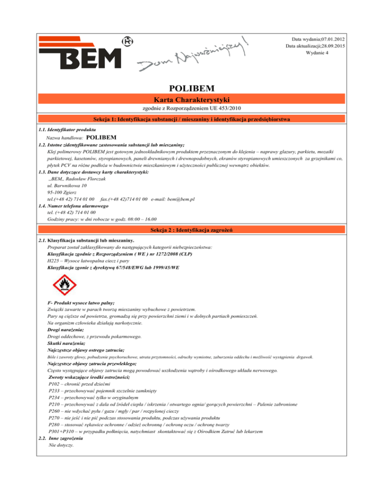 Data wydania;07.01.2012 Data aktualizacji;28.09.2015 Wydanie 4 POLIBEM Karta Charakterystyki zgodnie z Rozporządzeniem UE 453/2010 Sekcja 1: Identyfikacja substancji / mieszaniny i identyfikacja przedsiębiorstwa 1.1. Identyfikator produktu Nazwa handlowa: POLIBEM 1.2. Istotne zidentyfikowane zastosowania substancji lub mieszaniny; Klej polimerowy POLIBEM jest gotowym jednoskładnikowym produktem przeznaczonym do klejenia – naprawy glazury, parkietu, mozaiki parkietowej, kasetonów, styropianowych, paneli drewnianych i drewnopodobnych, ekranów styropianowych umieszczonych za grzejnikami co, płytek PCV na różne podłoża w budownictwie mieszkaniowym i użyteczności publicznej wewnątrz obiektów. 1.3. Dane dotyczące dostawcy karty charakterystyki: ,,BEM,, Radosław Florczak ul. Barwnikowa 10 95-100 Zgierz tel.(+48 42) 714 01 00 fax.(+48 42)714 01 00 e-mail: [email protected] 1.4. Numer telefonu alarmowego tel. (+48 42) 714 01 00 Godziny pracy: w dni robocze w godz. 08:00 – 16.00 Sekcja 2 : Identyfikacja zagrożeń 2.1. Klasyfikacja substancji lub mieszaniny. Preparat został zaklasyfikowany do następujących kategorii niebezpieczeństwa: Klasyfikacja zgodnie z Rozporządzeniem ( WE ) nr 1272/2008 (CLP) H225 – Wysoce łatwopalna ciecz i pary Klasyfikacja zgonie z dyrektywą 67/548/EWG lub 1999/45/WE F- Produkt wysoce łatwo palny; Związki zawarte w parach tworzą mieszaniny wybuchowe z powietrzem. Pary są cięższe od powietrza, gromadzą się przy powierzchni ziemi i w dolnych partiach pomieszczeń. Na organizm człowieka działają narkotycznie. Drogi narażenia; Drogi oddechowe, z przewodu pokarmowego. Skutki narażenia; Najczęstsze objawy ostrego zatrucia; Bóle i zawroty głowy, pobudzenie psychoruchowe, utrata przytomności, odruchy wymiotne, zaburzenia oddechu i możliwość wystąpienia drgawek. Najczęstsze objawy zatrucia przewlekłego; Często występujące objawy zatrucia mogą powodować uszkodzenia wątroby i ośrodkowego układu nerwowego. Zwroty wskazujące środki ostrożności; P102 – chronić przed dziećmi P233 – przechowywać pojemnik szczelnie zamknięty P234 – przechowywać tylko w oryginalnym P210 – przechowywać z dala od źródeł ciepła / iskrzenia / otwartego ognia/ gorących powierzchni – Palenie zabronione P260 – nie wdychać pyłu / gazu / mgły / par / rozpylonej cieczy P270 – nie jeść i nie pić podczas stosowania produktu, podczas używania produktu P280 – stosować rękawice ochronne / odzież ochronną / ochronę oczu / ochronę twarzy P301+P310 – w przypadku połknięcia, natychmiast skontaktować się z Ośrodkiem Zatruć lub lekarzem 2.2. Inne zagrożenia Nie dotyczy. Sekcja 3: Skład/ informacja o składnikach 3.1. Substancje Klej oparty jest na dyspersji polioctanowo – winylowej w rozpuszczalnikach organicznych z dodatkiem środków pomocniczych. Składniki stwarzające zagrożenia; Nazwa identyfikująca Zawartość wagowa w% ( lub przedział ) Numer CAS Numer indeksowy Numer WE Klasyfikacja Etanol 57 +/- 3% 64-17-5 603-002-00-5 200-578-6 H225 H312 H335 Symbol kategorii niebezpieczeństwa Sekcja 4 : Środki pierwszej pomocy 4.1. Opis środków pierwszej pomocy; - po narażeniu przez drogi oddechowe osobę poszkodowaną wyprowadzić z miejsca narażenia, zapewnić ciepło i spokój, wezwać pomoc medyczną. - po kontakcie ze skórą poszkodowanego wyprowadzić z miejsca narażenia. Zdjąć skażoną odzież i obuwie. Spłukać skórę dużą ilością bieżącej wody z mydłem. Przy zmianach skórnych wezwać pomoc medyczną. - po kontakcie z oczami niezwłocznie płukać oczy dużą ilości chłodnej bieżącej wody przy podwiniętych powiekach przez co najmniej 15 minut. Usunąć szkła kontaktowe o ile nie przywarły do oczu. Zapewnić pomoc okulistyczna - po narażeniu przez przewód pokarmowy W ciągu pierwszych 5 minut sprowokować poszkodowanego do wymiotów nie podawać mleka oraz tłuszczów. W razie duszności podawać tlen. W każdym przypadku połknięcia, konieczny jest transport karetką pogotowia do szpitala. Pokazywać opakowanie lub etykietę produktu. - uwagi We wszystkich przypadkach pojawienia się niepokojących objawów lub jakichkolwiek wątpliwości, należy zasięgnąć porady lekarza. - uwagi dla lekarza Skutki mogą wystąpić z opóźnieniem – wskazana jest obserwacja lekarza. Okres utajnienia wynosi od 6 – 24 godzin w zależności od ilości spożycia. Odtrutki nie są znane. Sekcja 5 : Postępowanie w przypadku pożaru Zawiadomić otoczenie o pożarze. Usunąć z obszaru zagrożenia wszelkie osoby nie biorące udziału w likwidowaniu awarii. Wezwać Państwową Straż Pożarną – 998 i Policję – 997. Opary alkoholu strącać rozproszonymi strumieniami wody. 5.1. Środki gaśnicze Odpowiednie środki gaśnicze; Proszki gaśnicze, tlenek węgla (gaśnice śniegowe), piasek, piana alkoholo-podobna, woda – strumienie rozproszone. Środki właściwe dla palącego się w sąsiedztwie materiału. Nieodpowiednie środki gaśnicze Nie określono 5.2. Szczególne zagrożenia związane z substancją lub mieszaniną Obszar zagrożony wybuchem. Pary metanolu są toksyczne. Zbiorniki narażone na działanie ognia i wysokiej temperatury chłodzić strumieniem wody z bezpiecznej odległości 5.3. Informacja dla straży pożarnej Odzież ochronna gazoszczelna z aparatem izolującym drogi oddechowe Sekcja 6 : Postępowanie w przypadku niezamierzonego uwolnienia do środowiska Zawiadomić otoczenie o wycieku. Ewakuować z obszaru zagrożenia osoby postronne. Awaria musi być jak najszybciej zlokalizowana i zlikwidowana. Wezwać Straż Pożarną i Policję. UWAGA; Obszar zagrożony wybuchem. Pary metanolu są toksyczne. 6.1. Indywidualne środki ostrożności, wyposażenie ochronne i procedury w sytuacjach awaryjnych. Unikać bezpośredniego kontaktu z produktem. Stosować odzież ochronną, rękawice, obuwie, aparat izolujący drogi oddechowe. Usunąć źródła zapłonu – nie palić nie