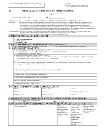 1.Numer Identyfikacji Podatkowej składającego deklarację Załącznik do Uchwały Rady Gminy w Reńskiej Wsi Nr XI/73/03 z dnia 10 grudnia 2003r. ................................................................................................... DN DEKLARACJA NA PODATEK OD NIERUCHOMOŚCI ………………………………….. (adnotacja organu podatkowego) 2. Rok na ........................................ Podstawa prawna: Ustawa z dnia 12 stycznia 1991 r. o podatkach i opłatach lokalnych (Tekst jedn. Dz.U. z 2002 r. Nr 9, poz. 84 ze zm.). Składający: Formularz przeznaczony dla osób prawnych, jednostek organizacyjnych oraz spółek nie mających osobowości prawnej będących właścicielami nieruchomości lub obiektów budowlanych, posiadaczami samoistnymi nieruchomości lub obiektów budowlanych, użytkownikami wieczystymi gruntów, posiadaczami nieruchomości lub ich części albo obiektów budowlanych lub ich części, stanowiących własność Skarbu Państwa lub jednostki samorządu terytorialnego oraz dla osób fizycznych będących współwłaścicielami lub współposiadaczami z osobami prawnymi, bądź z innymi jednostkami organizacyjnymi nie posiadającymi osobowości prawnej lub z spółkami nieposiadającymi osobowości prawnej, z wyjątkiem osób tworzących wspólnotę mieszkaniową. Termin składania: Do 15 stycznia każdego roku podatkowego; w terminie 14 dni od zaistnienia okoliczności mających wpływ na powstanie, bądź wygaśnięcie obowiązku podatkowego lub zaistnienia zdarzeń mających wpływ na wysokość podatku. Organ podatkowy: Wójt Gminy właściwy ze względu na miejsce położenia przedmiotów opodatkowania. A. MIEJSCE SKŁADANIA DEKLARACJI 3. Urząd Gminy Reńska Wieś ul.Pawłowicka 1 47-208 Reńska Wieś B. DANE SKŁADAJĄCEGO DEKLARACJĘ (niepotrzebne skreślić) * - dotyczy składającego deklarację niebędącego osobą fizyczną ** - dotyczy składającego deklarację będącego osobą fizyczną B.1 DANE IDENTYFIKACYJNE 4. Rodzaj składającego deklarację (zaznaczyć właściwą kratkę) 1. osoba fizyczna 2. osoba prawna 3. jednostka organizacyjna 4. spółka nie mająca osobowości prawnej 5. Rodzaj własności, posiadania (zaznaczyć właściwą kratkę) 1. właściciel 2. współwłaściciel 3. posiadacz samoistny 4. współposiadacz samoistny 5. użytkownik wieczysty 6. współużytkownik wieczysty 7. posiadacz 8. współposiadacz 6. Nazwisko lub nazwa oraz adres współwłaściciela, współposiadacza lub współużytkownika nieruchomości (wypełniać w przypadku występowania współwłasności nieruchomości) 7. Miejsce/a (adres/y) położenia przedmiotów opodatkowania oraz numer/y działek 8. Numer/y księgi wieczystej lub zbioru/ów dokumentów 9. Nazwa pełna * / Nazwisko, pierwsze imię, data urodzenia** 10. Nazwa skrócona* / imię ojca, imię matki** 11. Identyfikator REGON* / Numer PESEL** B.2 ADRES SIEDZIBY* / ADRES ZAMIESZKANIA** 12. Kraj 13. Województwo 14. Powiat 15. Gmina 16. Ulica 17. Numer domu / Numer lokalu 18. Miejscowość 19. Kod pocztowy 20. Poczta C. OKOLICZNOŚCI POWODUJĄCE KONIECZNOŚĆ ZŁOŻENIA DEKLARACJI 21. Okoliczności (zaznaczyć właściwą kratkę) 1. deklaracja roczna 2. korekta deklaracji rocznej D. DANE DOTYCZĄCE PRZEDMIOTÓW OPODATKOWANIA (z wyjątkiem zwolnionych) Wyszczególnienie Podstawa opodatkowania (powierzchnia w m2 lub ha, a w doniesieniu do budowli wartość w zł) Stawka podatku wynikająca z Uchwały Rady Gminy w Reńskiej Wsi (ogłoszona w Dz. Urzędowym Województwa Opolskiego w roku poprzedzającym dany rok Kwota podatku w zł,gr ( należy zaokrąglić do pełnych dziesiątek groszy ) podatkowy) w zł,gr D.1 POWIERZCHNIA GRUNTÓW 1. związanych z prowadzeniem działalności gospodarczej, bez względu na sposób zakwalifikowania w ewidencji gruntów i budynków 2. pod jeziorami, zajętych na zbiorniki wodne retencyjne lub elektrowni wodnych 3. pozostałych , w tym zajętych na prowadzenie odpłatnej statutowej działalności pożytku publicznego przez organizacje pożytku publicznego 22. 23. 24. ................... m2 25. .................,....... 26. .................,....... 27. .................... ha 28. .................,....... 29. .................,....... 30. ................... m2 .................,....... .................,....... D.2 POWIERZCHNIA UŻYTKOWA BUDYNKÓW LUB ICH CZĘŚCI (*) 1. mieszkalnych – ogółem 31. ................... m2 32. .................,....... 33. .................,....... w tym: - kondygnacji o wysokości od 1,40 do 2,20 m (zaliczyć 50% powierzchni) 34. ........................... m2 35. 36. ........................,........ ........................,........ - kondygnacji o wysokości powyżej 2,20 m ........................... m2 ........................,........ ........................,........ * Do powierzchni użytkowej budynku lub jego części należy zaliczyć powierzchnię mierzoną, po wewnętrznej długości ścian na wszystkich kondygnacjach, z wyjątkiem powierzchni klatek schodowych oraz szybów dźwigowych. Za kondygnację uważa się również garaże podziemne, piwnice, sutereny i poddasza użytkowe. 2. związanych z prowadzeniem działalności gospodarczej oraz od budynków mieszkalnych lub ich części zajętych na prowadzenie działalności gospodarczej ogółem, w tym: - kondygnacji o wysokości od 1,40 do 2,20 m (zaliczyć 50% powierzchni) - kondygnacji o wysokości powyżej 2,20 m 2.1.związanych z prowadzeniem działalności gospodarczej oraz od budynków mieszkalnych lub ich części zajętych na prowadzenie działalności gospodarczej, od 1m2 powierzchni użytkowej, jeżeli działalność ta w danym budynku została rozpoczęta po raz pierwszy, ogółem w tym: - kondygnacji o wysokości od 1,40 do 2,20m /zaliczyć 50% - powierzchni/ kondygnacji o wysokości powyżej 2,20m 3. zajęte na prowadzenie działalności gospodarczej w zakresie obrotu kwalifikowanym materiałem siewnym ogółem, w tym: - kondygnacji o