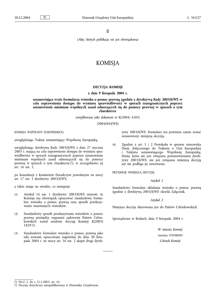 10.12.2004 PL Dziennik Urzędowy Unii Europejskiej L 365/27 II (Akty, których publikacja nie jest obowiązkowa) KOMISJA DECYZJA KOMISJI z dnia 9 listopada 2004 r. ustanawiająca wzór formularza wniosku o pomoc prawną zgodnie z dyrektywą Rady 2003/8/WE w celu usprawnienia dostępu do wymiaru sprawiedliwości w sporach transgranicznych poprzez ustanowienie minimum wspólnych zasad odnoszących się do pomocy prawnej w sporach o tym charakterze (notyfikowana jako dokument nr K(2004) 4285) (2004/844/WE) tywy 2003/8/WE. Formularz ten powinien zatem zostać ustanowiony niniejszą decyzją. KOMISJA WSPÓLNOT EUROPEJSKICH, uwzględniając Traktat ustanawiający Wspólnotę Europejską, uwzględniając dyrektywę Rady 2003/8/WE z dnia 27 stycznia 2003 r. mającą na celu usprawnienie dostępu do wymiaru sprawiedliwości w sporach transgranicznych poprzez ustanowienie minimum wspólnych zasad odnoszących się do pomocy prawnej w sporach o tym charakterze (1), w szczególności jej art. 16 ust. 1, po konsultacji z Komitetem Doradczym powołanym na mocy art. 17 ust. 1 dyrektywy 2003/8/WE, a także mając na uwadze, co następuje: (1) (2) (3) Artykuł 16 ust. 1 dyrektywy 2003/8/WE stanowi, że Komisja ma obowiązek opracować standardowy formularz wniosku o pomoc prawną oraz sposób przekazywania omawianych wniosków. Standardowy sposób przekazywania wniosków o pomoc prawną pomiędzy organami sądowymi Państw Członkowskich został ustalony decyzją Komisji K(2003) 1829 (2). Standardowy formularz wniosku o pomoc prawną jako taki zostanie opracowany najpóźniej do dnia 30 listopada 2004 r. na mocy art. 16 ust. 2 akapit drugi dyrek- (1) Dz.U. L 26 z 31.1.2003, str. 41. (2) Decyzja dotychczas nieopublikowana w Dzienniku Urzędowym. (4) Zgodnie z art. 1 i 2 Protokołu w sprawie stanowiska Danii, dołączonego do Traktatu o Unii Europejskiej i Traktatu ustanawiającego Wspólnotę Europejską, Dania, która nie jest związana postanowieniami dyrektywy 2003/8/WE, nie jest związana niniejszą decyzją ani nie podlega jej stosowaniu, PRZYJMUJE NINIEJSZĄ DECYZJĘ: Artykuł 1 Standardowy formularz składania wniosku o pomoc prawną zgodnie z dyrektywą 2003/8/WE określa Załącznik. Artykuł 2 Niniejsza decyzja skierowana jest do Państw Członkowskich. Sporządzono w Brukseli, dnia 9 listopada 2004 r. W imieniu Komisji António VITORINO Członek Komisji L 365/28 PL Dziennik Urzędowy Unii Europejskiej ZAŁĄCZNIK 10.12.2004 10.12.2004 PL Dziennik Urzędowy Unii Europejskiej L 365/29 L 365/30 PL Dziennik Urzędowy Unii Europejskiej 10.12.2004 10.12.2004 PL Dziennik Urzędowy Unii Europejskiej L 365/31 L 365/32 PL Dziennik Urzędowy Unii Europejskiej 10.12.2004 10.12.2004 PL Dziennik Urzędowy Unii Europejskiej L 365/33 L 365/34 PL Dziennik Urzędowy Unii Europejskiej 10.12.2004