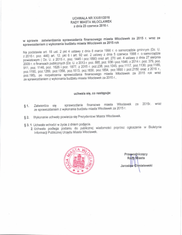 Woclawek za 2015 rok oraz o zatwierdzeniu sprawozdania z wykonania budZetu miasta
