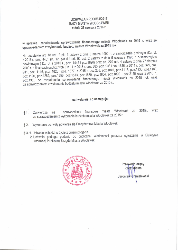Uchwała nr XXI/81/2016 Rady Miasta Włocławek