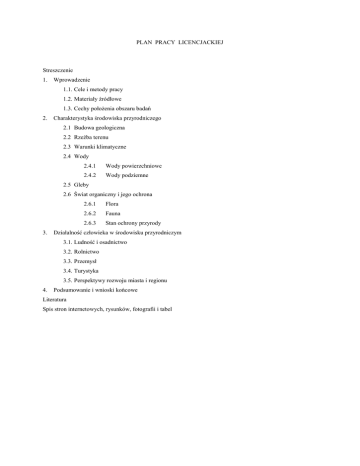 PLAN PRACY LICENCJACKIEJ Streszczenie 1. Wprowadzenie 1.1. Cele i metody pracy 1.2. Materiały źródłowe 1.3. Cechy położenia obszaru badań 2. Charakterystyka środowiska przyrodniczego 2.1 Budowa geologiczna 2.2 Rzeźba terenu 2.3 Warunki klimatyczne 2.4 Wody 2.4.1 Wody powierzchniowe 2.4.2 Wody podziemne 2.5 Gleby 2.6 Świat organiczny i jego ochrona 3. 2.6.1 Flora 2.6.2 Fauna 2.6.3 Stan ochrony przyrody Działalność człowieka w środowisku przyrodniczym 3.1. Ludność i osadnictwo 3.2. Rolnictwo 3.3. Przemysł 3.4. Turystyka 3.5. Perspektywy rozwoju miasta i regionu 4. Podsumowanie i wnioski końcowe Literatura Spis stron internetowych, rysunków, fotografii i tabel PLAN PRACY LICENCJACKIEJ Streszczenie 1. WPROWADZENIE 1.1. Cele i metody pracy 1.2. Materiały źródłowe 1.3. Cechy położenia obszaru badań 2. CHARAKTERYSTYKA ŚRODOWISKA PRZYRODNICZEGO 2.1. Budowa geologiczna 2.2. Rzeźba terenu 2.3. Warunki klimatyczne 2.4. Wody 2.4.1. Wody powierzchniowe 2.4.2. Wody podziemne 2.5. Gleby 2.6. Świat organiczny i jego ochrona 3. 2.6.1. Flora 2.6.2. Fauna 2.6.3. Stan ochrony przyrody DZIAŁALNOŚĆ CZŁOWIEKA W ŚRODOWISKU PRZYRODNICZYM 3.1. Ludność i osadnictwo 3.2. Rolnictwo 3.3. Przemysł 3.4. Turystyka 3.5. Perspektywy rozwoju miasta i regionu 4. PODSUMOWANIE I WNIOSKI KOŃCOWE Literatura Spis stron internetowych, rysunków, fotografii i tabel
