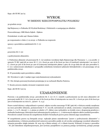 Sygn. akt III RC 50/15 WYROK W IMIENIU RZECZYPOSPOLITEJ POLSKIEJ 30 grudnia 2015r. Sąd Rejonowy w Pułtusku III Wydział Rodzinny i Nieletnich w następującym składzie: Przewodniczący: SSR Maria Dąbek - Djakon Protokolant: st.sekr.sąd. Hanna Gołota po rozpoznaniu w dniu 17.12.2015r. w Pułtusku na rozprawie sprawy z powództwa małoletnich M. C. (1) i S. C. przeciwko M. C. (2) o podwyższenie alimentów. I. Podwyższa alimenty od pozwanej M. C. (2) ustalone wyrokiem Sądu Rejonowego dla Warszawy (...).12.2008r. w sprawie VI RC 596/08 na rzecz M. C. (1) z kwot po 400 zł do kwot po 600 zł (sześćset) miesięcznie i na rzecz S. C. z kwot po 300 zł do kwot po 400 zł (czterysta) miesięcznie płatne z góry do 10-go dnia do rąk ojca powodów Ł. C. (1) z ustawowymi odsetkami w przypadku uchybienia terminowi płatności którejkolwiek z rat poczynając od 29 października 2014r. II. W pozostałej części powództwo oddala. III. Wyrokowi w pkt. I nadaje rygor natychmiastowej wykonalności. IV. Nie obciąża pozwanej kosztami przejmując je na rachunek Skarbu Państwa. V. Koszty procesu między stronami wzajemnie znosi. Sygn. akt III R C 50/15 UZASADNIENIE Pozwem z 29 października 2014r. powodowie M. C. (1) i S. C. wnieśli o podwyższenie na ich rzecz alimentów od pozwanej matki M. C. (2) z kwot po 400 zł do kwot po 800 zł miesięcznie na rzecz M. i z kwot po 300 zł do kwot po 500 zł miesięcznie na rzecz S.. /pozew - k. 2,3/. Pozew został złożony z załącznikami w postaci: odpisu wyroku zaocznego VI RC 596/08, w którym zostały zasądzone na rzecz powodów alimenty, postanowienia V. O. 101/08, zaświadczeń ze szkoły, orzeczenia o niepełnosprawności, pisma (...) w P., decyzji (...), pisma ze szkoły w P., faktur oraz rachunków za światło wraz z dyspozycją przelewu z rachunku bankowego, dziewięciu kart informacyjnych z pobytu w (...) i skróconych odpisów aktów urodzeń powodów. Powodowie zostali wezwani do uzupełnienia braków formalnych pozwu przez złożenie jego uzasadnienia. W uzupełnieniu pozwu 04 listopada 2014r. wpłynęło pismo zatytułowane "pozew o podwyższenie alimentów" z uzasadnieniem, w którym przedstawiciel ustawowy powodów podał, że od wyroku ustalającego wysokość alimentów sytuacja powodów uległa zmianie. M. uczy się w klasie szóstej, a S. w klasie trzeciej. Wskazał, iż starszy z powodów - M. jest dzieckiem niepełnosprawnym, jest żywiony pozajelitowo za pomocą pompy żywieniowej, pompa pracuje głównie w godzinach nocnych, zażywa leki, pozostaje pod stałą opieka (...) w M.. Chłopiec nosi pampersy, śpi na jednorazowych podkładach, w nocy kilkukrotnie ma zmieniane piżamy i pościel co powoduje konieczność zużywania większej ilości środków chemicznych, piorących i z tego powodu jest większe zużycie prądu. Przedstawiciel ustawowy powodów podał, że ze starszym synem często jeździ na badania do (...), zdarzają się kilkutygodniowe pobyty w szpitalu, wówczas odwiedza syna co drugi dzień, kupuje pampersy, karty do telefonów, jedzenie. Z uwagi na niewchłanianie jedzenia powód odczuwa głód i pragnienie trudne do zaspokojenia, zjada nawet trzy razy więcej niż osoba dorosła. W związku z trudną sytuacją zdrowotną, pojawiają się kłopoty wychowawcze, obaj powodowie wymagają wsparcia psychologicznego, wydatków medycznych i związanych z edukacją szkolną (atrakcje szkolne, wycieczki, płatne zajęcia logopedyczne dla młodszego z powodów- 300 zł). Ostatnie zalecenie lekarskie wskazują na wadę kręgosłupa M., konieczność wizyt u ortopedy i rehabilitanta oraz dojazd do O.. Wszystko to powoduje zwiększenie wydatków, na które nie zawsze są pieniądze. Przedstawiciel ustawowy powodów wskazał iż miesięczne koszty zakupu leków, wizyt lekarskich i u psychologa wynoszą 700 zł, dojazdy do szkoły - około 70 zł, koszty utrzymania M. - 780 zł (wyżywienie - 600 zł, ubrania - 100 zł, przyjemności i art. szkolne - 80 zł) oraz koszty utrzymania S. - 680 zł (wyżywienie 500 zł, ubrania -100 zł, wycieczki, art. szkolne i atrakcje - 80 zł). Pozostałe koszty utrzymania domu wynoszą 1.155 zł (energia, opał, szambo, podatek, gaz). Z powodu niepełnosprawności M. dokonany został remont i przebudowa pomieszczeń w taki sposób, że powstała łazienka na piętrze domu, gdyż chłopcu trudno było w nocy swobodnie poruszać się po schodach z kroplówką i korzystać z łazienki na dole. /dowód: pozew - k.64-66/ W odpowiedzi na pozew pozwana wniosła o oddalenie powództwa, zwolnienie od kosztów sądowych i ustanowienie pełnomocnika z urzędu. Uzasadniając swoje stanowisko uznała żądanie powodów za wygórowane odnośnie jego wysokości i wskazała, że nie pracuje, w związku z ciążącą na niej egzekucją komorniczą ma trudności w znalezieniu pracy, by zaspokoić potrzeby i wydatki dzieci podejmuje prace dorywcze, z których osiąga dochody nie wyższe niż 800 zł. W utrzymaniu pomaga jej rodzina. Pozwana zarzuciła przedstawicielowi ustawowemu powodów uzależnienie od alkoholu, wydawanie pieniędzy na zbędne inwestycje tj. położenie kostki brukowej we wjeździe, zamieszkiwanie z nową partnerką, niewłaściwą opiekę wobec chłopców i brak higieny. Zakwestionowała twierdzenia przedstawiciela ustawowego powodów o ich trudnej sytuacji finansowej wskazując, iż posiada on środki na utrzymanie dzieci, albowiem otrzymuje zasiłki z tytułu niepełnosprawności starszego syna, alimenty z funduszu alimentacyjnego, korzysta z pomocy opieki społecznej oraz odpłatnie świadczy usługi akwarystyczne, za które wystawia faktury, zatem powinno wystarczać na potrzeby powodów. Podała, że ona również ponosi koszty utrzymania dzieci, organizuje im wyjazdy do dziadków, wyprawia urodziny, daje prezenty na komunię, mikołajki, święta i dzień dziecka oraz rzadziej bez okazji. Pozwana nadmieniła, iż zapłaciła 40 zł ojcu powodów za przywiezienie dzieci, za 3