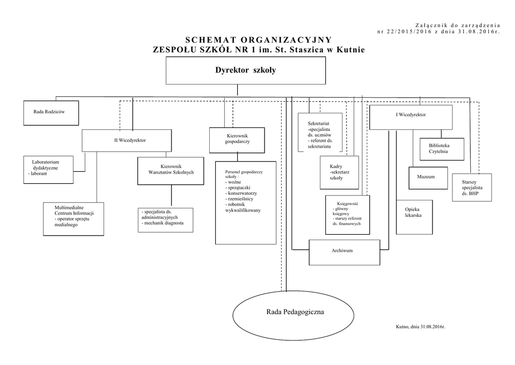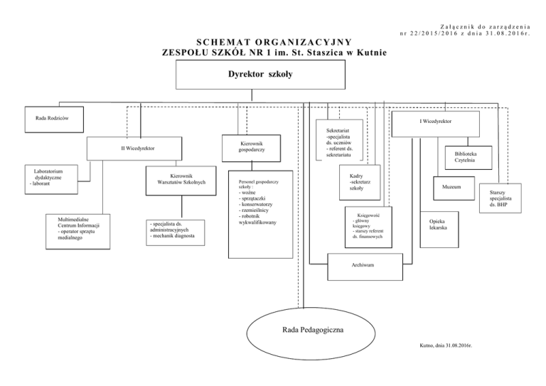 Załącznik do zarządzenia nr 22/2015/2016 z dnia 31.08.2016r. SCHEMAT ORGANIZACYJNY ZESPOŁU SZKÓŁ NR 1 im. St. Staszica w Kutnie Dyrektor szkoły Rada Rodziców I Wicedyrektor Kierownik gospodarczy II Wicedyrektor Laboratorium dydaktyczne - laborant dydaktyczny Multimedialne Centrum Informacji - operator sprzętu medialnego Kierownik Warsztatów Szkolnych - specjalista ds. administracyjnych - mechanik diagnosta Sekretariat -specjalista ds. uczniów - referent ds. sekretariatu Kadry -sekretarz szkoły Personel gospodarczy szkoły : - woźne - sprzątaczki - konserwatorzy - rzemieślnicy - robotnik wykwalifikowany Księgowość - główny księgowy - starszy referent ds. finansowych Biblioteka Czytelnia Muzeum Starszy specjalista ds. BHP Opieka lekarska Archiwum Rada Pedagogiczna Kutno, dnia 31.08.2016r.
