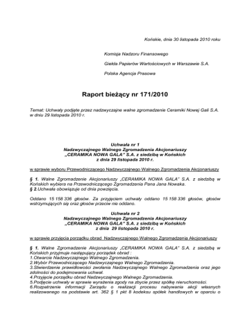 Końskie, dnia 30 listopada 2010 roku Komisja Nadzoru Finansowego Giełda Papierów Wartościowych w Warszawie S.A. Polska Agencja Prasowa Raport bieżący nr 171/2010 Temat: Uchwały podjęte przez nadzwyczajne walne zgromadzenie Ceramiki Nowej Gali S.A. w dniu 29 listopada 2010 r. Uchwała nr 1 Nadzwyczajnego Walnego Zgromadzenia Akcjonariuszy „CERAMIKA NOWA GALA” S.A. z siedzibą w Końskich z dnia 29 listopada 2010 r. w sprawie wyboru Przewodniczącego Nadzwyczajnego Walnego Zgromadzenia Akcjonariuszy § 1. Walne Zgromadzenie Akcjonariuszy „CERAMIKA NOWA GALA” S.A. z siedzibą w Końskich wybiera na Przewodniczącego Zgromadzenia Pana Jana Nowaka. § 2.Uchwała obowiązuje od dnia powzięcia. Oddano 15 158 336 głosów. Za przyjęciem uchwały oddano 15 158 336 głosów, głosów wstrzymujących się oraz głosów przeciw nie oddano. Uchwała nr 2 Nadzwyczajnego Walnego Zgromadzenia Akcjonariuszy „CERAMIKA NOWA GALA” S.A. z siedzibą w Końskich z dnia 29 listopada 2010 r. w sprawie przyjęcia porządku obrad Nadzwyczajnego Walnego Zgromadzenia Akcjonariuszy § 1. Walne Zgromadzenie Akcjonariuszy „CERAMIKA NOWA GALA” S.A. z siedzibą w Końskich przyjmuje następujący porządek obrad : 1.Otwarcie Nadzwyczajnego Walnego Zgromadzenia. 2.Wybór Przewodniczącego Nadzwyczajnego Walnego Zgromadzenia. 3.Stwierdzenie prawidłowości zwołania Nadzwyczajnego Walnego Zgromadzenia oraz jego zdolności do podejmowania uchwał. 4.Przyjęcie porządku obrad Nadzwyczajnego Walnego Zgromadzenia. 5.Podjęcie uchwały w sprawie wyrażenia zgody na zbycie przez spółkę nieruchomości. 6.Rozpatrzenie informacji Zarządu o realizacji procesu nabywania akcji własnych realizowanego na podstawie art. 362 § 1 pkt 8 kodeksu spółek handlowych w oparciu o uchwały nr 3 i 4 podjęte przez Nadzwyczajne Walne Zgromadzenie Akcjonariuszy w dniu 10 października 2008 r. 7. Zamknięcie obrad. § 2. Uchwała obowiązuje od dnia powzięcia. Oddano 15 158 346 głosów. Za przyjęciem uchwały oddano 15 158 346 głosów, głosów wstrzymujących się oraz głosów przeciw nie oddano. Uchwała nr 3 Nadzwyczajnego Walnego Zgromadzenia Akcjonariuszy „CERAMIKA NOWA GALA” S.A. z siedzibą w Końskich z dnia 29 listopada 2010 r. w sprawie wyrażenia zgody na zbycie przez spółkę nieruchomości. § 1. Walne Zgromadzenie Akcjonariuszy „CERAMIKA NOWA GALA” S.A. z siedzibą w Końskich wyraża zgodę na zbycie na rzecz Area Spółka z ograniczoną odpowiedzialnością z siedzibą w Końskich (wpisanej do Rejestru Przedsiębiorców Krajowego Rejestru Sądowego pod numerem KRS 0000217314) prawa wieczystego użytkowania nieruchomości położonej w Końskich o powierzchni 0,9262 ha, działka nr 957/62 dla której Sąd Rejonowy w Końskich prowadzi księgę wieczystą nr KI1K/00039167/6 wraz z prawem własności znajdujących się na niej budynków i budowli, za cenę nie niższą niż 3,2 mln złotych, powiększoną o podatek VAT o ile taki podatek wystąpi. § 2. Uchwała obowiązuje od dnia powzięcia. Oddano 15 158 346 głosów. Za przyjęciem uchwały oddano 15 158 346 głosów; głosów wstrzymujących się oraz głosów przeciw nie oddano. Podstawa prawna: §38 pkt 1 ust. 7 Rozporządzenie Ministra Finansów z dnia 19 lutego 2009 r. w sprawie informacji bieżących i okresowych przekazywanych przez emitentów papierów wartościowych oraz warunków uznawania za równoważne informacji wymaganych przepisami prawa państwa niebędącego państwem członkowskim strona 2