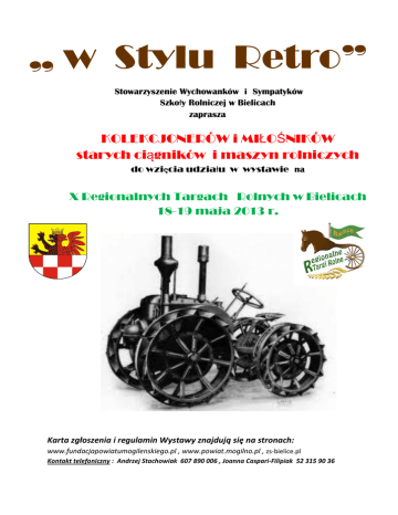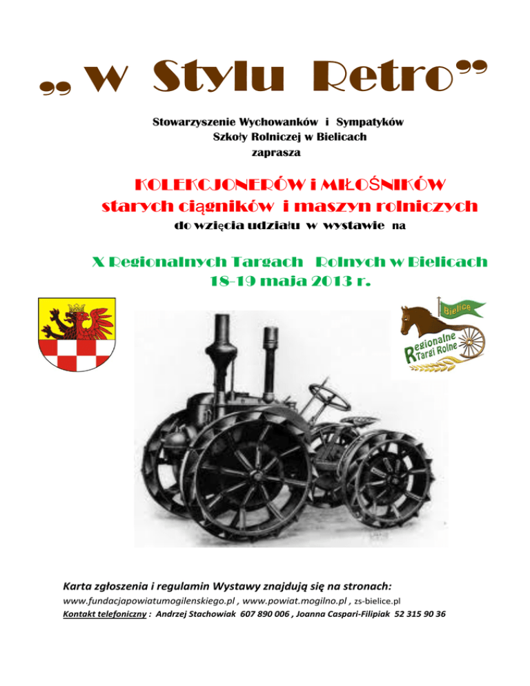 „ w Stylu Retro” Stowarzyszenie Wychowanków i Sympatyków Szkoły Rolniczej w Bielicach zaprasza KOLEKCJONERÓW i MIŁOŚNIKÓW starych ciągników i maszyn rolniczych do wzięcia udziału w wystawie na X Regionalnych Targach Rolnych w Bielicach 18-19 maja 2013 r. Karta zgłoszenia i regulamin Wystawy znajdują się na stronach: www.fundacjapowiatumogilenskiego.pl , www.powiat.mogilno.pl , zs-bielice.pl Kontakt telefoniczny : Andrzej Stachowiak 607 890 006 , Joanna Caspari-Filipiak 52 315 90 36