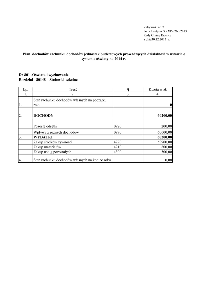 Załącznik nr 7 do uchwały nr XXXIV/260/2013 Rady Gminy Krynice z dnia30.12.2013 r. Plan dochodów rachunku dochodów jednostek budżetowych prowadzących działalność w ustawie o systemie oświaty na 2014 r. Dz 801 -Oświata i wychowanie Rozdział - 80148 – Stołówki szkolne Treść 2. Lp. 1. 1. Stan rachunku dochodów własnych na początku roku 2. DOCHODY 3. 4. § 3. Kwota w zł. 4. 0 60200,00 Pozosłe odsetki 0920 200,00 Wpływy z różnych dochodów WYDATKI Zakup środków żywności Zakup materiałów Zakup usług pozostałych 0970 60000,00 60200,00 58900,00 800,00 500,00 Stan rachunku dochodów własnych na koniec roku 4220 4210 4300 0,00