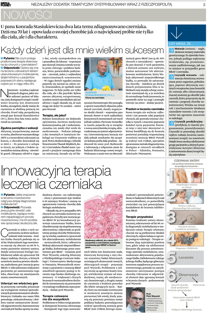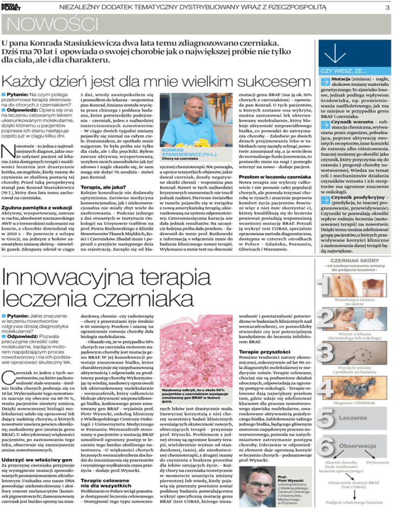 NIEZALEŻNY DODATEK TEMATYCZNY DYSTRYBUOWANY WRAZ Z RZECZPOSPOLITĄ 3 NOWOŚCI U pana Konrada Stasiukiewicza dwa lata temu zdiagnozowano czerniaka. Dziś ma 70 lat i opowiada o swojej chorobie jak o największej próbie nie tylko dla ciała, ale i dla charakteru. Każdy dzień jest dla mnie wielkim sukcesem ■ Pytanie: Na czym polega przełomowa terapia skierowana do chorych z czerniakiem? ■ Odpowiedź: Opiera się ona na leczeniu celowanym lekiem ukierunkowanym molekularnie, dzięki któremu u pacjentów poprawa ich stanu następuje często już w ciągu kilku dni. N owotwór – to jedna z najtrudniejszych diagnoz, jakie może usłyszeć pacjent od lekarza.Lista dostępnych terapii i możliwości leczenia jest drastycznie krótka, szczególnie, kiedy mamy do czynienia ze złośliwą postacią tej choroby. Przed taką perspektywą stanął pan Konrad Stasiukiewicz (70 l.), który dwa lata temu zachorował na czerniaka. Zgubna pamiątka z wakacji Aktywny, wysportowany, zawsze w ruchu, absolwent warszawskiego AWF-u z trenerskimi sukcesami na koncie, o chorobie dowiedział się w 2010 r. – Po powrocie z urlopu w Grecji, na jednym z boków zauważyłem zmianę skórną – niewielki guzek. Zdrapany odrósł w ciągu 3 dni, wtedy zaniepokoiłem się i poszedłem do lekarza – wspomina pan Konrad. Zmiana została wycięta przez chirurga i poddana badaniu, które potwierdziło podejrzenia – czerniak, jeden z najbardziej śmiercionośnych nowotworów. – W ciągu dwóch tygodni zmiany pojawiły się niemal na całym ciele. Zrozumiałem, że spotkało mnie najgorsze. To była próba nie tylko dla ciała, ale i dla psychiki. Byłem zawsze aktywny, wysportowany, uczyłem moich zawodników jak żyć zdrowo i nagle okazało się, że sam mogę nie dożyć 70. urodzin – mówi pan Konrad. Terapia, ale jaka? Kolejne konsultacje nie dodawały optymizmu. Zarówno medycyna konwencjonalna, jak i niekonwencjonalna nie miały zbyt wiele do zaoferowania. – Podczas jednego z dni otwartych w Instytucie Onkologii na Ursynowie trafiłem na prof. Piotra Rutkowskiego z Kliniki Nowotworów Tkanek Miękkich,Kości i Czerniaków. Zbadał mnie i poprosił o przyjście następnego dnia na rejestrację. Zaczęło się od kla- KONRAD STASIUKIEWICZ (70 L.) Chory na czerniaka sycznej chemioterapii.Nie pomogło, a oprócz wszystkich objawów, jakie dawał czerniak, doszły negatywne skutki chemii – wspomina pan Konrad. Nawet w tych najbardziej kryzysowych momentach nie tracił jednak nadziei. Pierwsze światełko w tunelu pojawiło się w związku z nową amerykańską terapią, ukierunkowaną na system odpornościowy. Czteromiesięczna kuracja nie dała jednak rezultatów. Na szczęście kolejna próba dała przełom. – Zadzwonił do mnie prof. Rutkowski z informacją o włączeniu mnie do badania klinicznego nowej terapii. Wykonano u mnie test na obecność mutacji genu BRAF (ma ją ok. 50% chorych z czerniakiem) – opowiada pan Konrad. U tych pacjentów, u których zostanie ona wykryta, można zastosować lek ukierunkowany molekularnie, który blokuje aktywność nieprawidłowego białka, co prowadzi do zatrzymania choroby. – Zaledwie po dwóch dniach przyjmowania leku w tabletkach rany zaczęły schnąć,nowotwór zmniejszał się, a ja wróciłem do normalnego funkcjonowania, to postawiło mnie na nogi i pomogło wierzyć na nowo – dodaje pacjent. Przełom w leczeniu czerniaka Nowa terapia nie wyleczy całkowicie i nie pomoże całej populacji chorych, ale pozwala trzymać chorobę w ryzach i znacznie poprawia komfort życia pacjentów. Powinni więc z niej móc skorzystać ci, którzy kwalifikują się do leczenia ponieważ posiadają wspomnianą wcześniej mutację BRAF. Potrafi ją wykryć test COBAS, specjalnie opracowana metoda diagnostyczna, dostępna w czterech ośrodkach w Polsce – Gdańsku, Poznaniu, Gliwicach i Warszawie. C zerniak to jeden z tych nowotworów,na które zachorowalność stale wzrasta – średnio liczba chorych podwaja się co 10 lat.Wyleczalność tego nowotworu szacuje się obecnie na 60-70 %, reszta pacjentów niestety umiera. Dzięki nowoczesnej biologii molekularnej udało się opracować lek dający nadzieję chorym, u których nowotwór zawiera pewien określony, uszkodzony gen (mutacja genu BRAF). U zdecydowanej większości pacjentów, po zastosowaniu tego leku, obserwuje się zmniejszenie zmian nowotworowych. Uderzyć we właściwy gen Za przyczynę czerniaka przyjmuje się wystąpienie mutacji spowodowanych promieniowaniem ultrafioletowym. Uszkadza ono nasze DNA powodując niekontrolowany i złośliwy rozrost melanocytów (komórek pigmentowych).Zaawansowany czerniak jest bardzo oporny na stan- dardową chemio- czy radioterapię – chory z przerzutami żyje średnio 6-10 miesięcy. Przełom i szansę na ograniczenie rozwoju choroby dała biologia molekularna. – Okazało się, że w przypadku 50% chorych na czerniaka motorem napędowym choroby jest mutacja genu BRAF. W jej konsekwencji powstaje zmutowane białko, które charakteryzuje się niepohamowaną aktywnością i odpowiada za gwałtowny postęp choroby.Wykorzystując tę wiedzę, naukowcy opracowali lek ukierunkowany molekularnie – wemurafenib, który całkowicie blokuje aktywność nieprawidłowego białka, kodowanego przez zmutowany gen BRAF – wyjaśnia prof. Piotr Wysocki, onkolog kliniczny z Wielkopolskiego Centrum Onkologii i Uniwersytetu Medycznego w Poznaniu. Wemurafenib stosowany u pacjentów z mutacją BRAF umożliwił ogromny postęp w leczeniu tego bardzo złośliwego nowotworu. –U większości chorych leczonych wemurafenibem dochodzi do zmniejszenia się przerzutów i wyraźnego wydłużenia czasu przeżycia – dodaje prof. Wysocki. Terapie celowane nie dla wszystkich Problemem w Polsce wciąż pozostaje dostępność leczenia celowanego. – Dostępność tego typu nowoczes- - od zaobserwowania zmiany do podjęcia leczenia - Terapie przyszłości nych leków jest drastycznie mała.