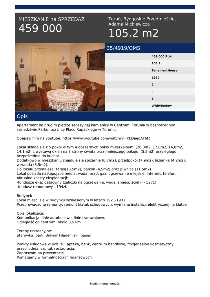 Toruń, Bydgoskie Przedmieście, Adama Mickiewicza MIESZKANIE na SPRZEDAŻ 459 000 105.2 m2 35/4919/OMS 459 000 PLN 105.2 TenementHouse 1920 2 4 5 WithWindow Opis Apartament na drugim piętrze secesyjnej kamienicy w Centrum Torunia w bezpośrednim sąsiedztwie Parku, tuż przy Placu Rapackiego w Toruniu. Obejrzyj film na youtube: https://www.youtube.com/watch?v=KkDaeqAF6tc Lokal składa się z 5 pokoi w tym 4 obszernych pokoi mieszkalnymi (26,3m2, 17,8m2, 14,8m2, 14,1m2) z wystawą okien na 3 strony świata oraz mniejszego pokoju (5,2m2) przyległego bezpośrednio do kuchni. Dodatkowo w mieszkaniu znajduje się spiżarnia (0,7m2), przedpokój (7,9m2), łazianka (4,2m2), weranda (3,5m2). Do lokalu przynależą: taras(10,5m2), balkon (4,5m2) oraz piwnica (11,5m2). Lokal posiada następujące media: woda, prąd, gaz, ogrzewanie miejskie, internet, telefon. Aktualne koszty eksploatacji: -fundusze eksploatacyjny (zaliczki na ogrzewanie, wodę, śmieci, ścieki) - 527zł -fundusz remontowy - 194zł. Budynek Lokal mieści się w budynku wzniesionym w latach 1921-1931. Przeprowadzone remonty: remont klatek schodowych, wymiana instalacji elektrycznej na klatce. Opis lokalizacji: Komunikacja: linie autobusowe, linie tramwajowe. Odległość od centrum: około 0,5 km. Tereny rekreacyjne: Starówka, park, Bulwar Filadelfijski, basen. Punkty usługowe w pobliżu: apteka, bank, centrum handlowe, fryzjer,salon kosmetyczny, przychodnia, szpital, restauracja. Zapraszam na prezentację. Pomagamy w formalnościach finansowych. Studio Nieruchomości tel. 502 908 722 email: [email protected] Studio Nieruchomości Powered by TCPDF (www.tcpdf.org)