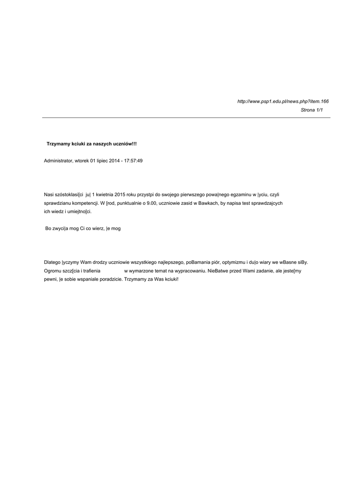 http://www.psp1.edu.pl/news.php?item.166 Strona 1/1 Trzymamy kciuki za naszych uczniów!!! Administrator, wtorek 01 lipiec 2014 - 17:57:49 Nasi szóstoklasi[ci ju| 1 kwietnia 2015 roku przystpi do swojego pierwszego powa|nego egzaminu w |yciu, czyli sprawdzianu kompetencji. W [rod, punktualnie o 9.00, uczniowie zasid w Bawkach, by napisa test sprawdzajcych ich wiedz i umiejtno[ci. Bo zwyci|a mog Ci co wierz, |e mog Dlatego |yczymy Wam drodzy uczniowie wszystkiego najlepszego, poBamania piór, optymizmu i du|o wiary we wBasne siBy. Ogromu szcz[cia i trafienia w wymarzone temat na wypracowaniu. NieBatwe przed Wami zadanie, ale jeste[my pewni, |e sobie wspaniale poradzicie. Trzymamy za Was kciuki!