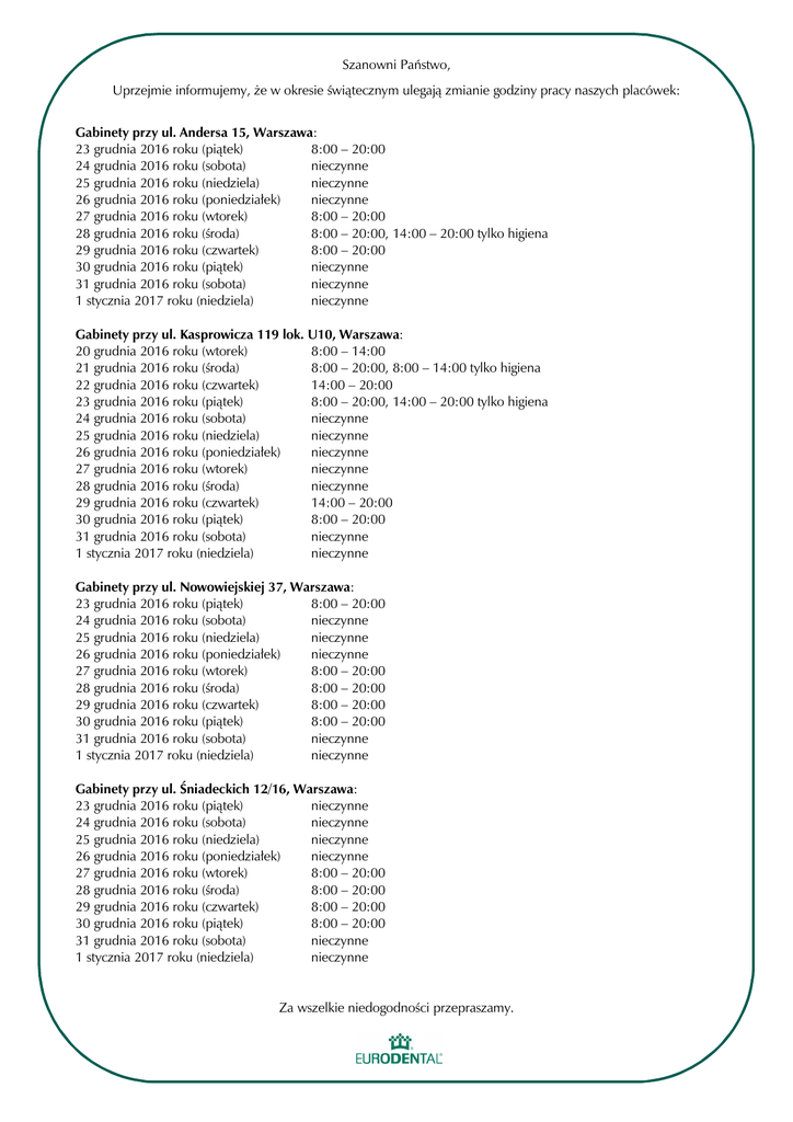 Szanowni Państwo, Uprzejmie informujemy, że w okresie świątecznym ulegają zmianie godziny pracy naszych placówek: Gabinety przy ul. Andersa 15, Warszawa: 23 grudnia 2016 roku (piątek) 8:00 – 20:00 24 grudnia 2016 roku (sobota) nieczynne 25 grudnia 2016 roku (niedziela) nieczynne 26 grudnia 2016 roku (poniedziałek) nieczynne 27 grudnia 2016 roku (wtorek) 8:00 – 20:00 28 grudnia 2016 roku (środa) 8:00 – 20:00, 14:00 – 20:00 tylko higiena 29 grudnia 2016 roku (czwartek) 8:00 – 20:00 30 grudnia 2016 roku (piątek) nieczynne 31 grudnia 2016 roku (sobota) nieczynne 1 stycznia 2017 roku (niedziela) nieczynne Gabinety przy ul. Kasprowicza 119 lok. U10, Warszawa: 20 grudnia 2016 roku (wtorek) 8:00 – 14:00 21 grudnia 2016 roku (środa) 8:00 – 20:00, 8:00 – 14:00 tylko higiena 22 grudnia 2016 roku (czwartek) 14:00 – 20:00 23 grudnia 2016 roku (piątek) 8:00 – 20:00, 14:00 – 20:00 tylko higiena 24 grudnia 2016 roku (sobota) nieczynne 25 grudnia 2016 roku (niedziela) nieczynne 26 grudnia 2016 roku (poniedziałek) nieczynne 27 grudnia 2016 roku (wtorek) nieczynne 28 grudnia 2016 roku (środa) nieczynne 29 grudnia 2016 roku (czwartek) 14:00 – 20:00 30 grudnia 2016 roku (piątek) 8:00 – 20:00 31 grudnia 2016 roku (sobota) nieczynne 1 stycznia 2017 roku (niedziela) nieczynne Gabinety przy ul. Nowowiejskiej 37, Warszawa: 23 grudnia 2016 roku (piątek) 8:00 – 20:00 24 grudnia 2016 roku (sobota) nieczynne 25 grudnia 2016 roku (niedziela) nieczynne 26 grudnia 2016 roku (poniedziałek) nieczynne 27 grudnia 2016 roku (wtorek) 8:00 – 20:00 28 grudnia 2016 roku (środa) 8:00 – 20:00 29 grudnia 2016 roku (czwartek) 8:00 – 20:00 30 grudnia 2016 roku (piątek) 8:00 – 20:00 31 grudnia 2016 roku (sobota) nieczynne 1 stycznia 2017 roku (niedziela) nieczynne Gabinety przy ul. Śniadeckich 12/16, Warszawa: 23 grudnia 2016 roku (piątek) nieczynne 24 grudnia 2016 roku (sobota) nieczynne 25 grudnia 2016 roku (niedziela) nieczynne 26 grudnia 2016 roku (poniedziałek) nieczynne 27 grudnia 2016 roku (wtorek) 8:00 – 20:00 28 grudnia 2016 roku (środa) 8:00 – 20:00 29 grudnia 2016 roku (czwartek) 8:00 – 20:00 30 grudnia 2016 roku (piątek) 8:00 – 20:00 31 grudnia 2016 roku (sobota) nieczynne 1 stycznia 2017 roku (niedziela) nieczynne Za wszelkie niedogodności przepraszamy.