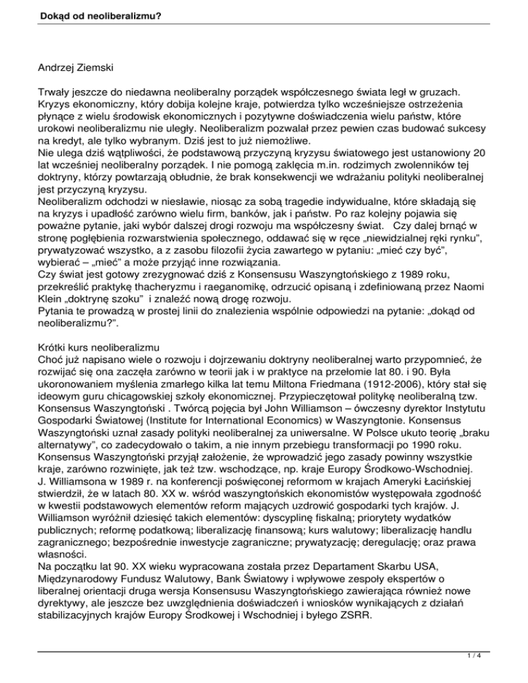 Dokąd od neoliberalizmu? Andrzej Ziemski Trwały jeszcze do niedawna neoliberalny porządek współczesnego świata legł w gruzach. Kryzys ekonomiczny, który dobija kolejne kraje, potwierdza tylko wcześniejsze ostrzeżenia płynące z wielu środowisk ekonomicznych i pozytywne doświadczenia wielu państw, które urokowi neoliberalizmu nie uległy. Neoliberalizm pozwalał przez pewien czas budować sukcesy na kredyt, ale tylko wybranym. Dziś jest to już niemożliwe. Nie ulega dziś wątpliwości, że podstawową przyczyną kryzysu światowego jest ustanowiony 20 lat wcześniej neoliberalny porządek. I nie pomogą zaklęcia m.in. rodzimych zwolenników tej doktryny, którzy powtarzają obłudnie, że brak konsekwencji we wdrażaniu polityki neoliberalnej jest przyczyną kryzysu. Neoliberalizm odchodzi w niesławie, niosąc za sobą tragedie indywidualne, które składają się na kryzys i upadłość zarówno wielu firm, banków, jak i państw. Po raz kolejny pojawia się poważne pytanie, jaki wybór dalszej drogi rozwoju ma współczesny świat. Czy dalej brnąć w stronę pogłębienia rozwarstwienia społecznego, oddawać się w ręce „niewidzialnej ręki rynku”, prywatyzować wszystko, a z zasobu filozofii życia zawartego w pytaniu: „mieć czy być”, wybierać – „mieć” a może przyjąć inne rozwiązania. Czy świat jest gotowy zrezygnować dziś z Konsensusu Waszyngtońskiego z 1989 roku, przekreślić praktykę thacheryzmu i raeganomikę, odrzucić opisaną i zdefiniowaną przez Naomi Klein „doktrynę szoku” i znaleźć nową drogę rozwoju. Pytania te prowadzą w prostej linii do znalezienia wspólnie odpowiedzi na pytanie: „dokąd od neoliberalizmu?”. Krótki kurs neoliberalizmu Choć już napisano wiele o rozwoju i dojrzewaniu doktryny neoliberalnej warto przypomnieć, że rozwijać się ona zaczęła zarówno w teorii jak i w praktyce na przełomie lat 80. i 90. Była ukoronowaniem myślenia zmarłego kilka lat temu Miltona Friedmana (1912-2006), który stał się ideowym guru chicagowskiej szkoły ekonomicznej. Przypieczętował politykę neoliberalną tzw. Konsensus Waszyngtoński . Twórcą pojęcia był John Williamson – ówczesny dyrektor Instytutu Gospodarki Światowej (Institute for International Economics) w Waszyngtonie. Konsensus Waszyngtoński uznał zasady polityki neoliberalnej za uniwersalne. W Polsce ukuto teorię „braku alternatywy”, co zadecydowało o takim, a nie innym przebiegu transformacji po 1990 roku. Konsensus Waszyngtoński przyjął założenie, że wprowadzić jego zasady powinny wszystkie kraje, zarówno rozwinięte, jak też tzw. wschodzące, np. kraje Europy Środkowo-Wschodniej. J. Williamsona w 1989 r. na konferencji poświęconej reformom w krajach Ameryki Łacińskiej stwierdził, że w latach 80. XX w. wśród waszyngtońskich ekonomistów występowała zgodność w kwestii podstawowych elementów reform mających uzdrowić gospodarki tych krajów. J. Williamson wyróżnił dziesięć takich elementów: dyscyplinę fiskalną; priorytety wydatków publicznych; reformę podatkową; liberalizację finansową; kurs walutowy; liberalizację handlu zagranicznego; bezpośrednie inwestycje zagraniczne; prywatyzację; deregulację; oraz prawa własności. Na początku lat 90. XX wieku wypracowana została przez Departament Skarbu USA, Międzynarodowy Fundusz Walutowy, Bank Światowy i wpływowe zespoły ekspertów o liberalnej orientacji druga wersja Konsensusu Waszyngtońskiego zawierająca również nowe dyrektywy, ale jeszcze bez uwzględnienia doświadczeń i wniosków wynikających z działań stabilizacyjnych krajów Europy Środkowej i Wschodniej i byłego ZSRR. 1/4 Dokąd od neoliberalizmu? Konsensus Waszyngtoński spowodował wymuszenie przez MFW na państwach-dłużnikach, oraz niektórych b. państwach socjalistycznych wchodzących w sferę gospodarki rynkowej stosowania swoich zasad (nie przyjęły go Chiny, a po 1995 roku odrzuciła Rosja). Niedostosowanie się do tej polityki groziło nieotrzymaniem niezbędnych na rozwój kredytów. W Polsce mieliśmy w związku z tym do czynienia z tzw. terapią szokową zastosowaną przez ekipę gospodarczą Leszka Balcerowicza. W warunkach liberalnej polityki ekonomicznej – pisał prof. Paweł Bożyk , obrót finansowy uznany został jako ważny czynnik tworzenia dochodu narodowego. Zaliczony został bowiem do usług finansowych, te zaś zgodnie z obowiązującymi zasadami liczenia produktu krajowego – odgrywają najważniejszą rolę w jego pomnażaniu. Wszystko to doprowadziło do nieprawdopodobnej rozbudowy sektora bankowego i nadania bankom komercyjnym statusu niezależności. Proces ten, jak i towarzyszące mu konsekwencje na rynkach finansowych doprowadziły do gigantycznych nadużyć w systemach bankowych. Jego konsekwencje, jako wynik otwartości w ramach globalizacji tych rynków, odczuwamy jako nieznośny kryzys od kilku lat. Objął on przede wszystkim USA, które pierwsze zastosowały wskazania neoliberalne, a w konsekwencji wszystkie rynki i kraje powiązane z rynkiem amerykańskim. Trzeba jednak zaznaczyć, że o ile, bez wątpienia, pierwotną przyczyną dzisiejszej sytuacji jest doktryna neoliberalna i jej powszechne zastosowanie, o tyle patologie systemów bankowych i inne konsekwencje, to już przyczyny wtórne. Okazało się w praktyce, że nie jest prawdziwa oficjalna wersja historii Miltona Friedmana i jego zwolenników, mówiąca, że triumf kapitalizmu w wersji neoliberalnej jest owocem wolności, natomiast nieskrępowany wolny rynek idzie w parze z demokracją. Jest absolutnie odwrotnie. Wszędzie, gdzie zatryumfował neoliberalizm, towarzyszyły mu różne formy przemocy . Świat w okresie przejściowym John Williamson w wywiadzie udzielonym w maju 2010 roku „Gazecie Wyborczej” na pytanie: czy dziś napisałby „Konsensus waszyngtoński” inaczej niż w 1989 r. odpowiedział następująco: - Parę rzeczy bym zmienił. Napisałbym 