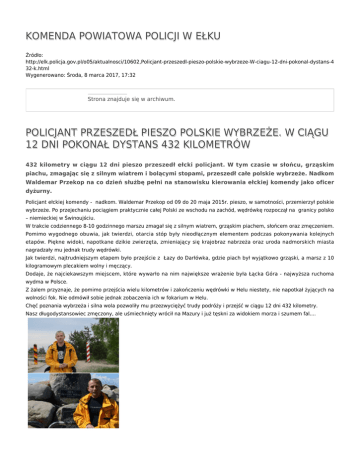 KOMENDA POWIATOWA POLICJI W EŁKU Źródło: http://elk.policja.gov.pl/o05/aktualnosci/10602,Policjant-przeszedl-pieszo-polskie-wybrzeze-W-ciagu-12-dni-pokonal-dystans-4 32-k.html Wygenerowano: Środa, 8 marca 2017, 17:32 Strona znajduje się w archiwum. POLICJANT PRZESZEDŁ PIESZO POLSKIE WYBRZEŻE. W CIĄGU 12 DNI POKONAŁ DYSTANS 432 KILOMETRÓW 432 kilometry w ciągu 12 dni pieszo przeszedł ełcki policjant. W tym czasie w słońcu, grząskim piachu, zmagając się z silnym wiatrem i bolącymi stopami, przeszedł całe polskie wybrzeże. Nadkom Waldemar Przekop na co dzień służbę pełni na stanowisku kierowania ełckiej komendy jako oficer dyżurny. Policjant ełckiej komendy - nadkom. Waldemar Przekop od 09 do 20 maja 2015r. pieszo, w samotności, przemierzył polskie wybrzeże. Po przejechaniu pociągiem praktycznie całej Polski ze wschodu na zachód, wędrówkę rozpoczął na granicy polsko – niemieckiej w Świnoujściu. W trakcie codziennego 8-10 godzinnego marszu zmagał się z silnym wiatrem, grząskim piachem, słońcem oraz zmęczeniem. Pomimo wygodnego obuwia, jak twierdzi, otarcia stóp były nieodłącznym elementem podczas pokonywania kolejnych etapów. Piękne widoki, napotkane dzikie zwierzęta, zmieniający się krajobraz nabrzeża oraz uroda nadmorskich miasta nagradzały mu jednak trudy wędrówki. Jak twierdzi, najtrudniejszym etapem było przejście z Łazy do Darłówka, gdzie piach był wyjątkowo grząski, a marsz z 10 kilogramowym plecakiem wolny i męczący. Dodaje, że najciekawszym miejscem, które wywarło na nim największe wrażenie była Łącka Góra - najwyższa ruchoma wydma w Polsce. Z żalem przyznaje, że pomimo przejścia wielu kilometrów i zakończeniu wędrówki w Helu niestety, nie napotkał żyjących na wolności fok. Nie odmówił sobie jednak zobaczenia ich w fokarium w Helu. Chęć poznania wybrzeża i silna wola pozwoliły mu przezwyciężyć trudy podróży i przejść w ciągu 12 dni 432 kilometry. Nasz długodystansowiec zmęczony, ale uśmiechnięty wrócił na Mazury i już tęskni za widokiem morza i szumem fal.... Ocena: 0/5 (0) Tweetnij