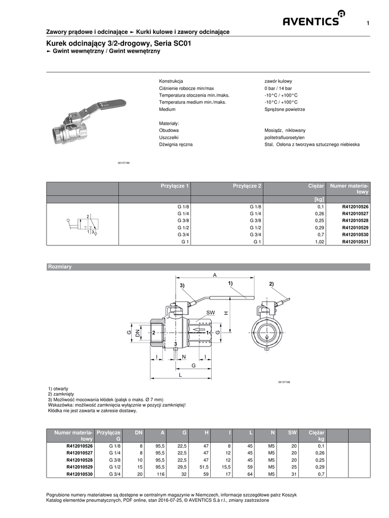 1 Zawory prądowe i odcinające ► Kurki kulowe i zawory odcinające Kurek odcinający 3/2-drogowy, Seria SC01 ► Gwint wewnętrzny / Gwint wewnętrzny Konstrukcja zawór kulowy Ciśnienie robocze min/max 0 bar / 14 bar Temperatura otoczenia min./maks. -10°C / +100°C Temperatura medium min./maks. -10°C / +100°C Medium Sprężone powietrze Materiały: Obudowa Mosiądz, niklowany Uszczelki politetrafluoroetylen Dźwignia ręczna Stal, Osłona z tworzywa sztucznego niebieska 00137189 Przyłącze 1 Przyłącze 2 Ciężar G 1/8 G 1/8 0,1 R412010526 G 1/4 G 1/4 0,26 R412010527 G 3/8 G 3/8 0,25 R412010528 G 1/2 G 1/2 0,29 R412010529 G 3/4 G 3/4 0,7 R412010530 G1 G1 1,02 R412010531 [kg] Rozmiary A 1) 2 1 G G DN SW 2) H 3) 3 I N I G L 00137188 1) otwarty 2) zamknięty 3) Możliwość mocowania kłódek (pałąk o maks. Ø 7 mm) Wskazówka: możliwość zamknięcia wyłącznie w pozycji zamkniętej! Kłódka nie jest zawarta w zakresie dostawy. Numer materia- Przyłącze łowy G DN A G H I L N SW Ciężar kg R412010526 G 1/8 8 95,5 22,5 47 8 45 M5 20 R412010527 G 1/4 8 95,5 22,5 47 12 45 M5 20 0,26 R412010528 G 3/8 10 95,5 22,5 47 12 45 M5 20 0,25 R412010529 G 1/2 15 95,5 29,5 51,5 15,5 59 M5 25 0,29 R412010530 G 3/4 20 116 32 59 17 64 M5 31 0,7 Pogrubione numery materiałowe są dostępne w centralnym magazynie w Niemczech, informacje szczegółowe patrz Koszyk Katalog elementów pneumatycznych, PDF online, stan 2016-07-25, © AVENTICS S.à r.l., zmiany zastrzeżone 0,1 Numer materiałowy 2 Zawory prądowe i odcinające ► Kurki kulowe i zawory odcinające Kurek odcinający 3/2-drogowy, Seria SC01 ► Gwint wewnętrzny / Gwint wewnętrzny Numer materia- Przyłącze łowy G DN A G H I L N SW Ciężar kg G1 25 116 40,5 63 21 81 M5 40 1,02 R412010531 Pogrubione numery materiałowe są dostępne w centralnym magazynie w Niemczech, informacje szczegółowe patrz Koszyk Katalog elementów pneumatycznych, PDF online, stan 2016-07-25, © AVENTICS S.à r.l., zmiany zastrzeżone